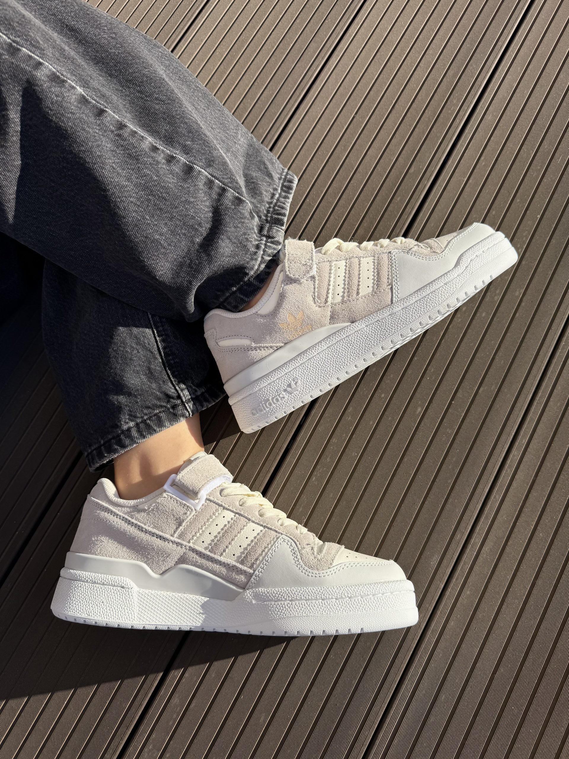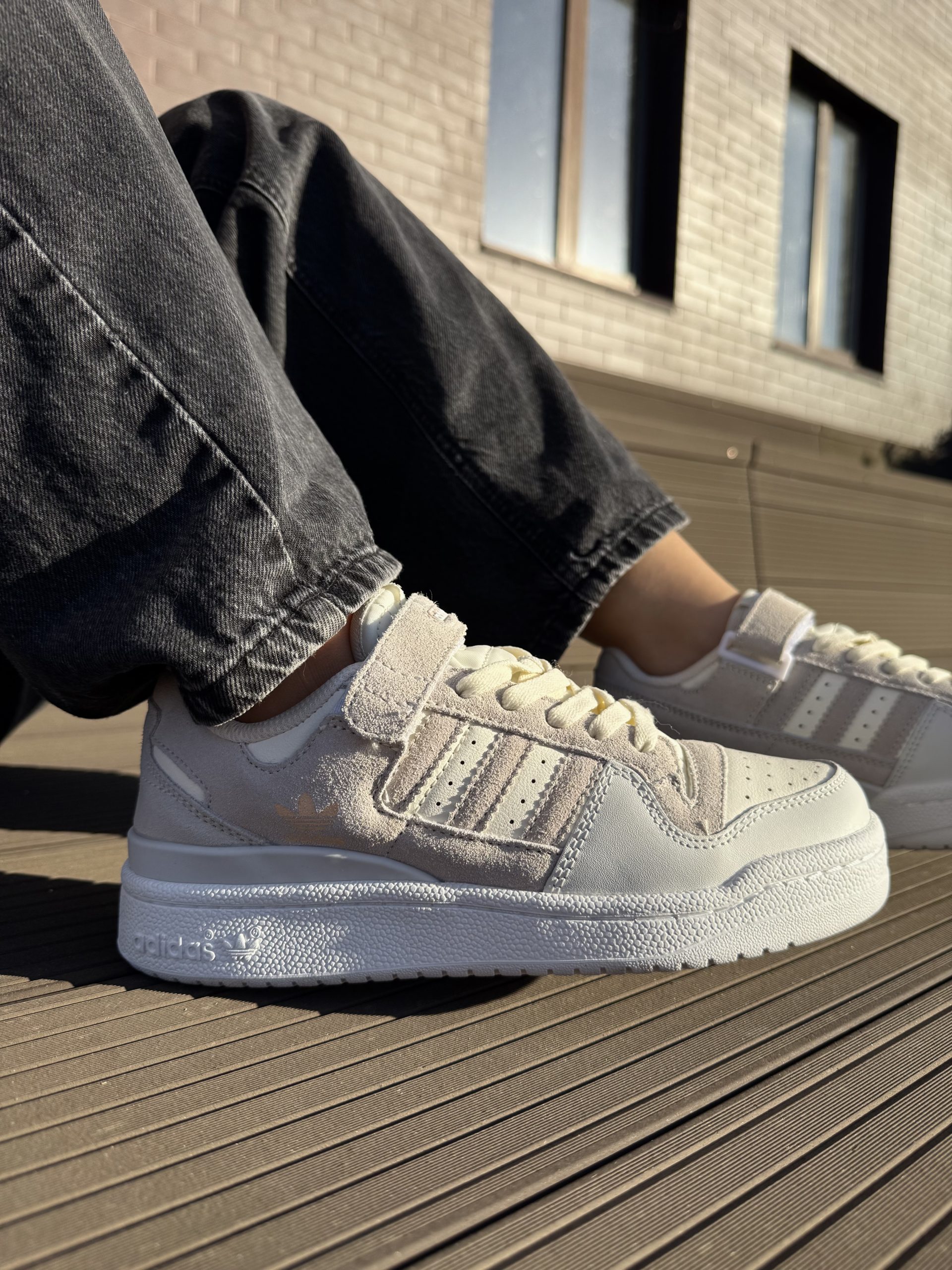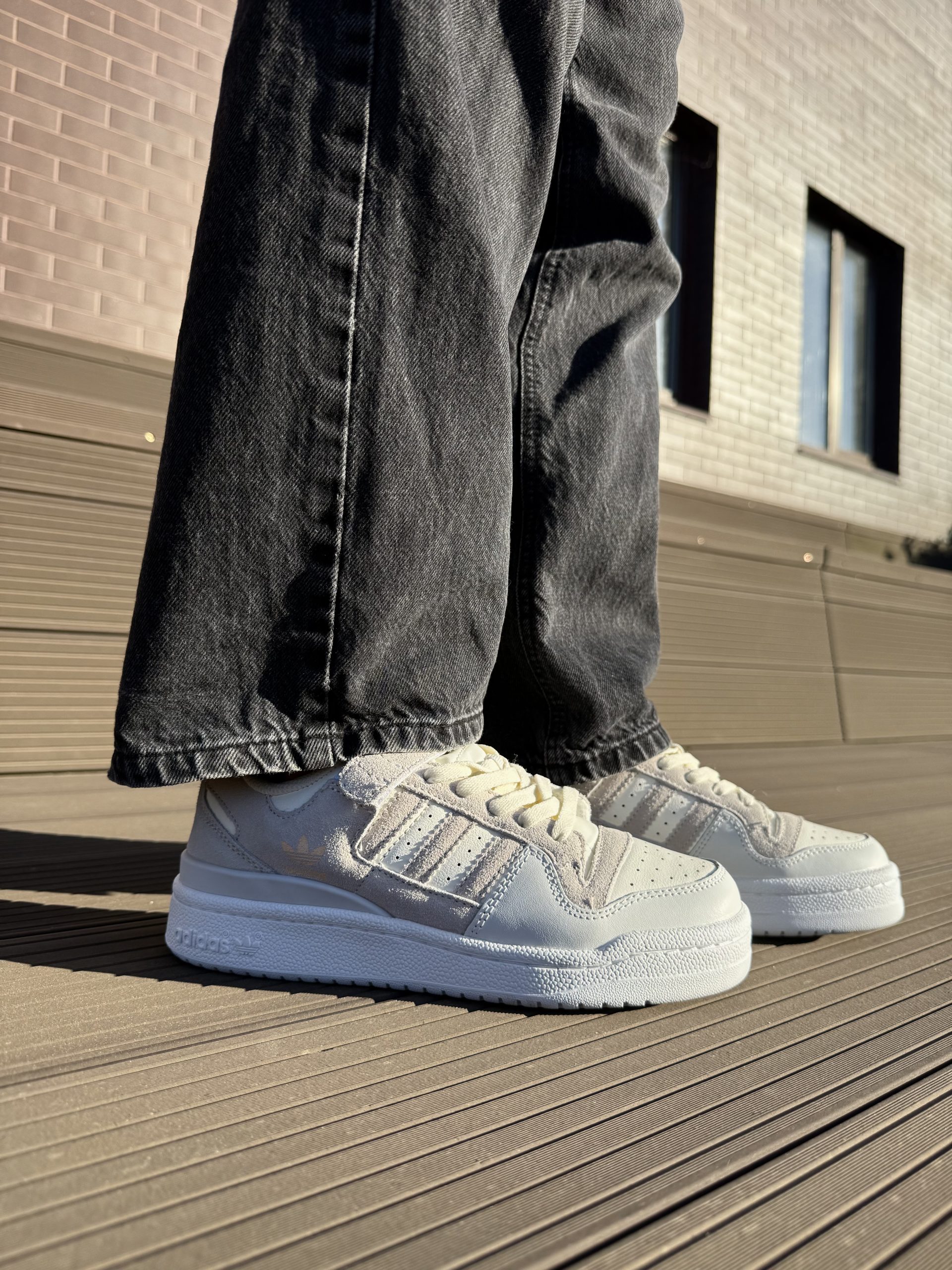 Adidas Forum Low Grey Beige White — стильна модель у поєднанні сірого, бежевого та білого кольорів, що вирізняється комфортом, м’якістю та впізнаваним ретро-силуетом.