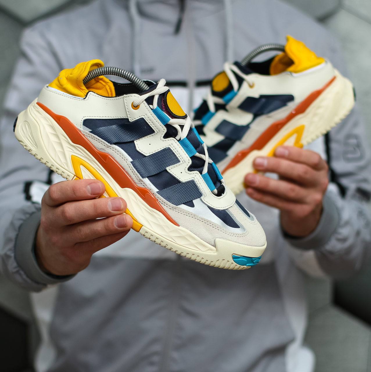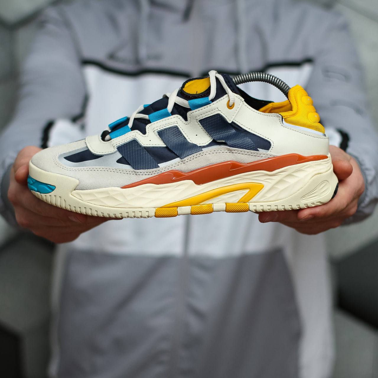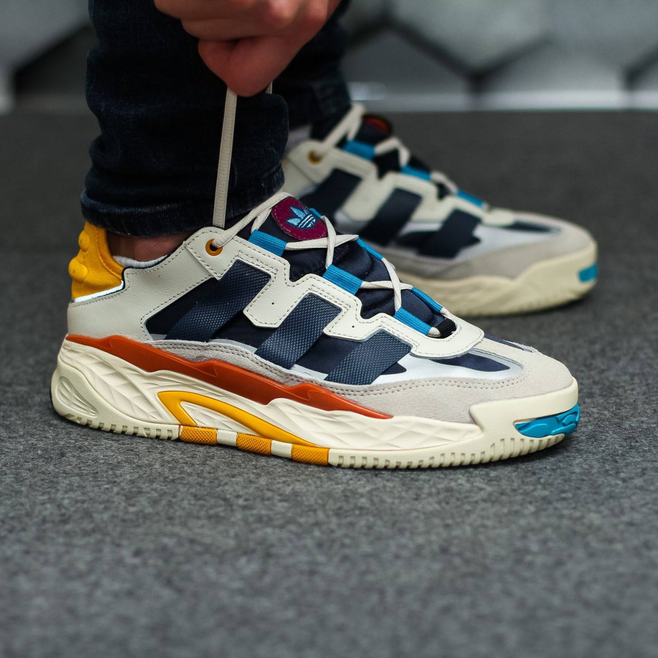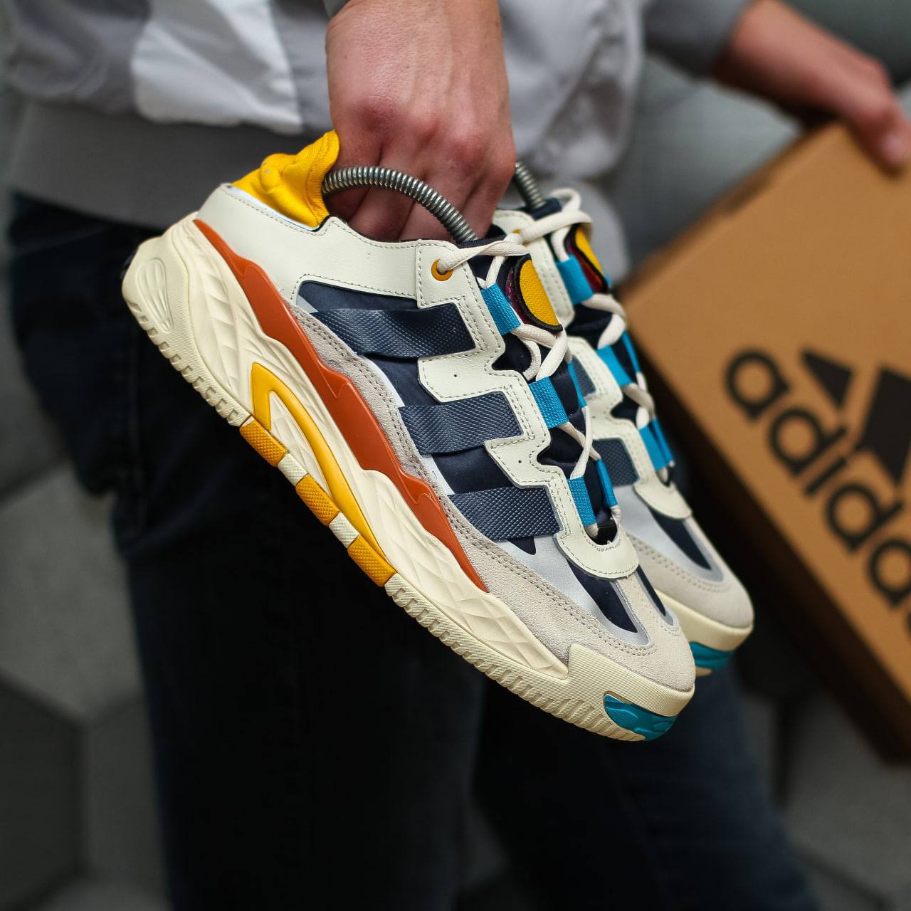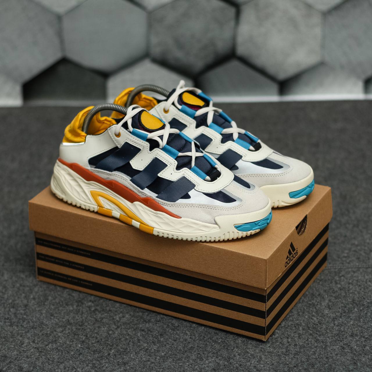 Adidas Niteball Cream White Collegiate Navy — масивна модель у поєднанні кремового, білого та темно-синього кольорів з баскетбольним силуетом, що поєднує контрастний вигляд, комфортну посадку та сучасний повсякденний стиль.