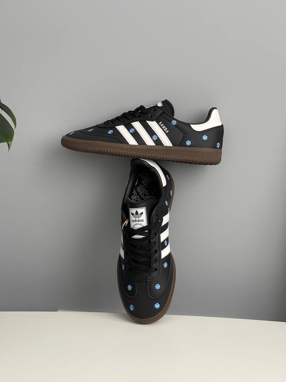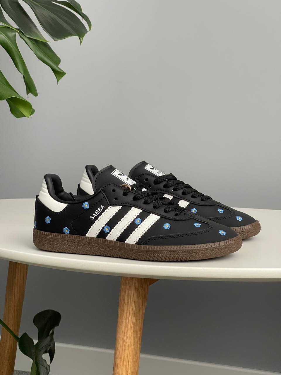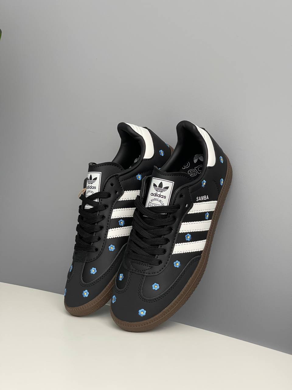 Adidas Samba Black Floral Embroidery— класика з жіночним акцентом: елегантне поєднання чорного шкіряного верху з витонченими квітковими вишивками.