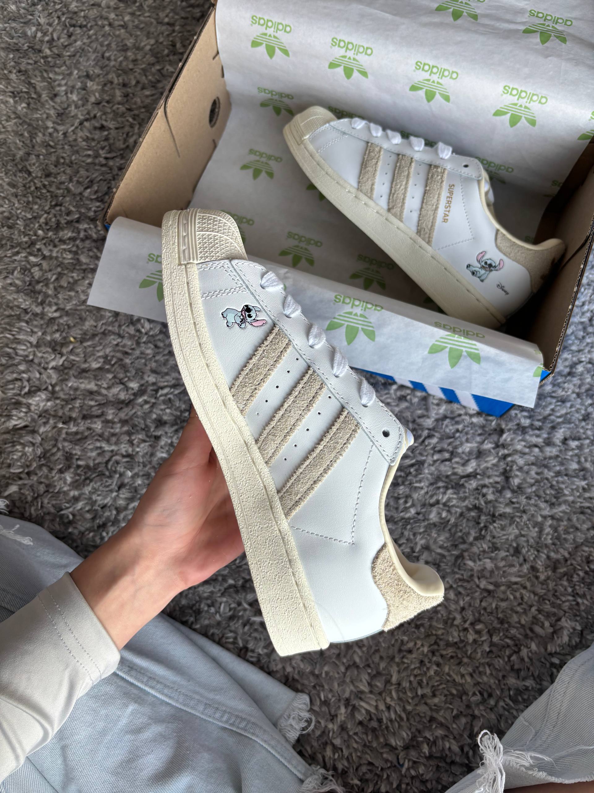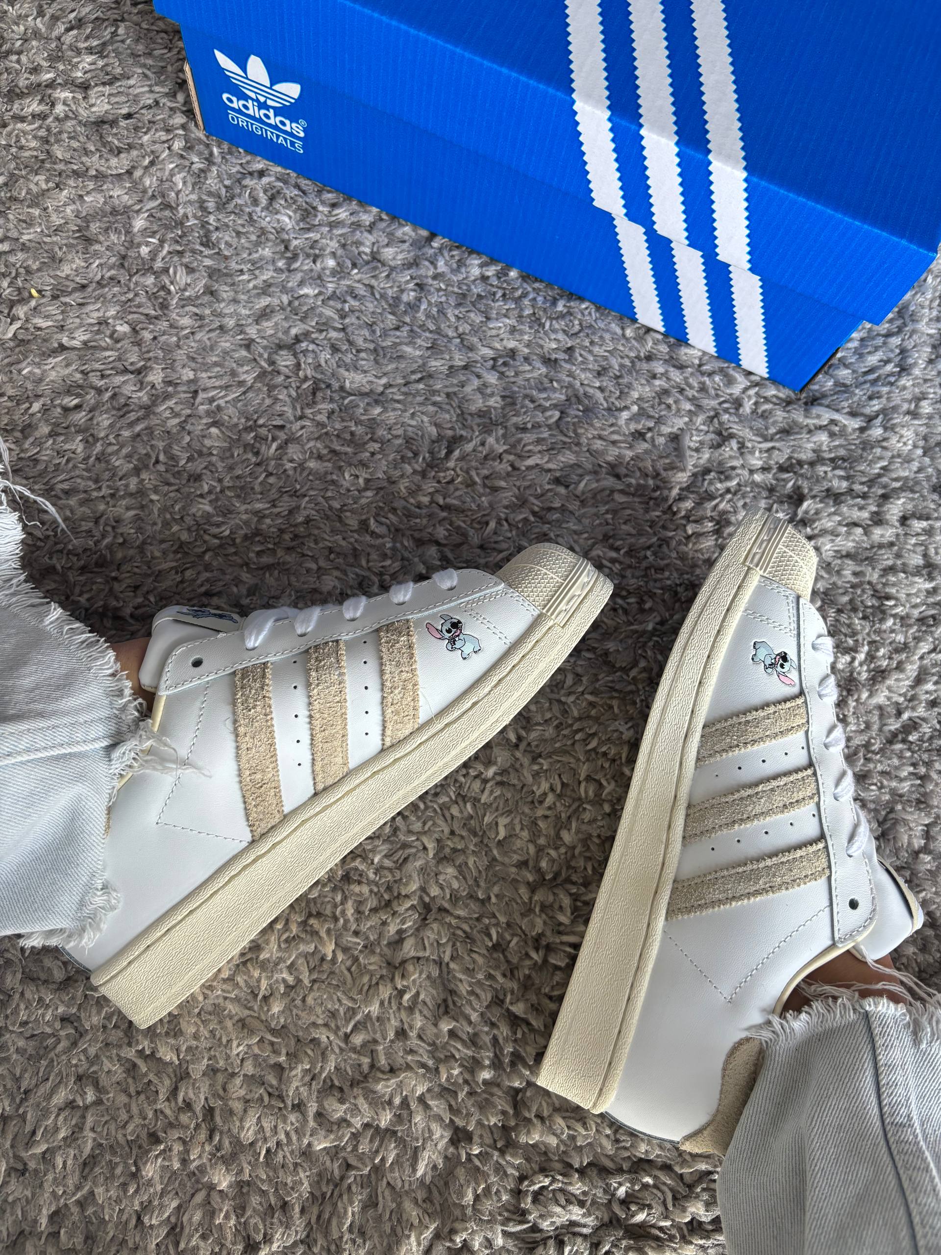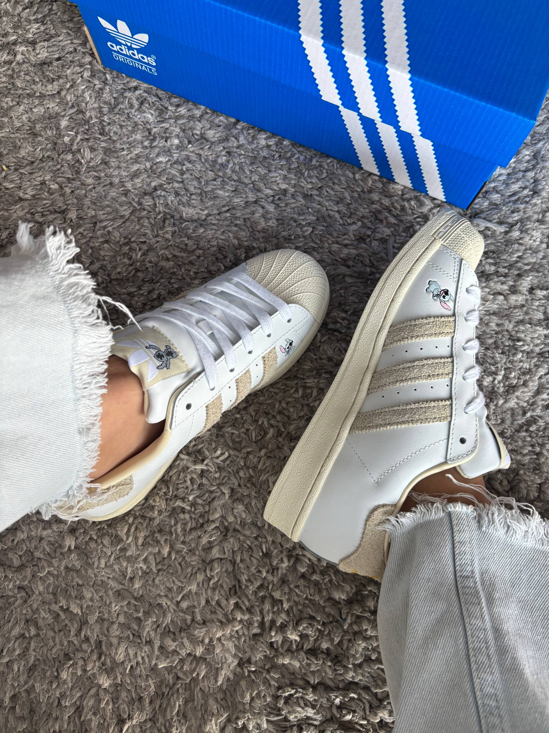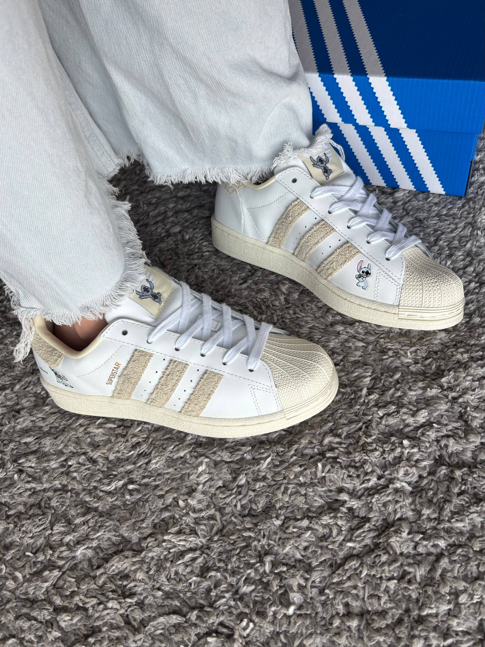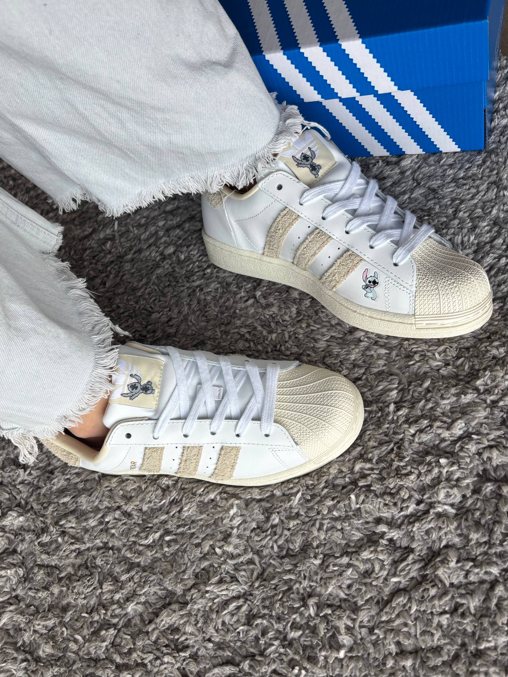 Adidas Superstar Cloud White Disney Stitch — яскрава та модель з тематичними деталями, що поєднує культовий силует, комфорт і веселий характер колаборації.