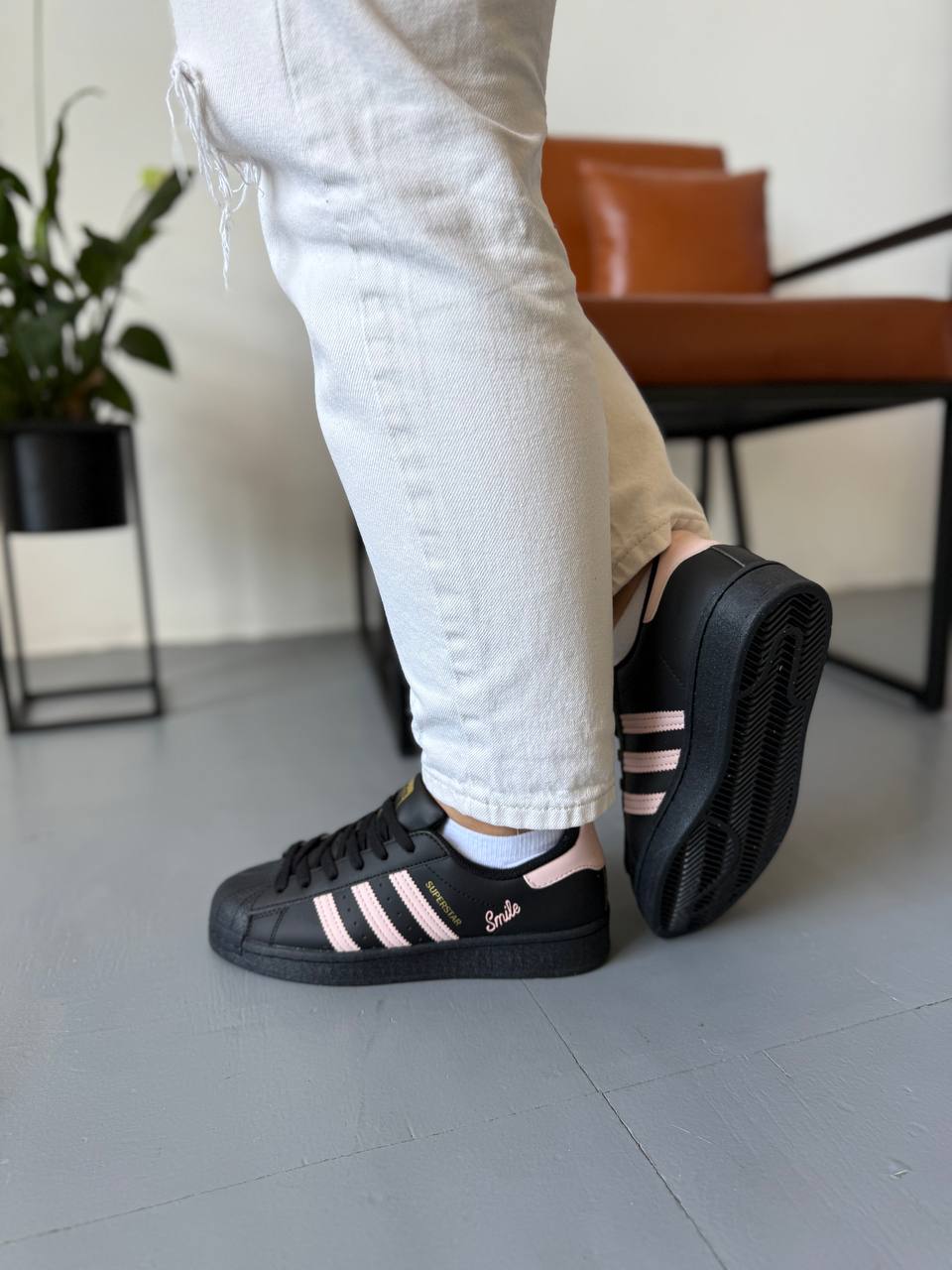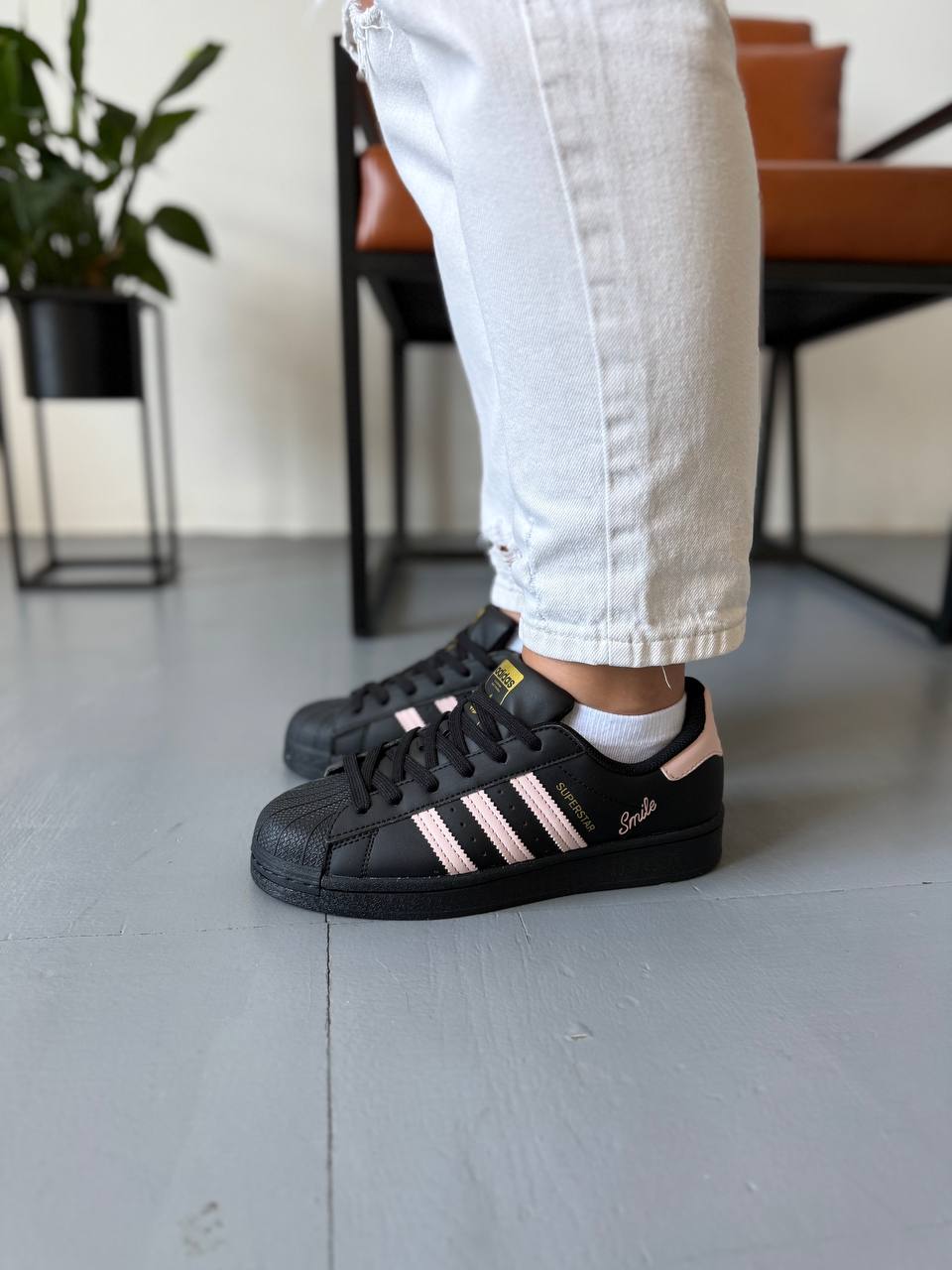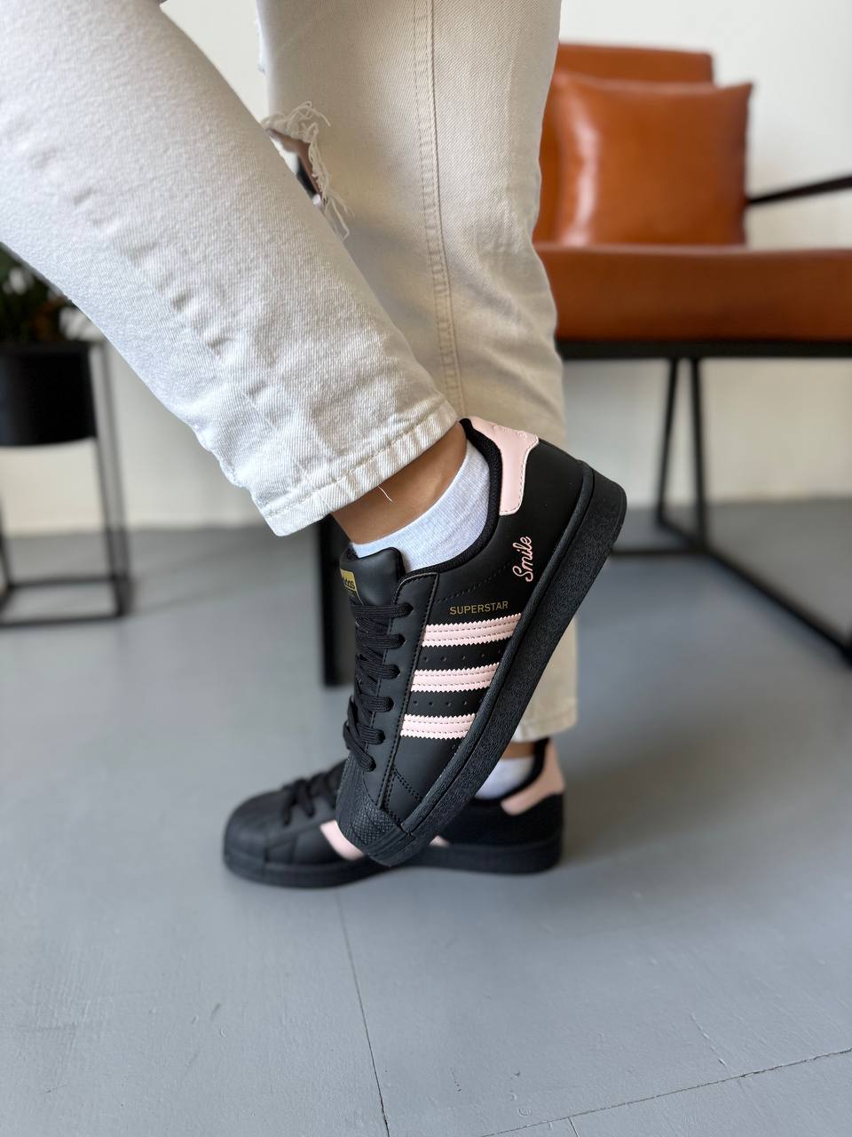 Adidas Superstar Smile Black Pink — це стильні кросівки з чорного шкіряного верху з рожевими деталями та надписом Smile, що додає настрою класичному дизайну.