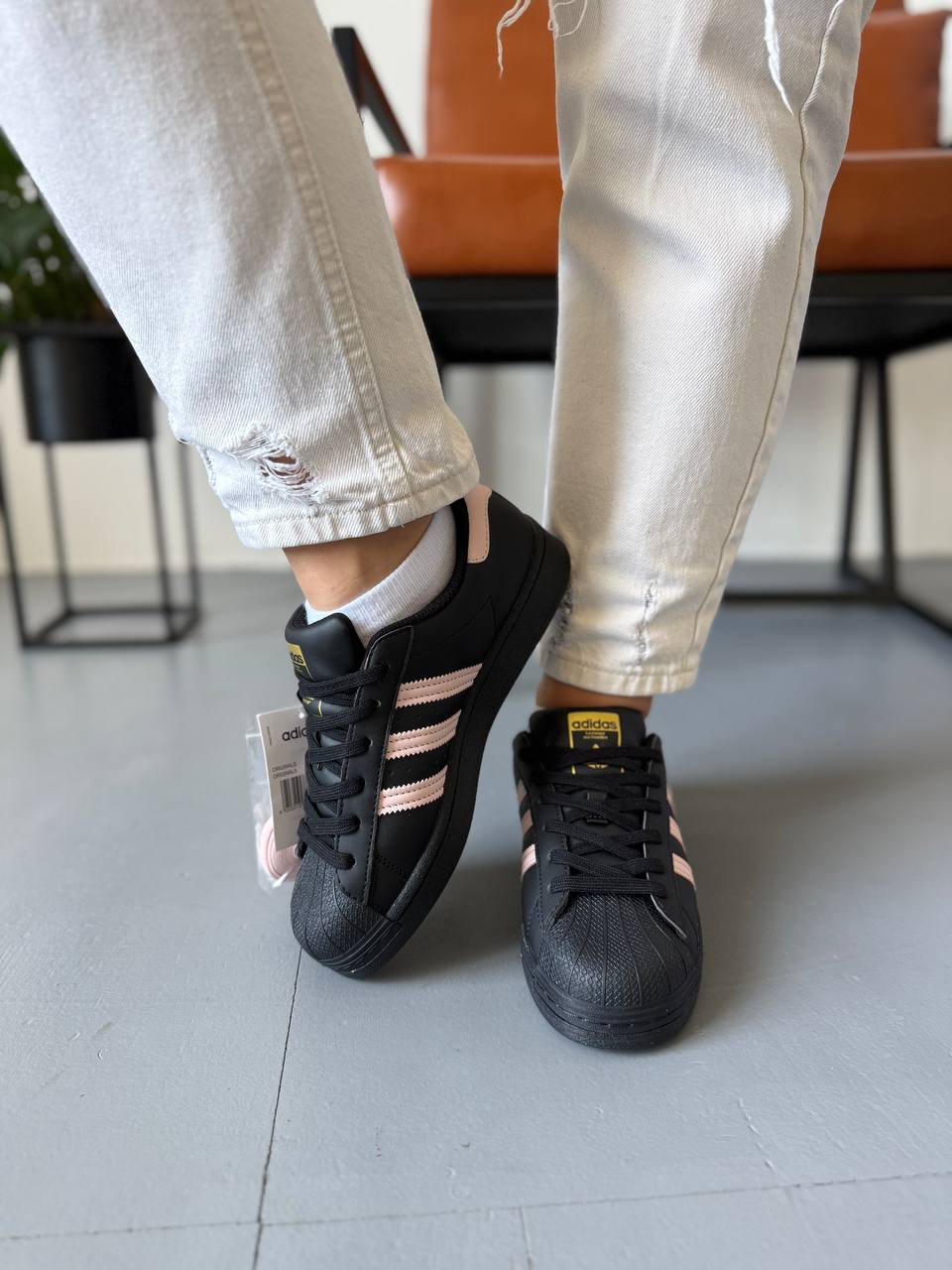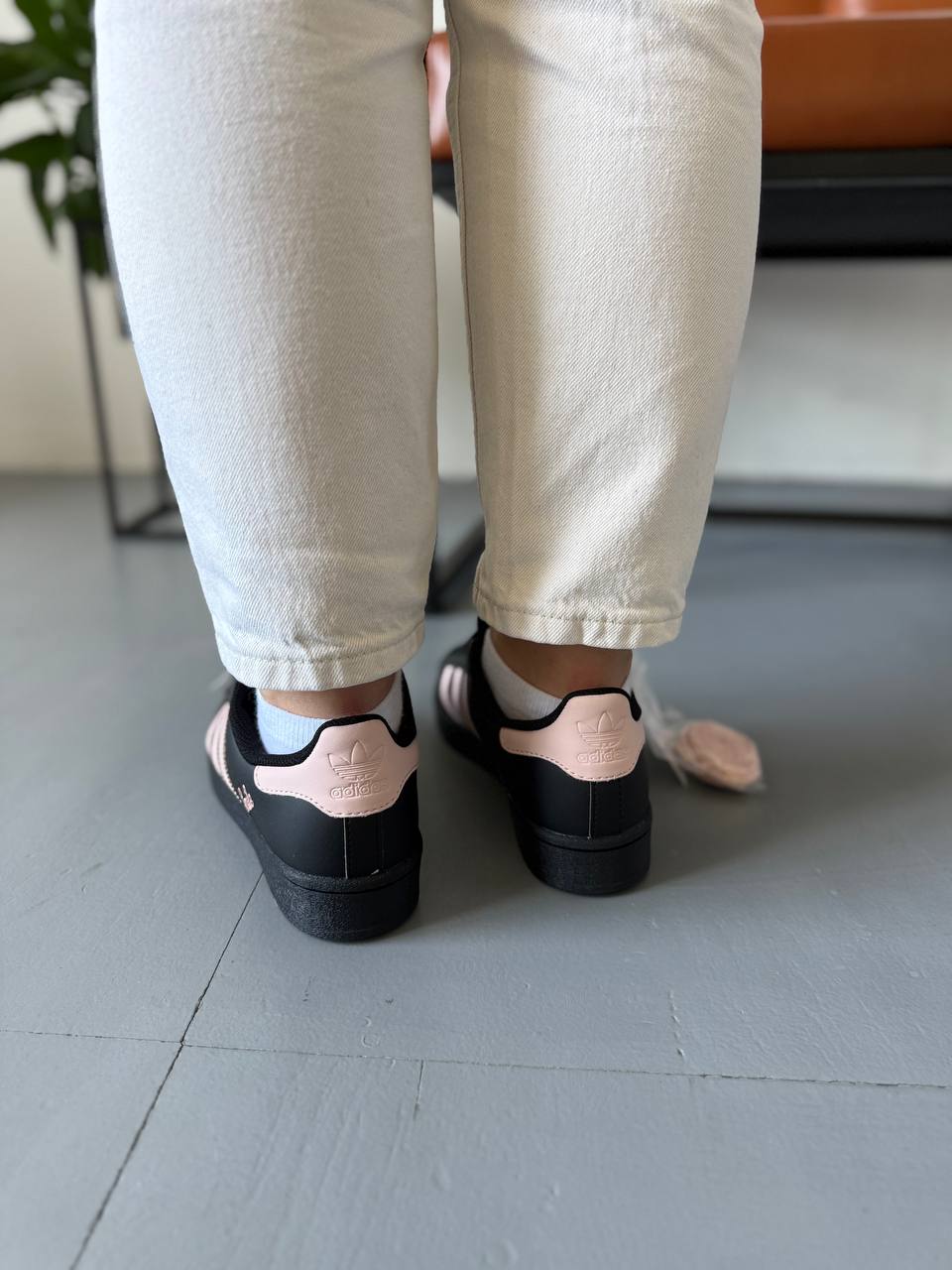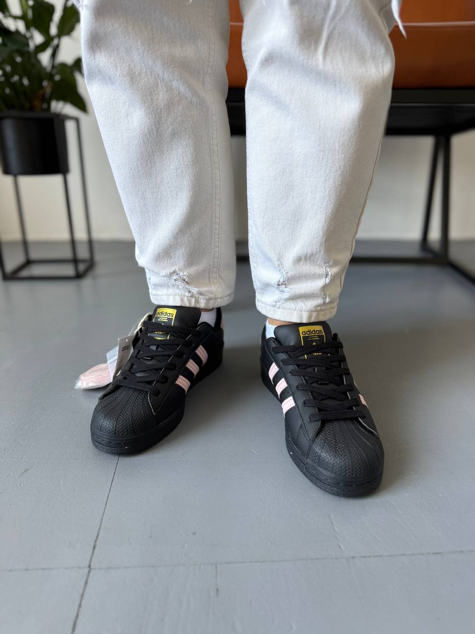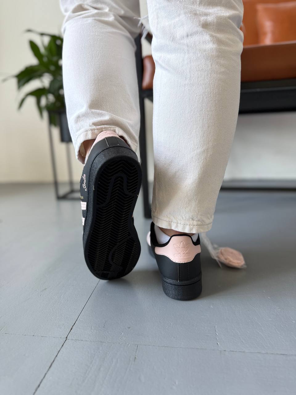Adidas Superstar Smile Black Pink — це стильні кросівки з чорного шкіряного верху з рожевими деталями та надписом Smile, що додає настрою класичному дизайну.