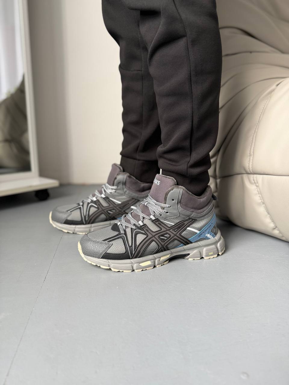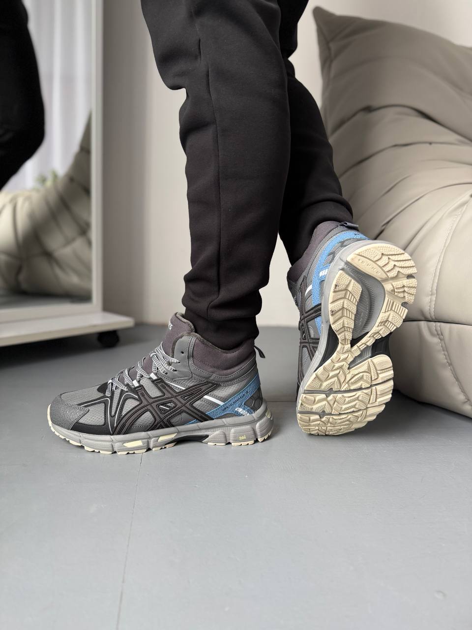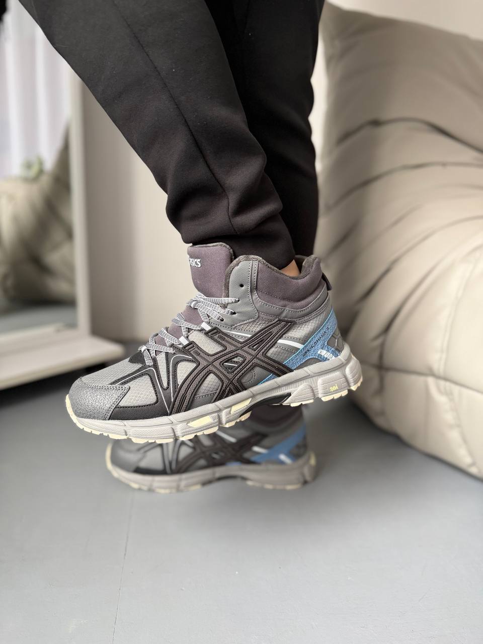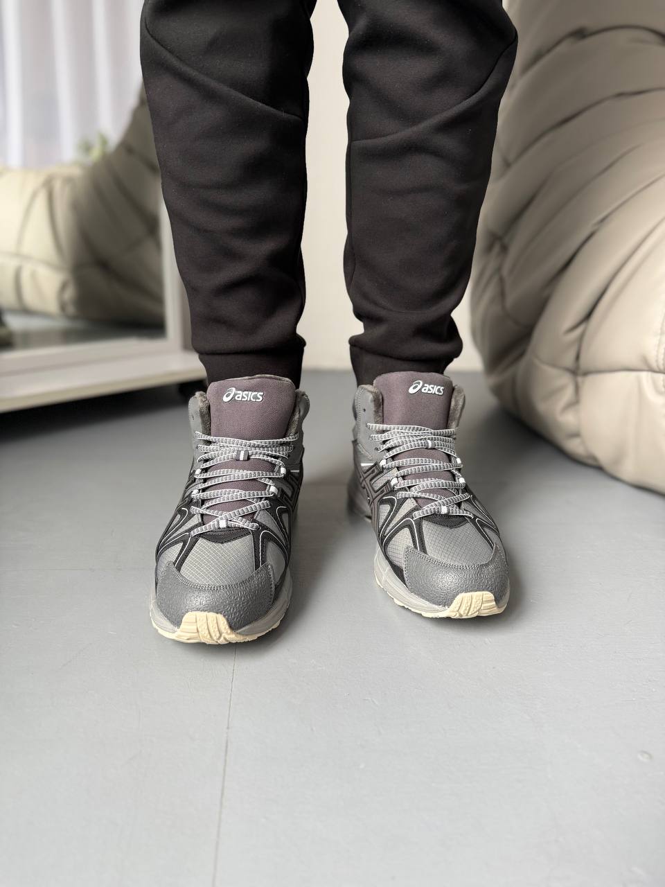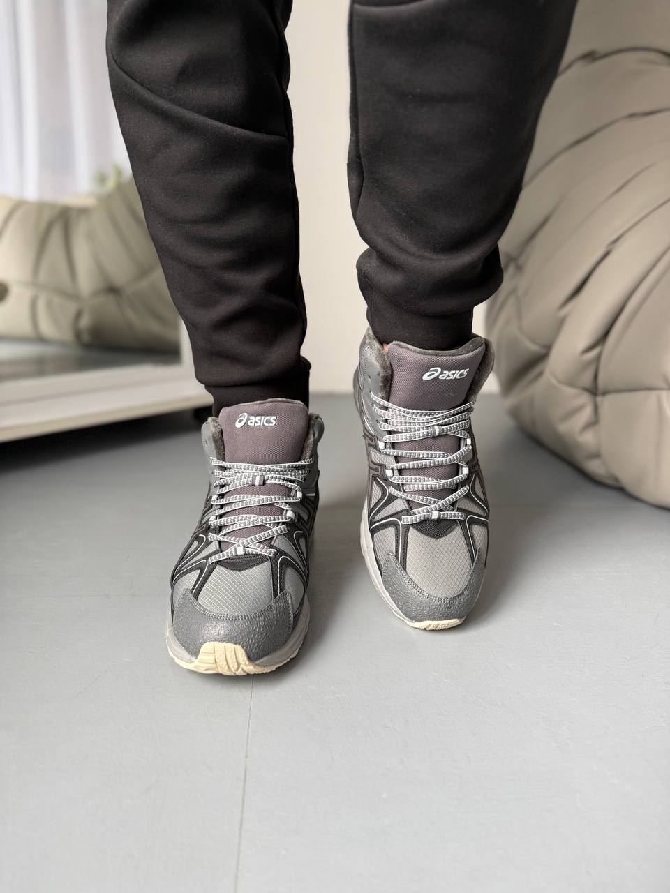 Asics Gel-Kahana 8 High Black Grey Fur — стильні високі кросівки у поєднанні чорного та сірого кольорів з текстурованими детальними акцентами. Модель оснащена амортизуючою технологією GEL для комфорту при тривалому носінні, має високий силует для підтримки щиколотки та відмінно підходить для активного щоденного використання й міського стилю.