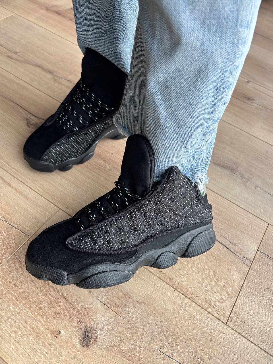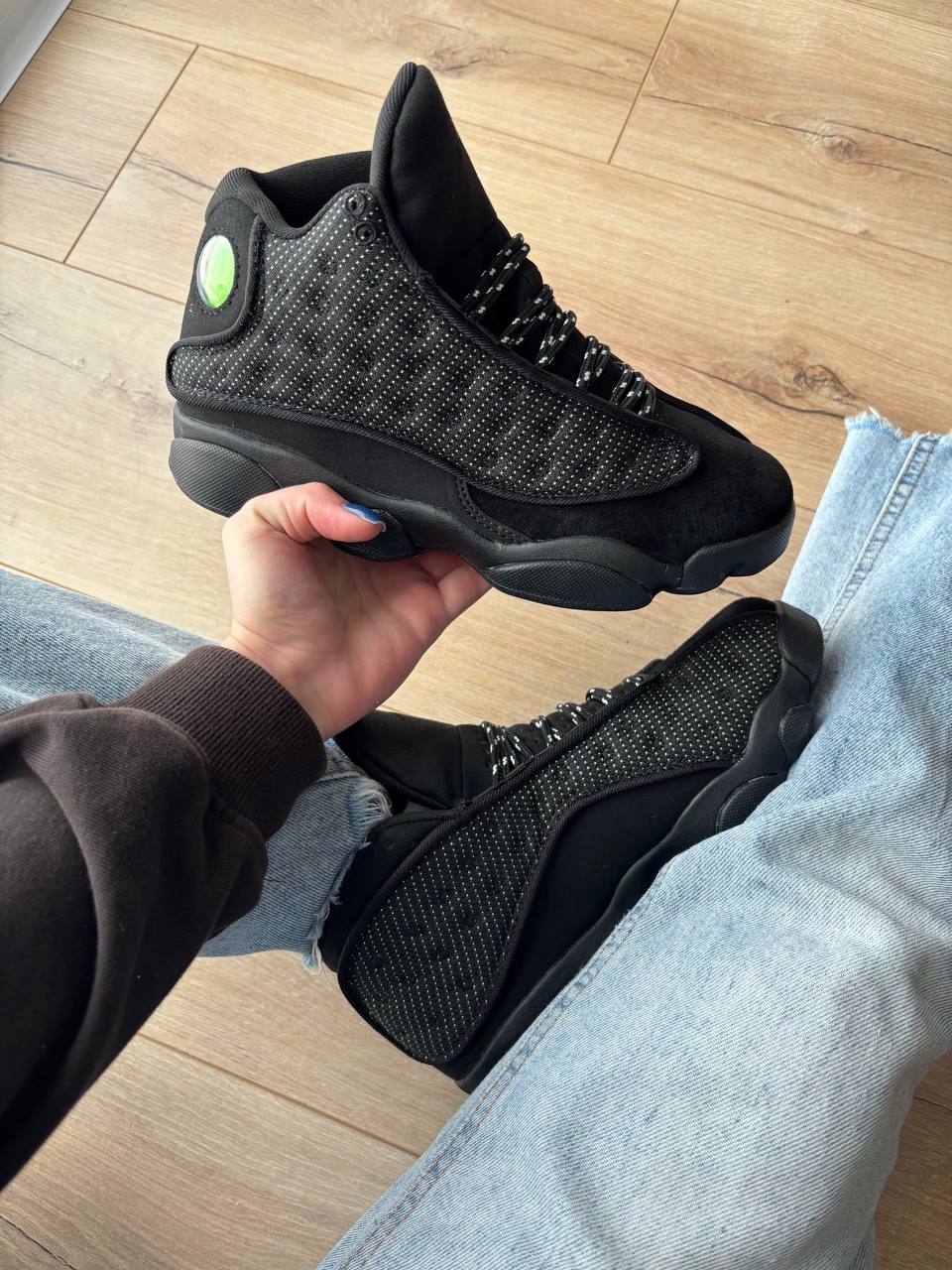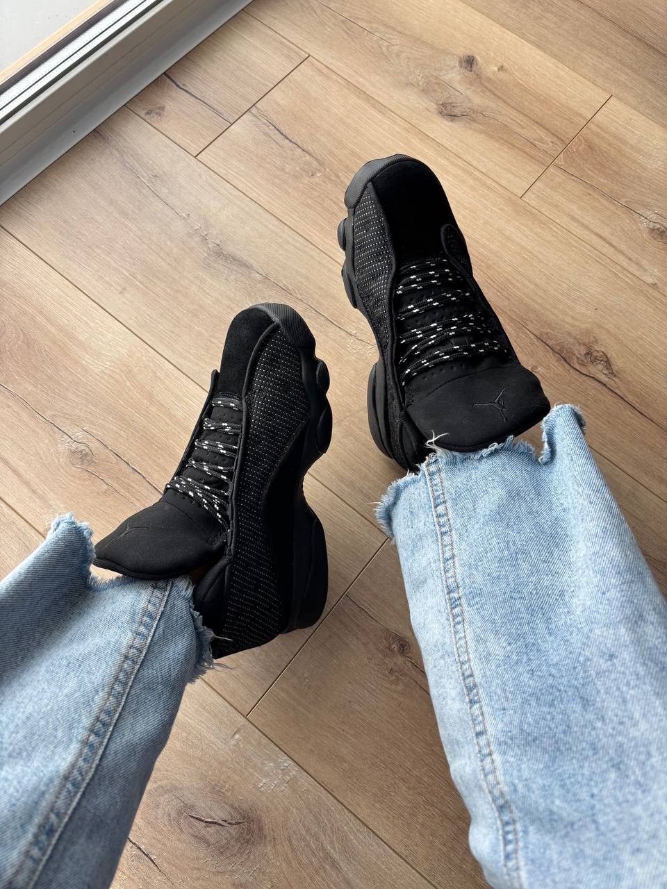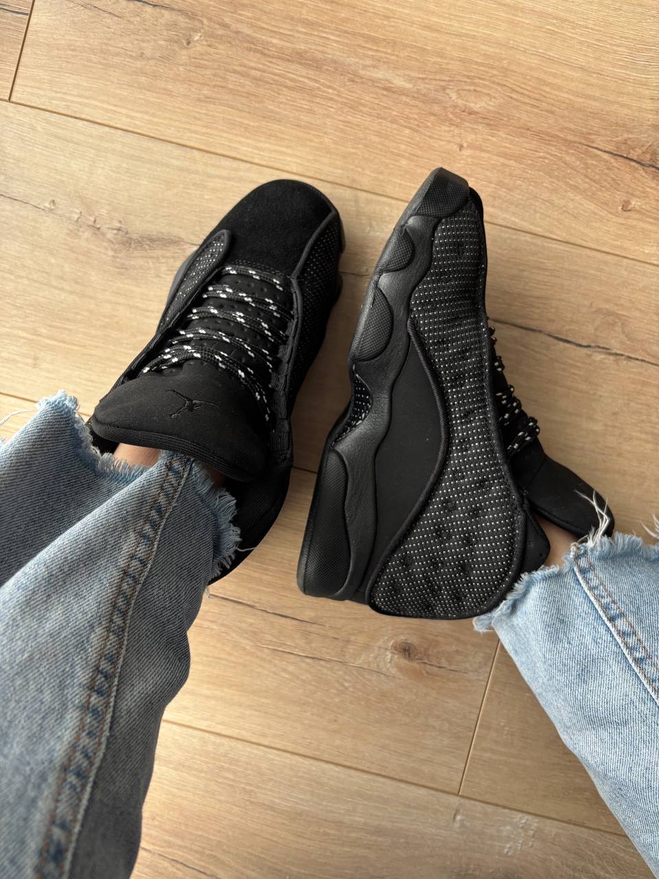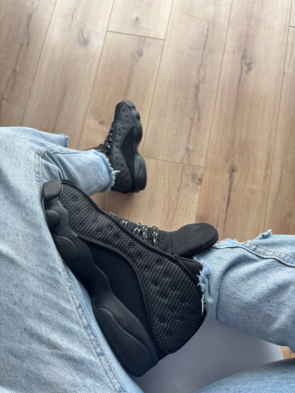 Jordan 13 Retro Black Cat — повністю чорна версія культової моделі з динамічним силуетом, що поєднує стриманий агресивний вигляд, комфортну посадку та впізнаваний спортивний характер.