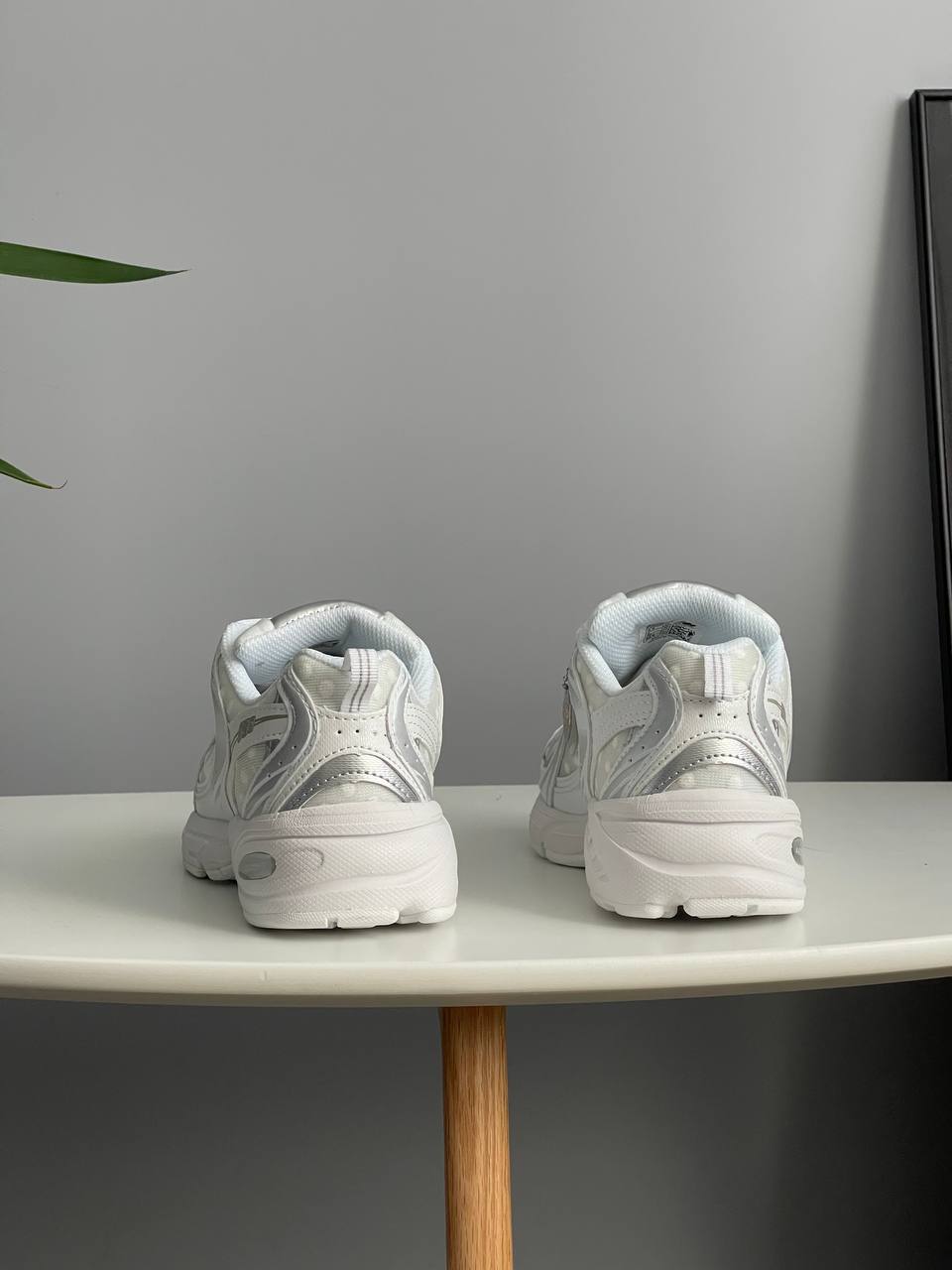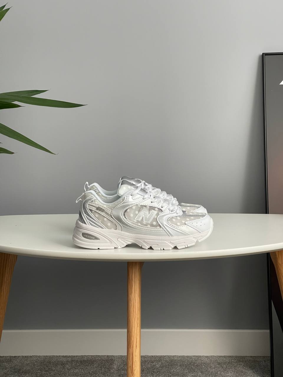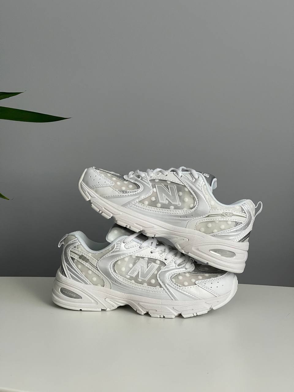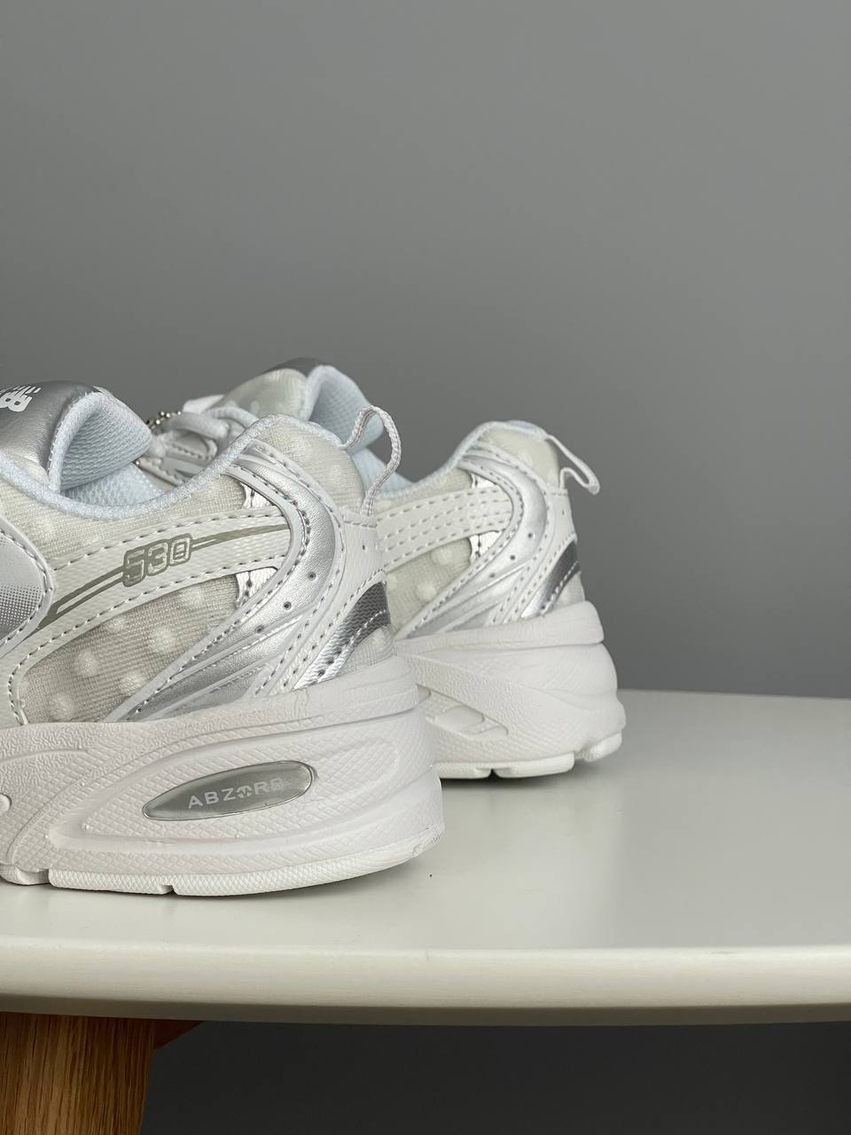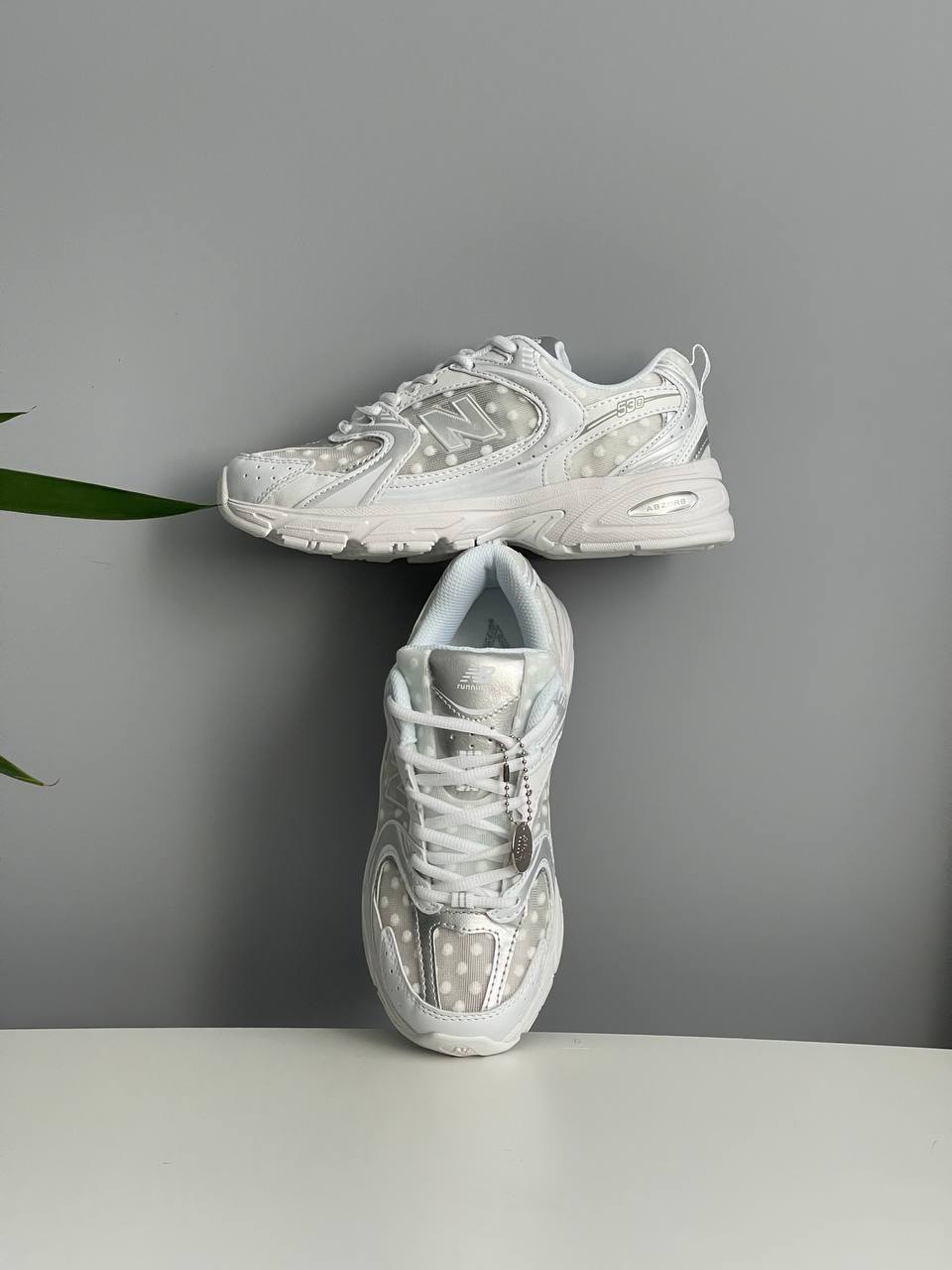 New Balance 530 Silver Polka Dots Grey — унікальна модель у сріблясто-сірому виконанні з акцентом у вигляді принта в горошок, що поєднує спортивний комфорт і нестандартний сучасний стиль.