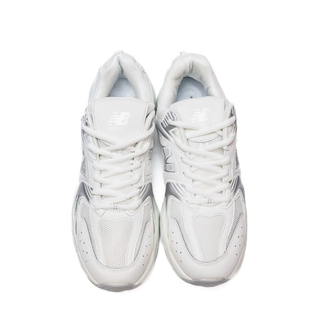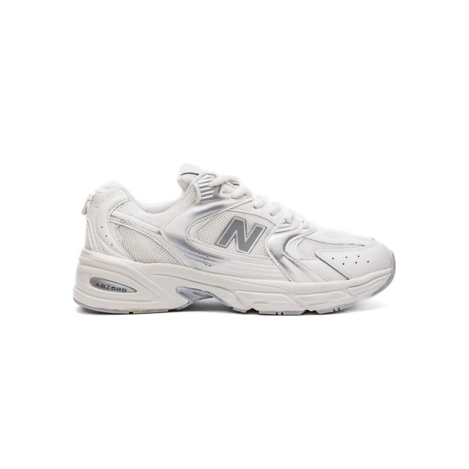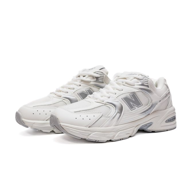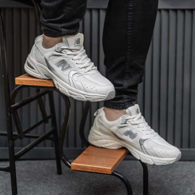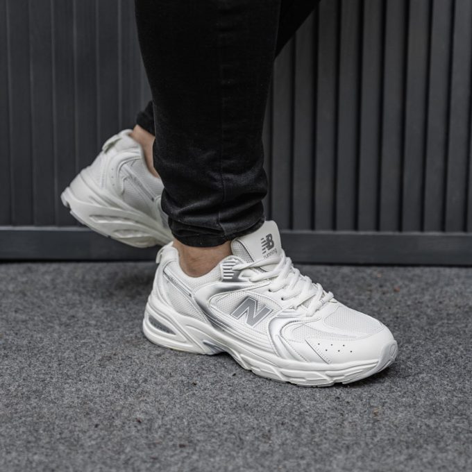 New Balance 530 White Silver — легкі кросівки у білому кольорі з сріблястими акцентами, що поєднують класичний вигляд і комфорт для щоденного носіння.
