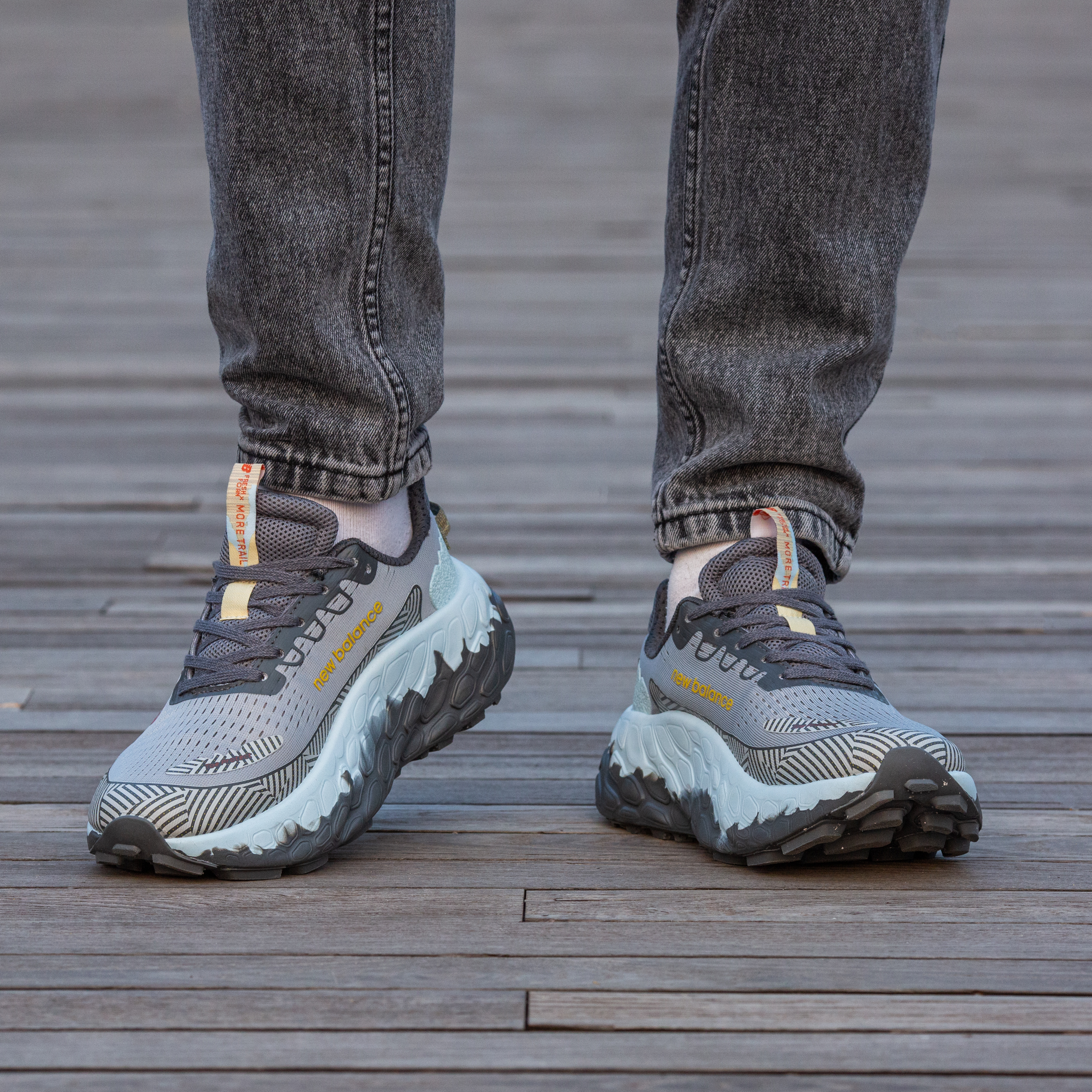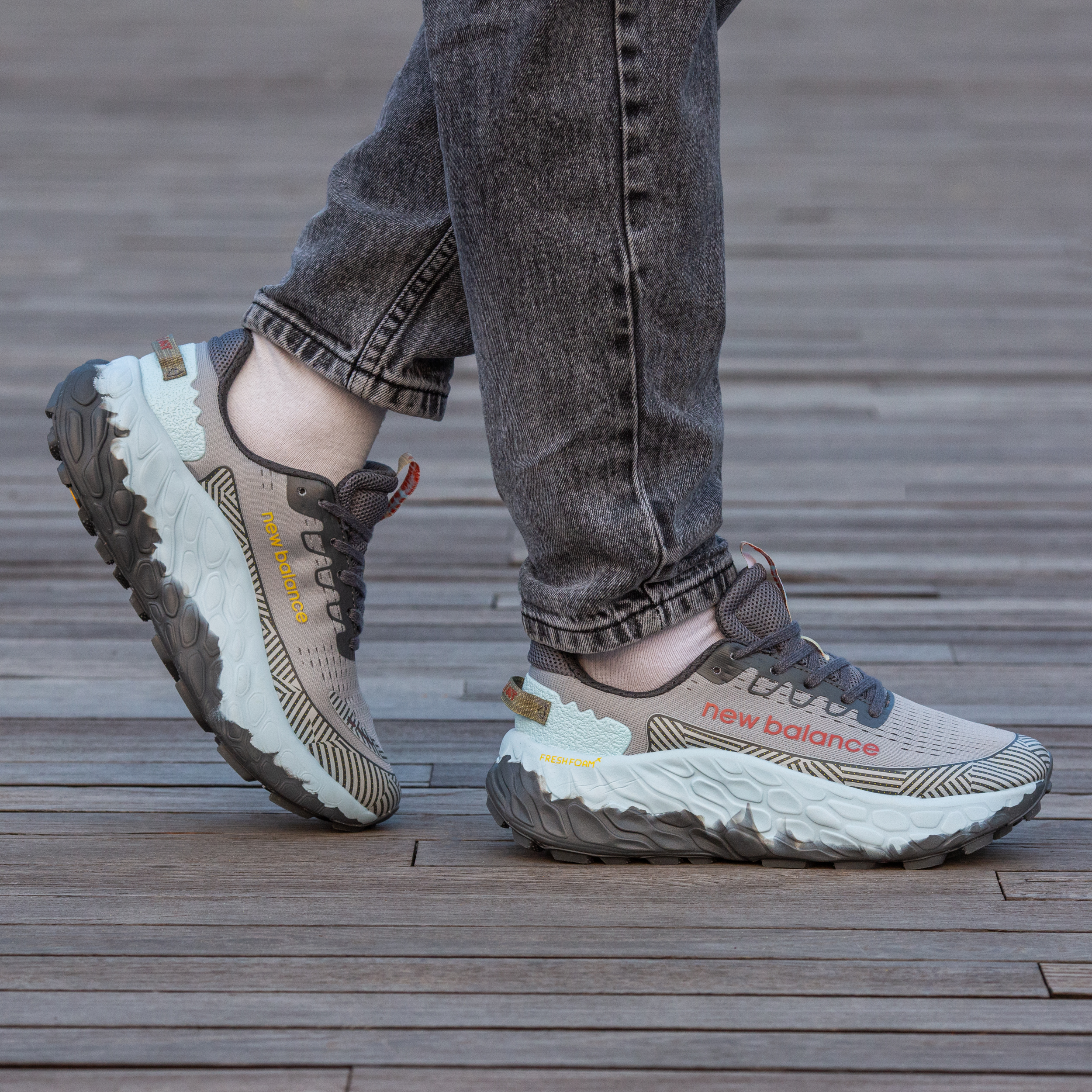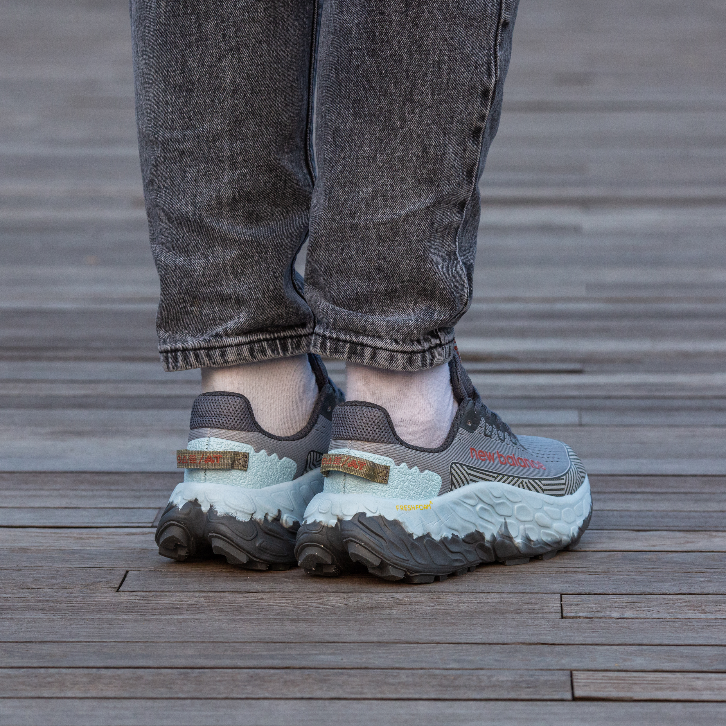 New Balance Trail v3 Grey — це трейлові кросівки з сірим сітчастим верхом, синтетичними накладками, сіро-блакитною підошвою та амортизацією Fresh Foam X для комфортного бігу по пересічній місцевості.