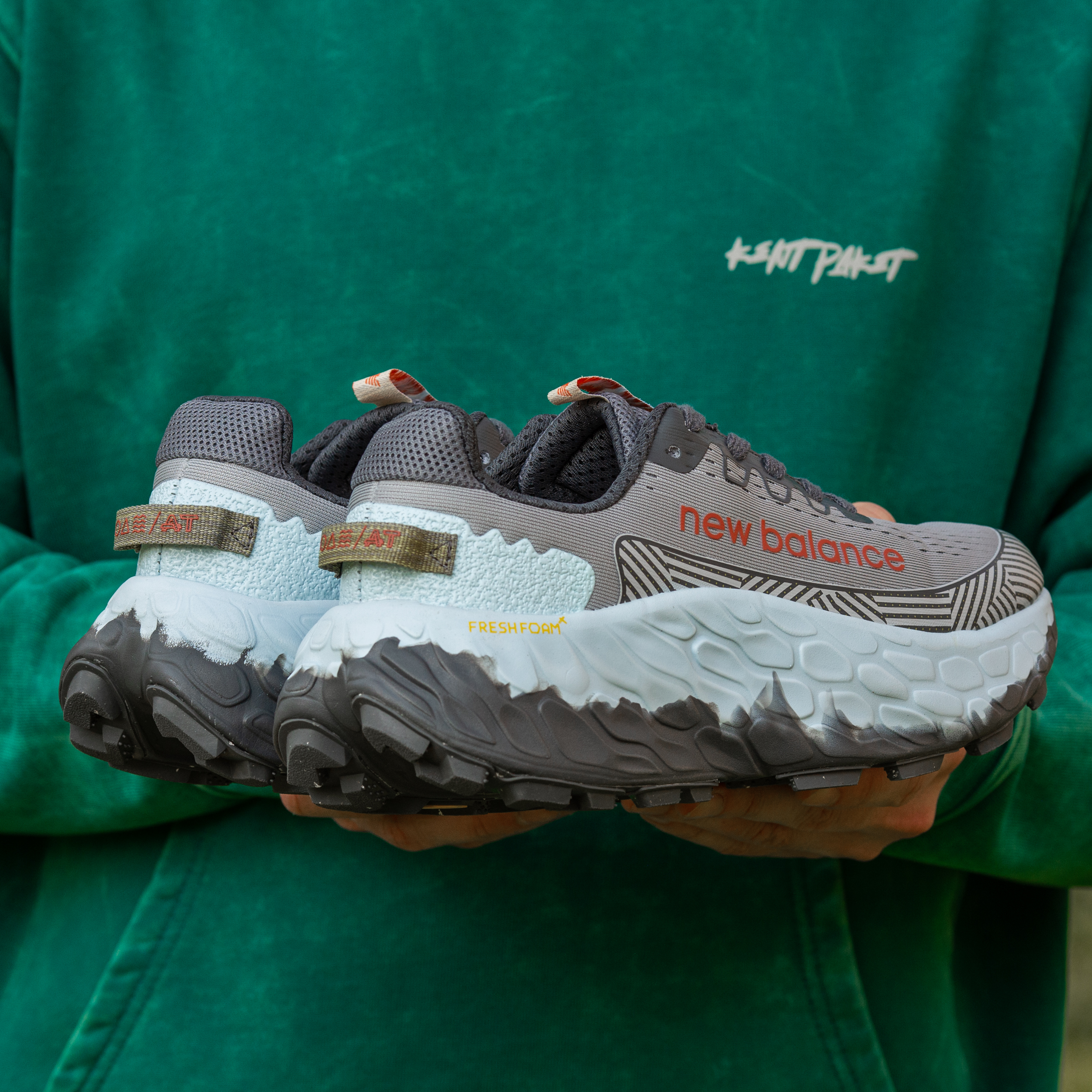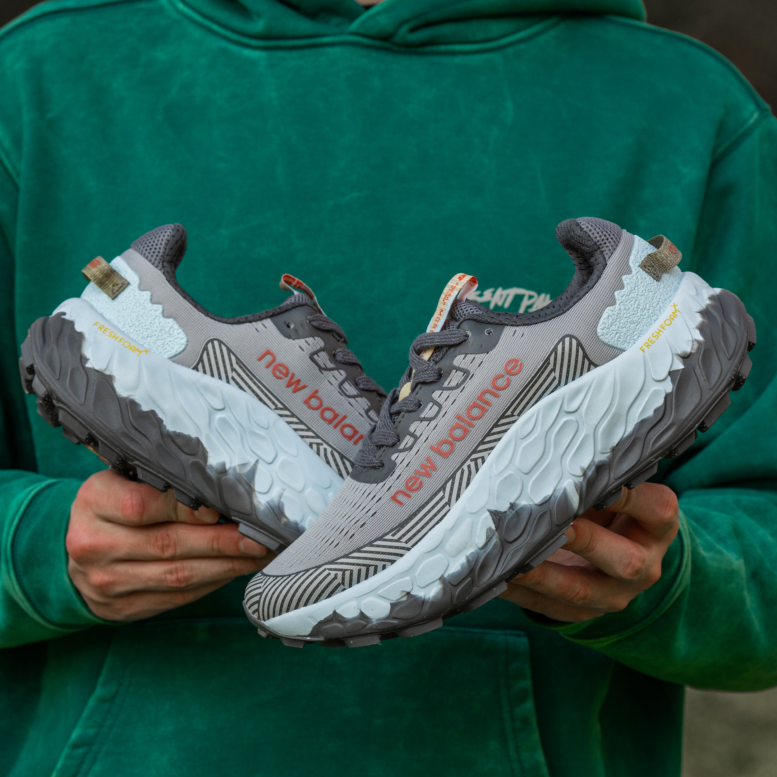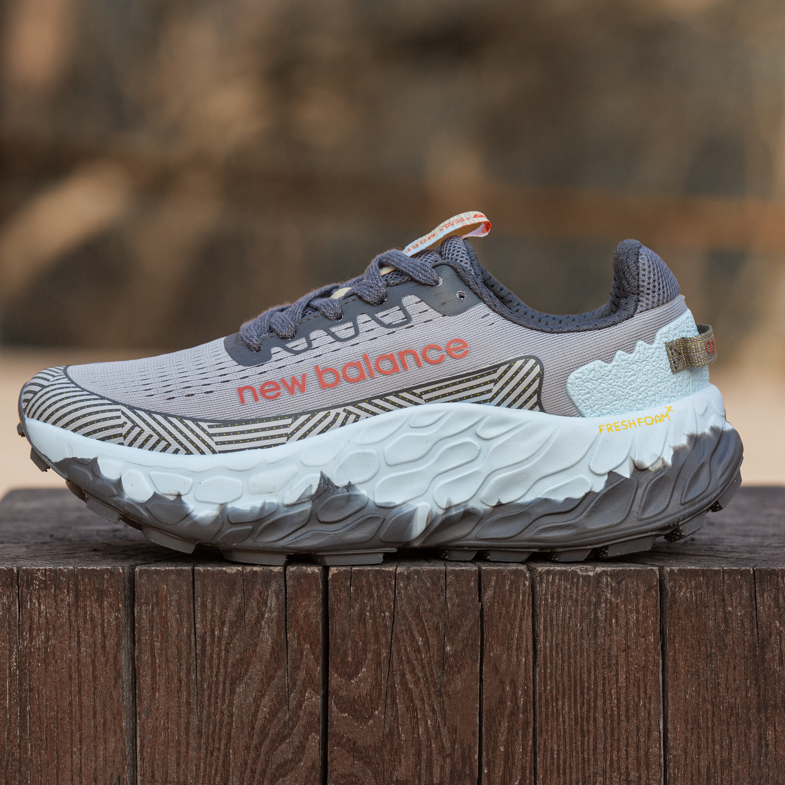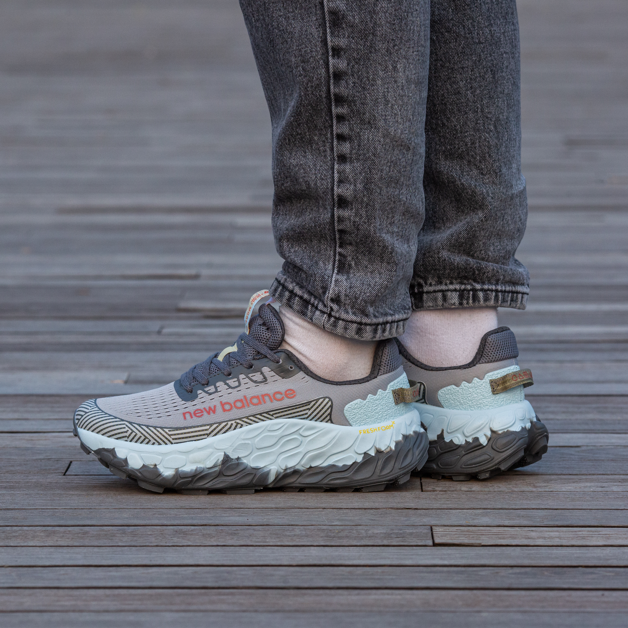 New Balance Trail v3 Grey — це трейлові кросівки з сірим сітчастим верхом, синтетичними накладками, сіро-блакитною підошвою та амортизацією Fresh Foam X для комфортного бігу по пересічній місцевості.