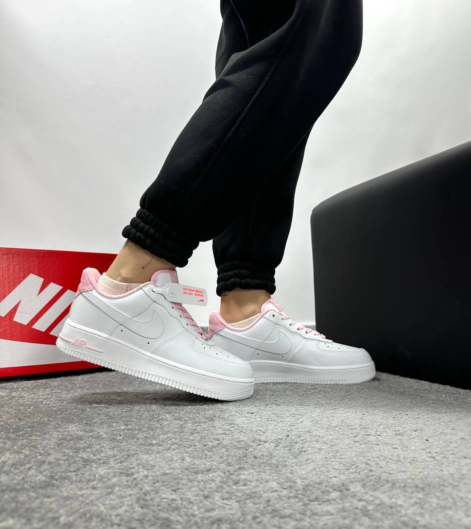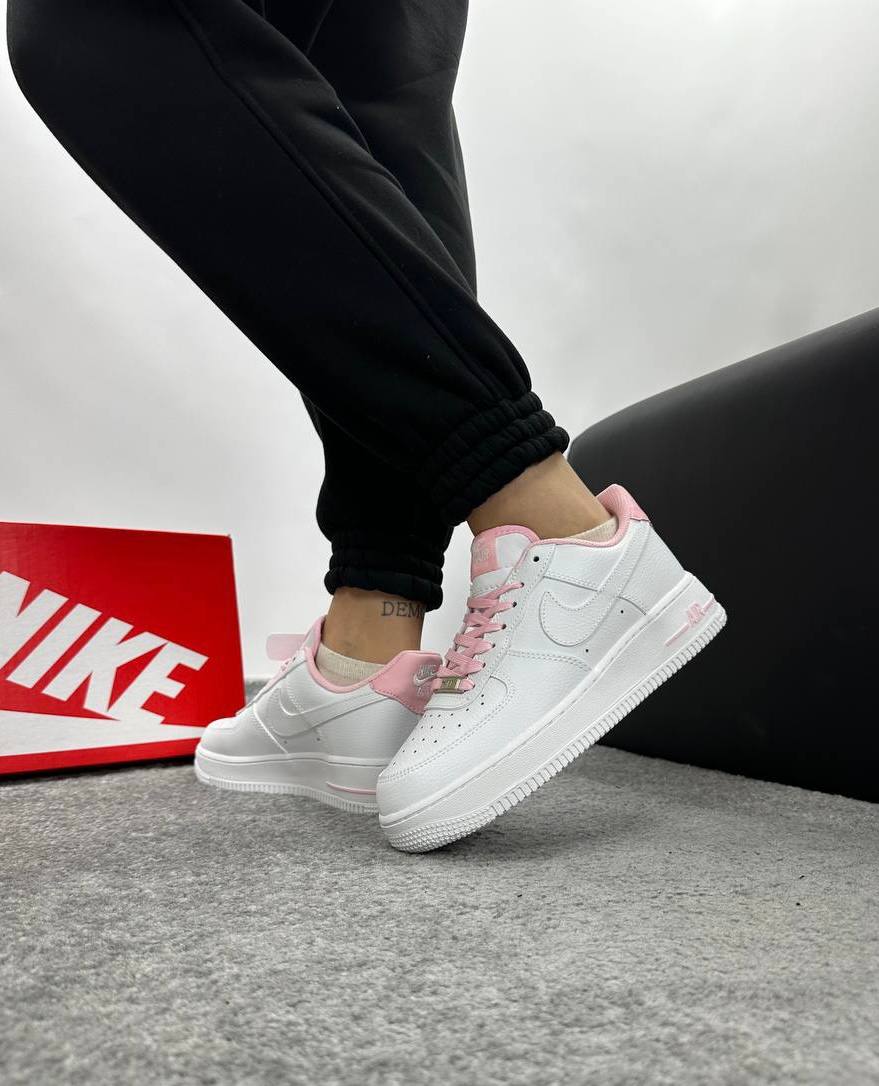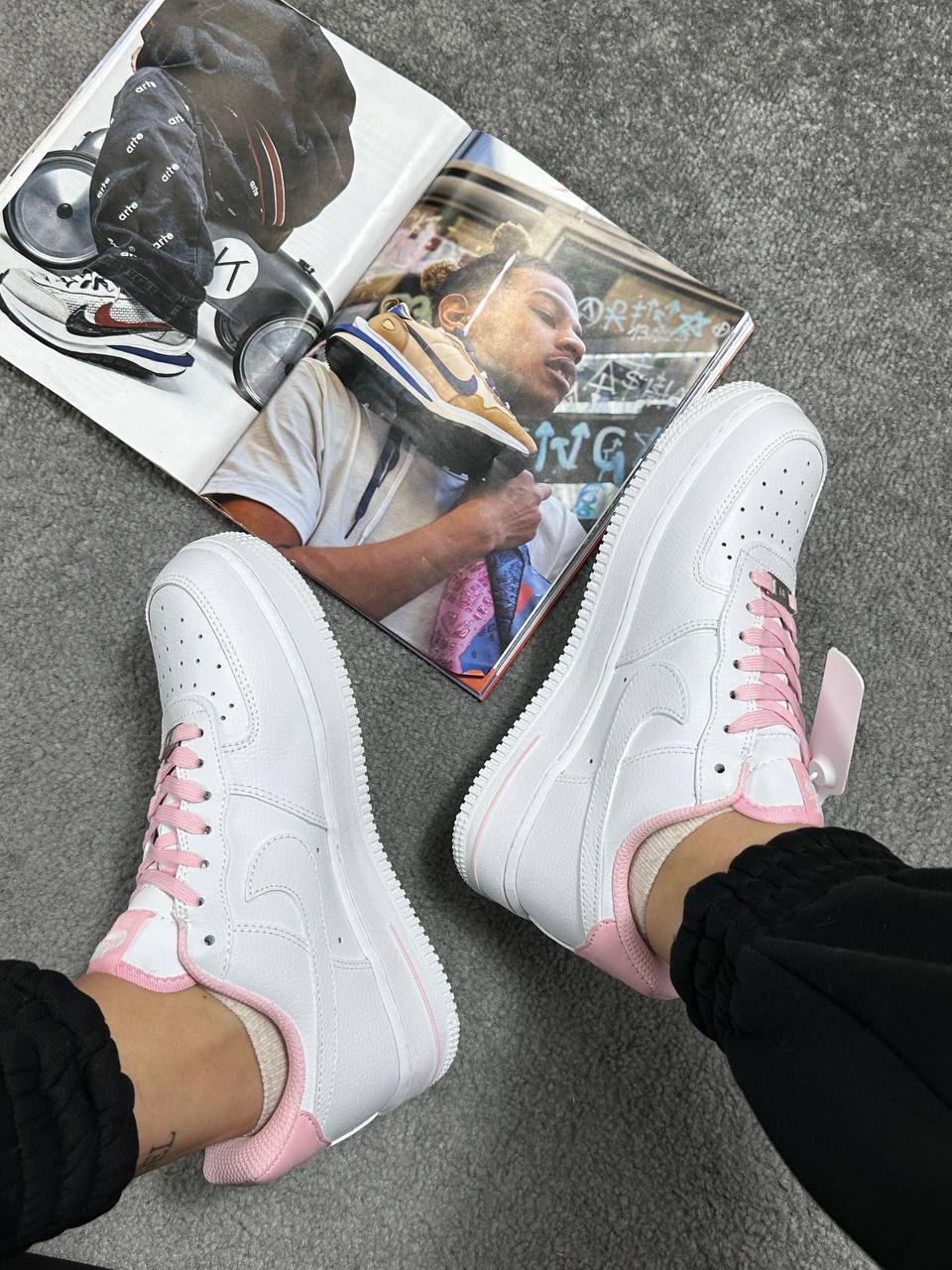 Nike Air Force White Pink — класична модель у поєднанні білого та рожевого відтінків, що вирізняється впізнаваним силуетом і комфортом для щоденного носіння.
