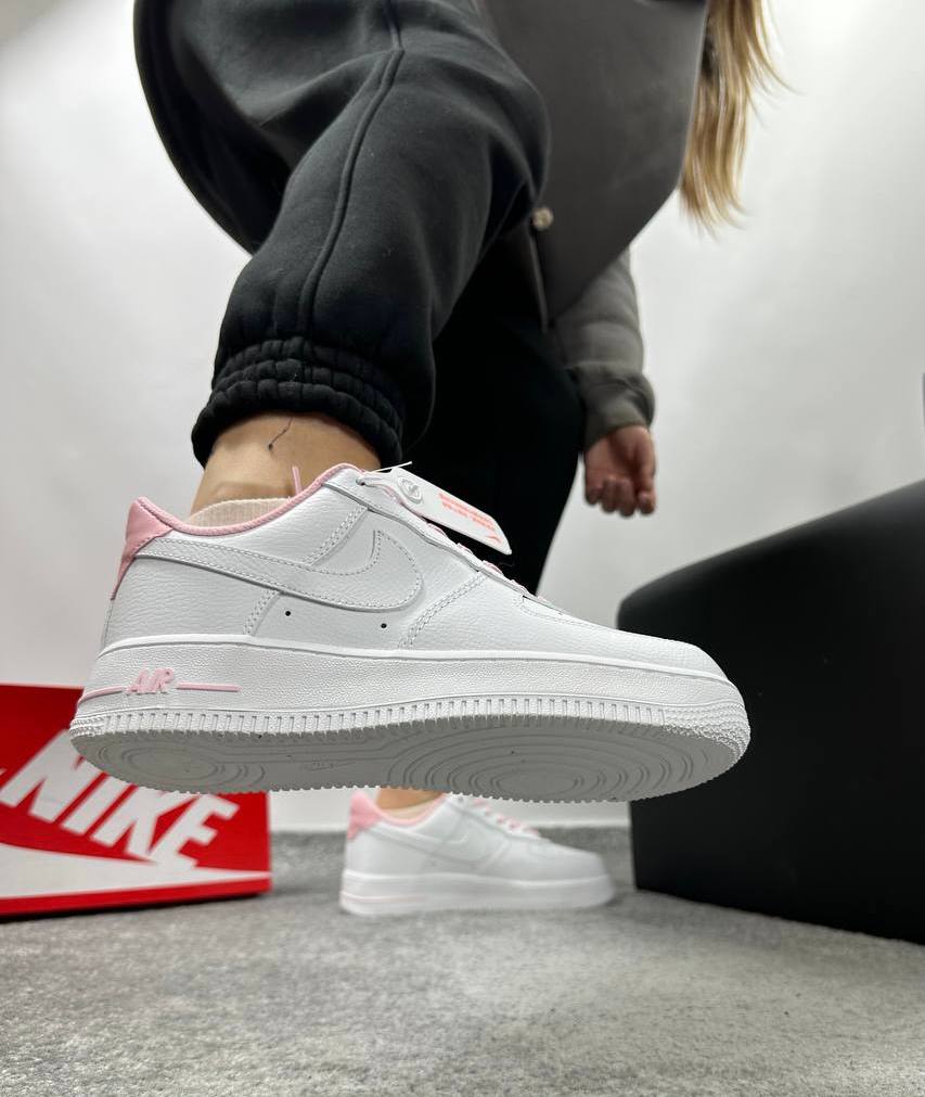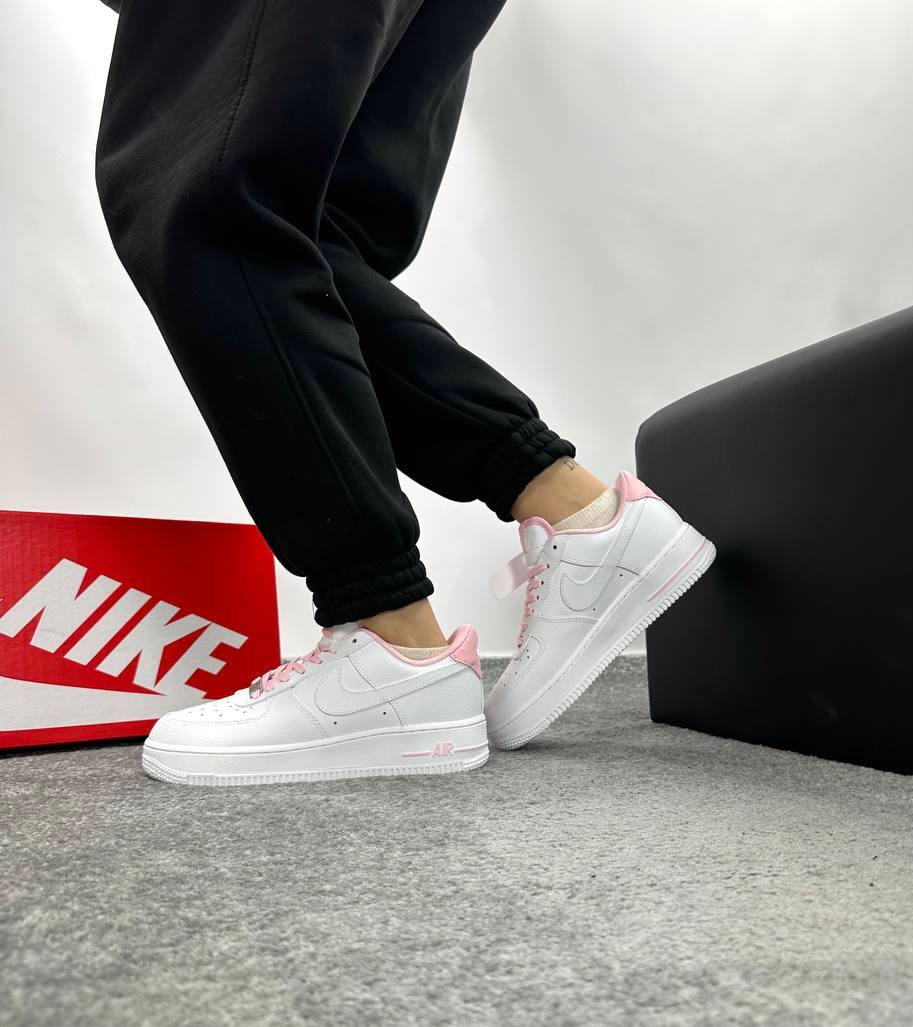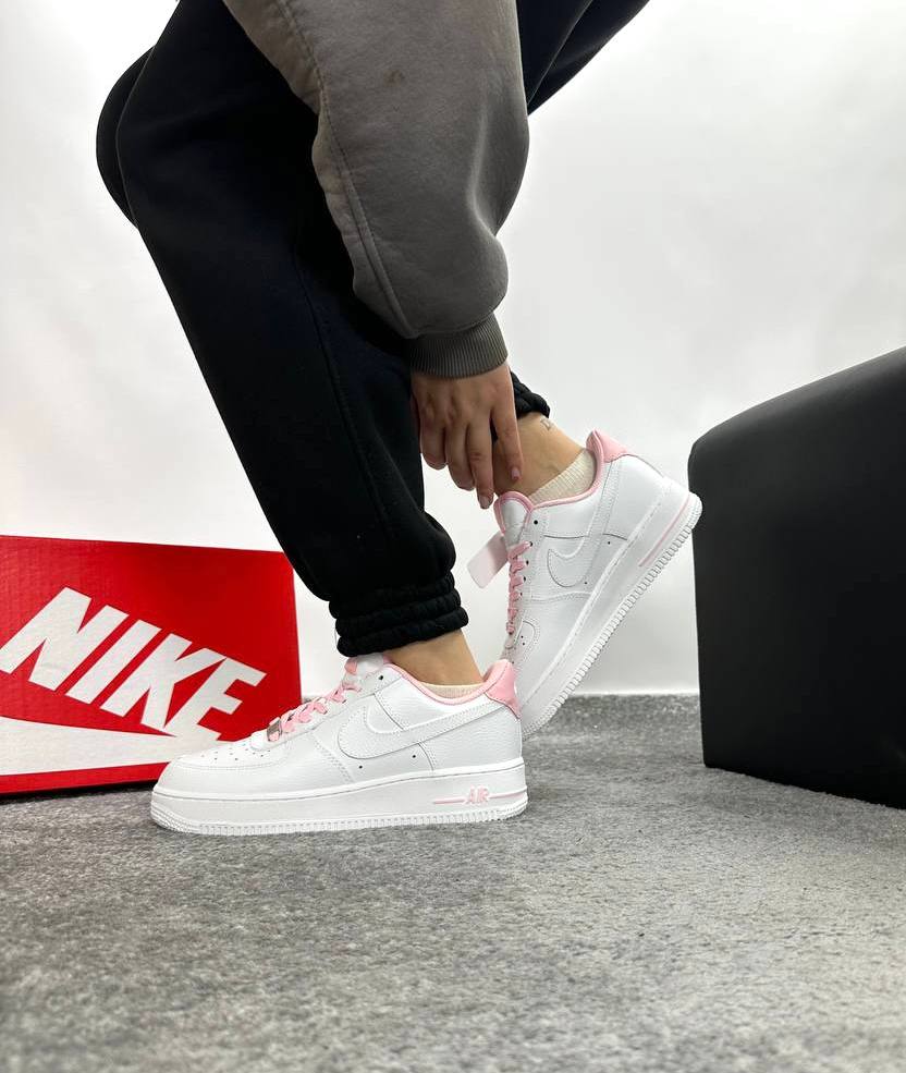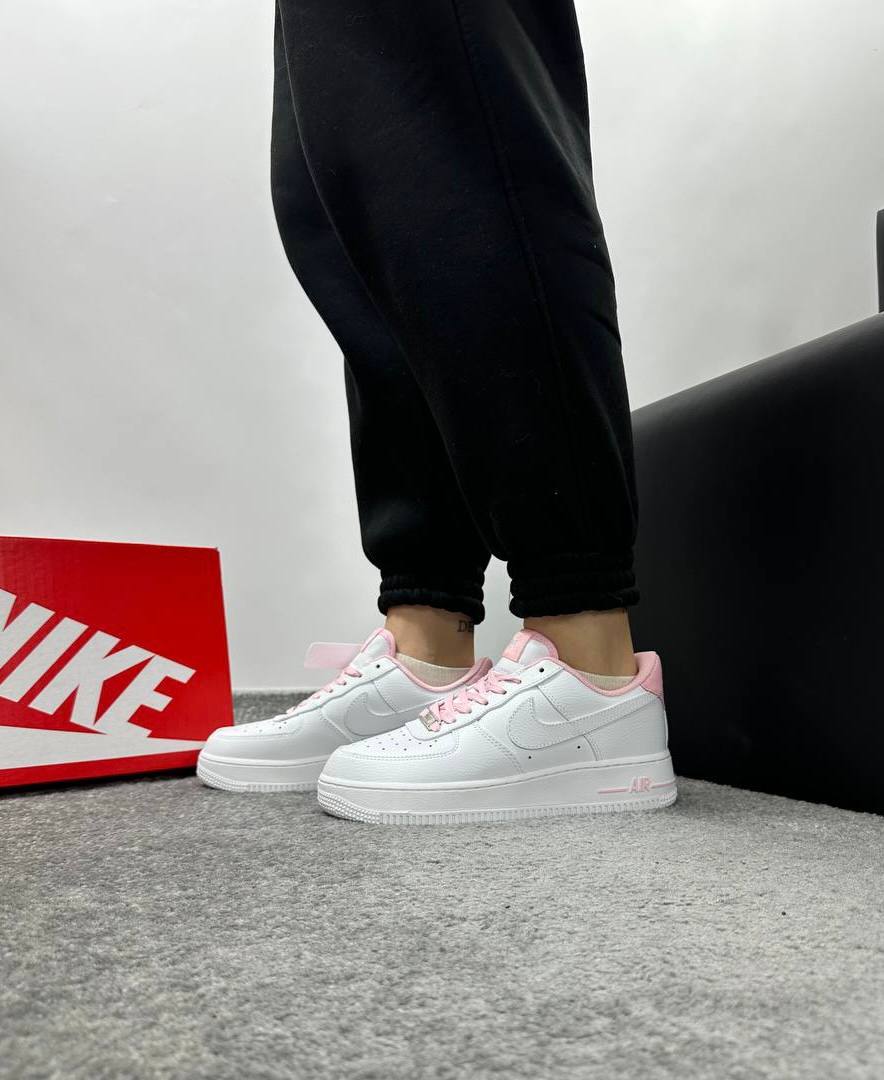 Nike Air Force White Pink — класична модель у поєднанні білого та рожевого відтінків, що вирізняється впізнаваним силуетом і комфортом для щоденного носіння.
