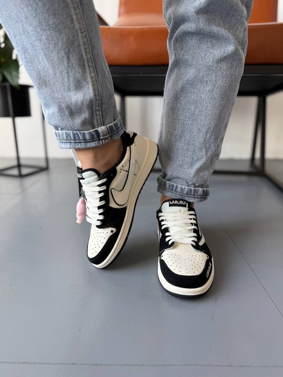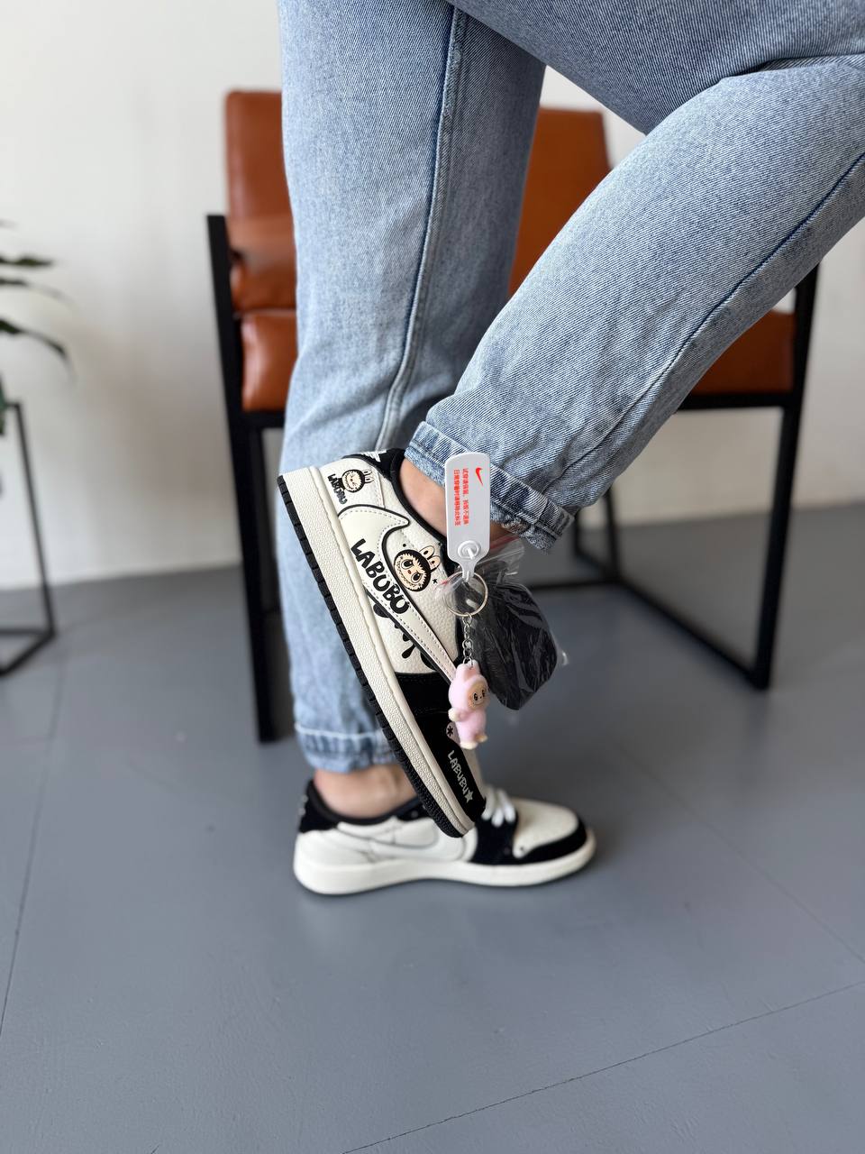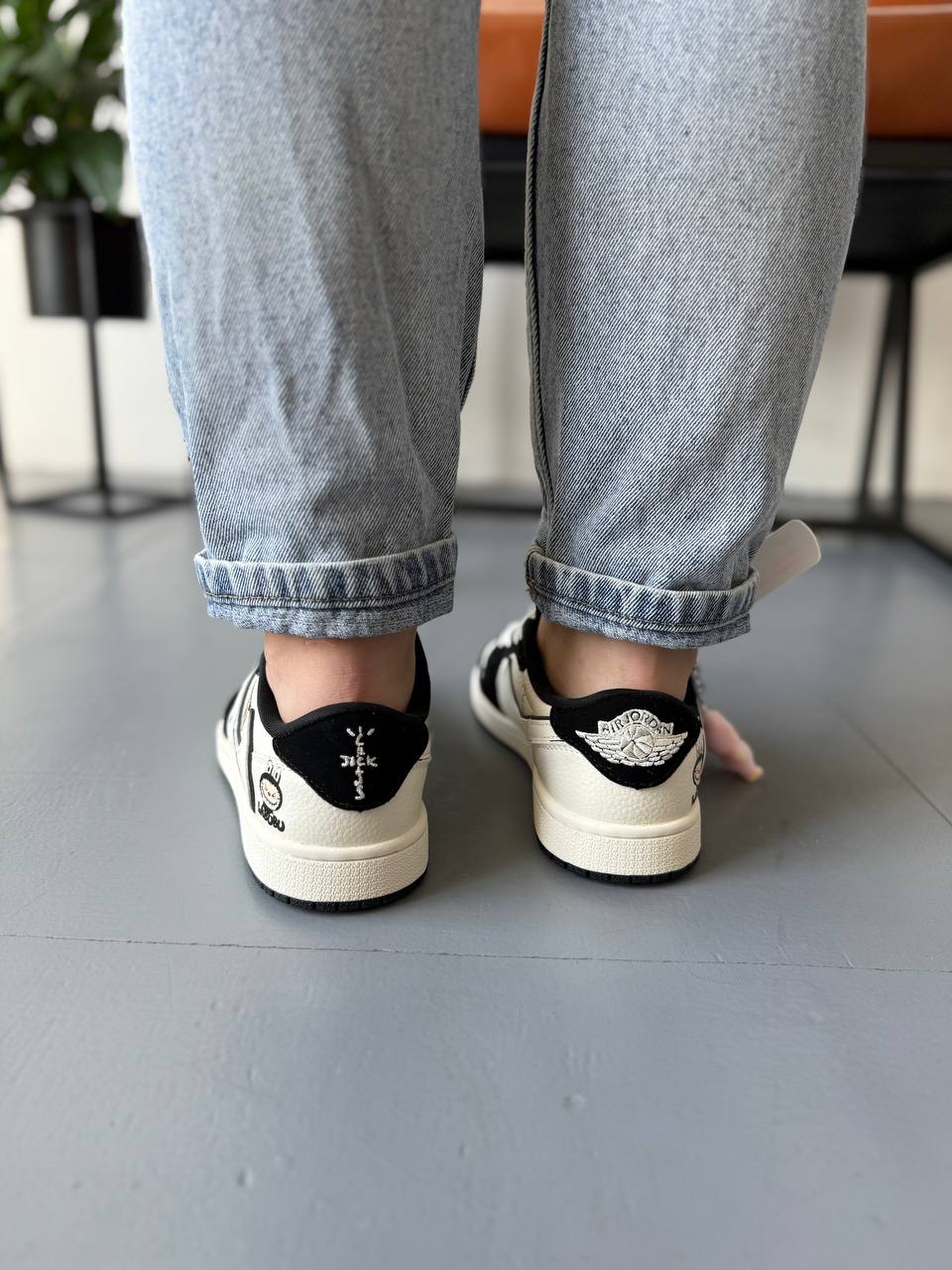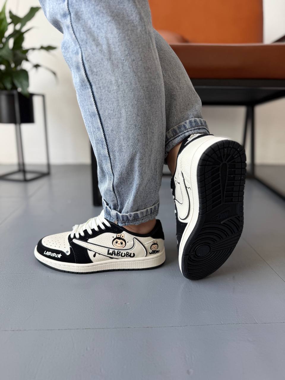 Nike Air Jordan 1 Low Travis Scott x Labubu Black Beige — яскраві та незвичні кросівки, створені у співпраці з Travis Scott і персонажем Labubu. Модель виконана в комбінації чорного та бежевого кольорів із м’якого замшу й текстилю.