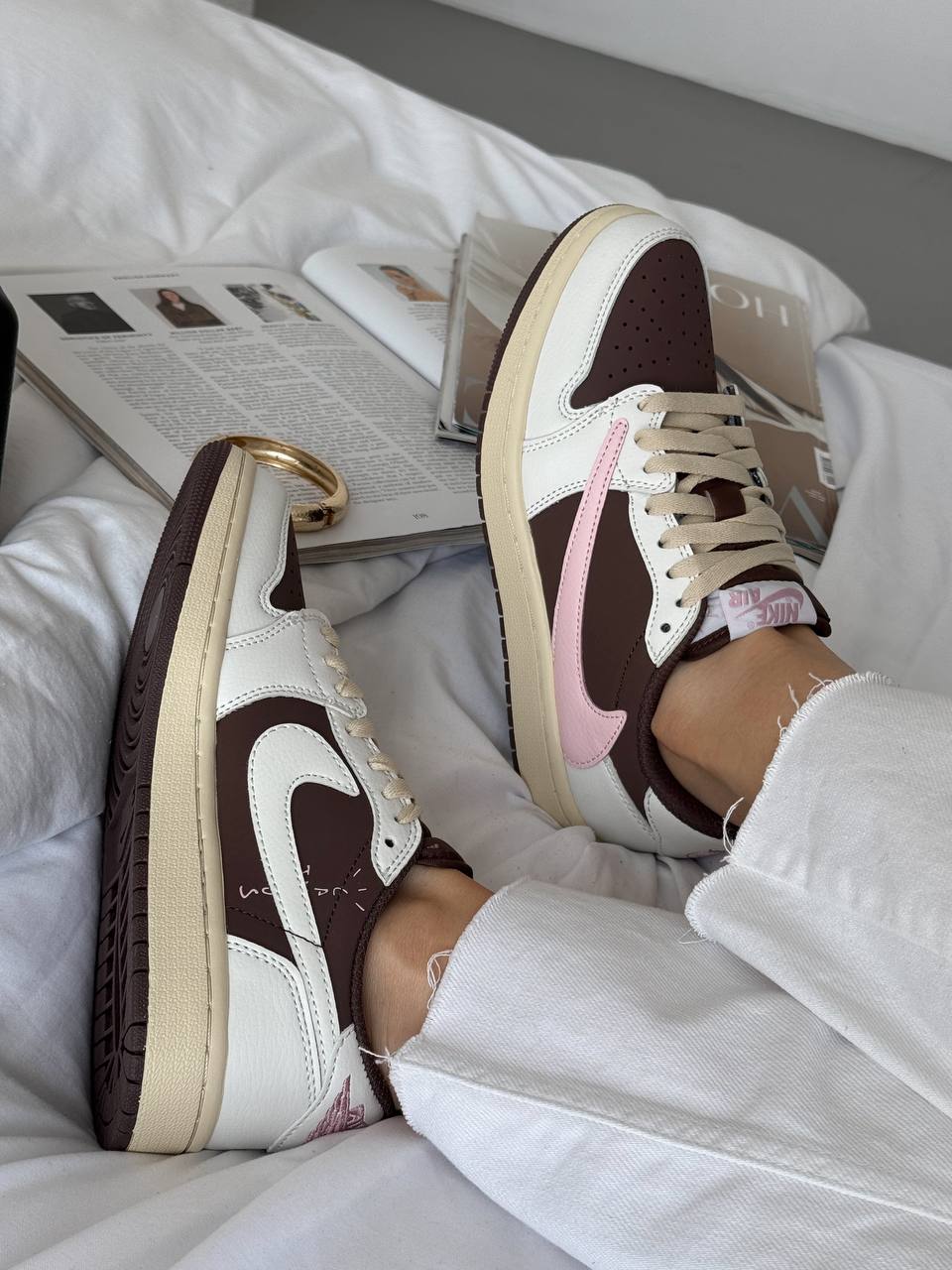 Nike Air Jordan 1 Low x Travis Scott White Brown Pink — колабораційна модель у поєднанні білого, коричневого та рожевого відтінків з впізнаваними деталями та низьким силуетом, що поєднує виразний дизайн і комфортну посадку для повсякденного стилю.