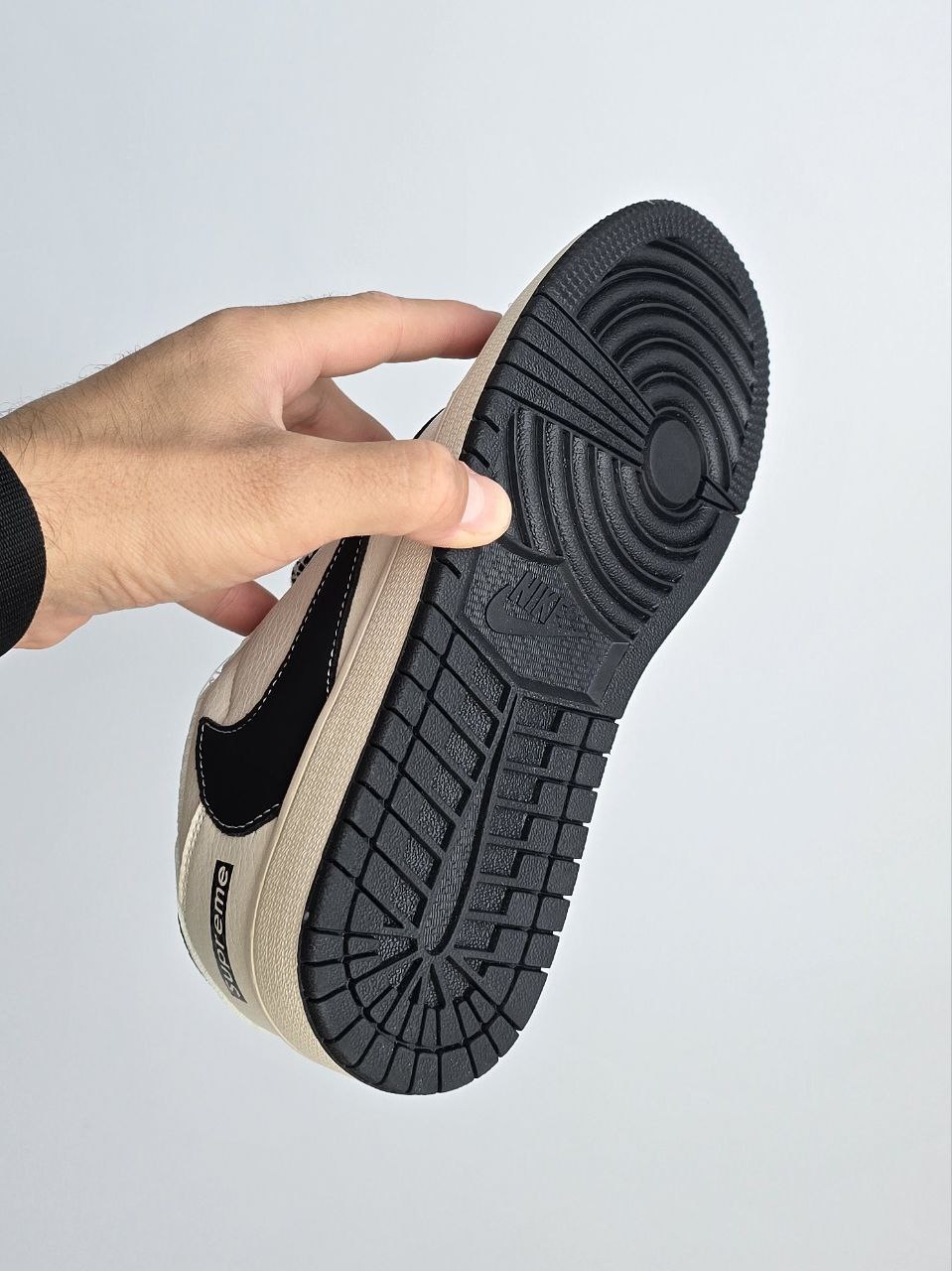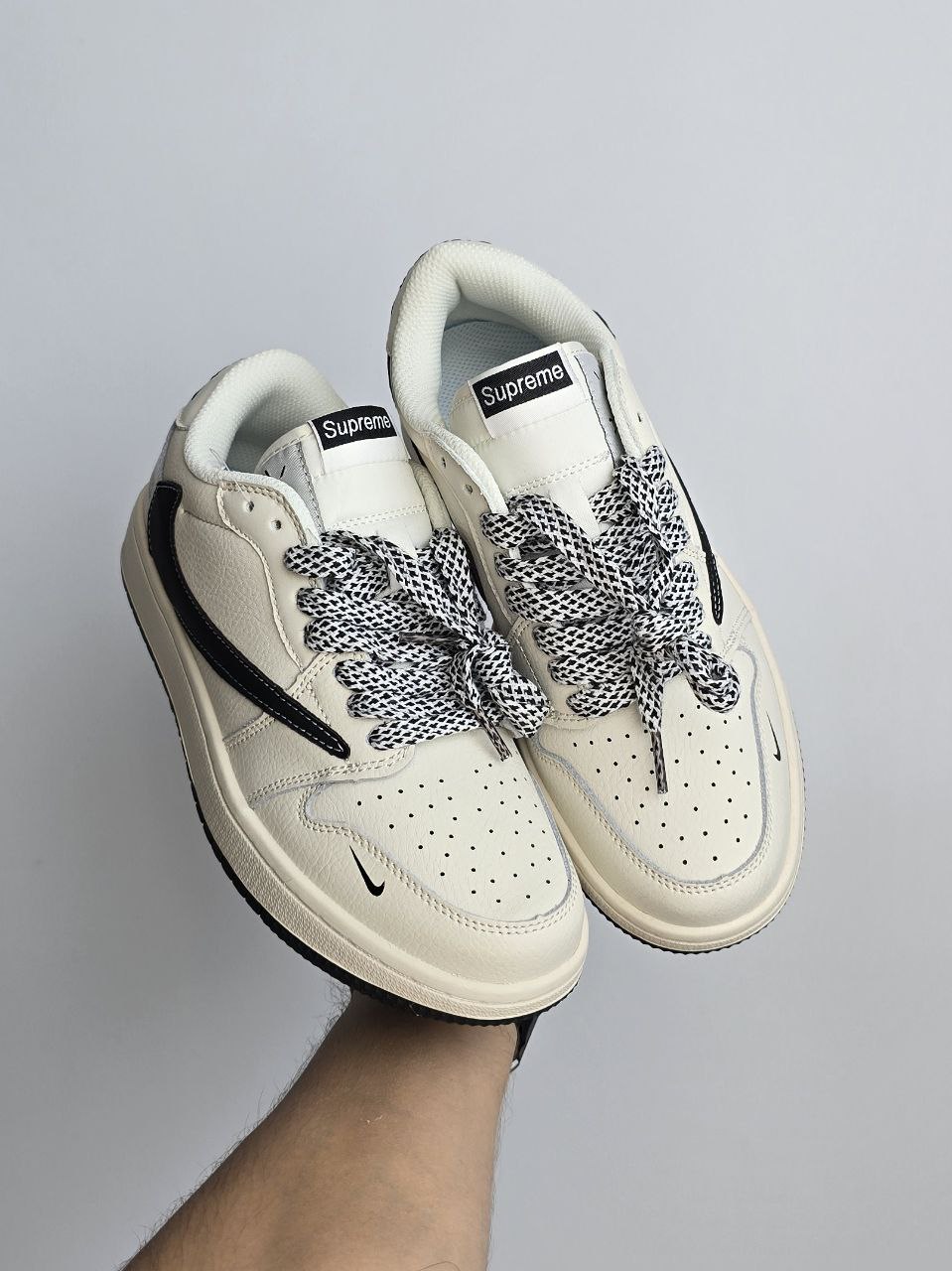 Nike Air Jordan 1 Low ×Travis Scott Milk Black — стильні кросівки у співпраці з Тревісом Скоттом. Модель має впізнаваний перевернутий Swoosh, поєднання чорного та молочно-білого кольору, а також фірмові деталі з логотипом Cactus Jack.