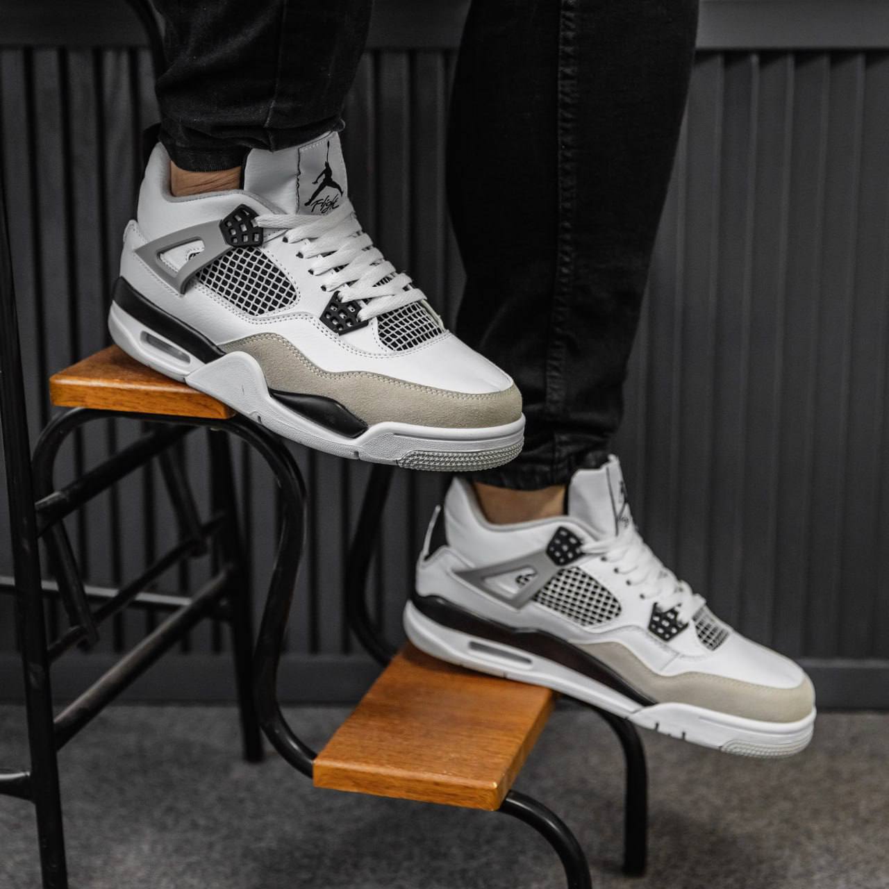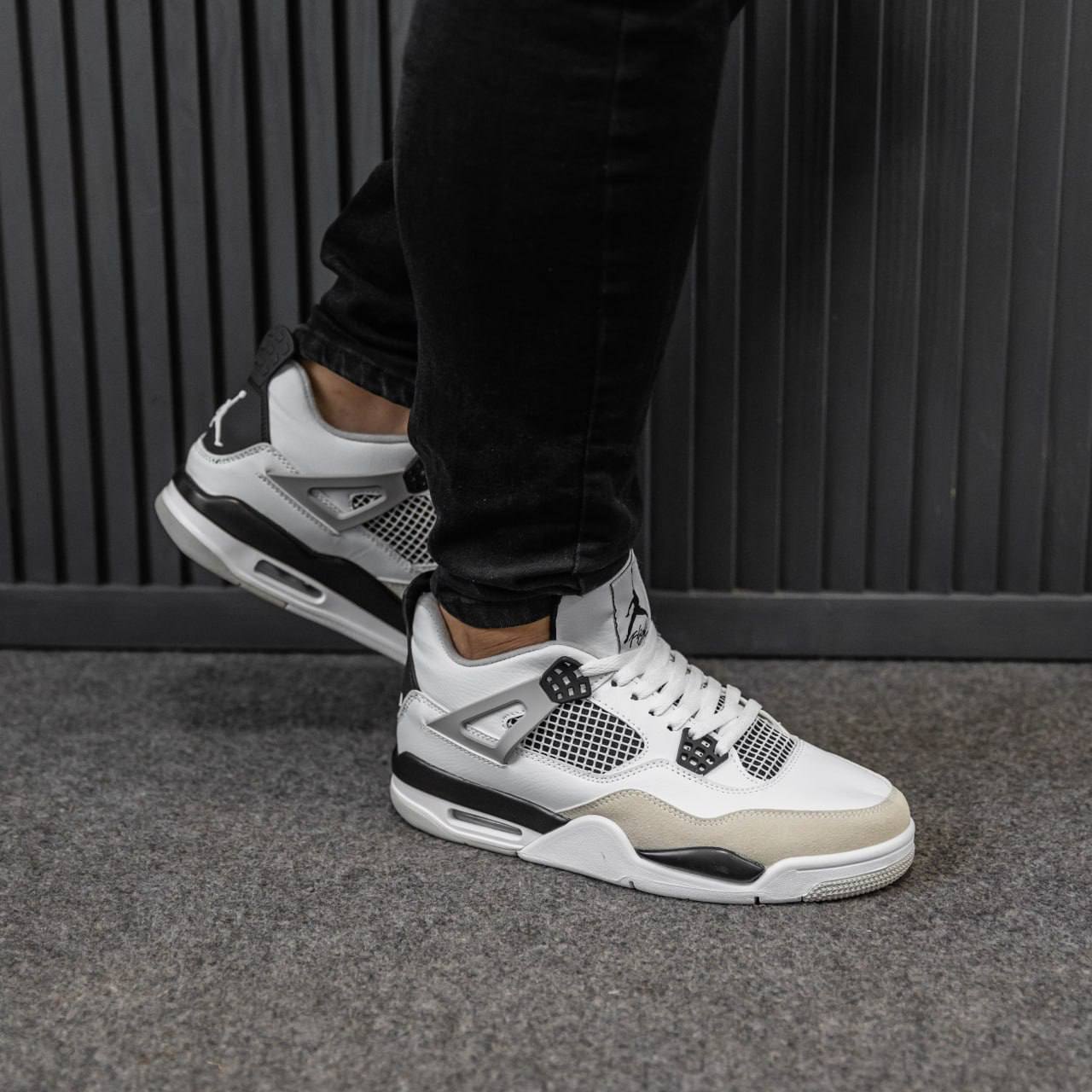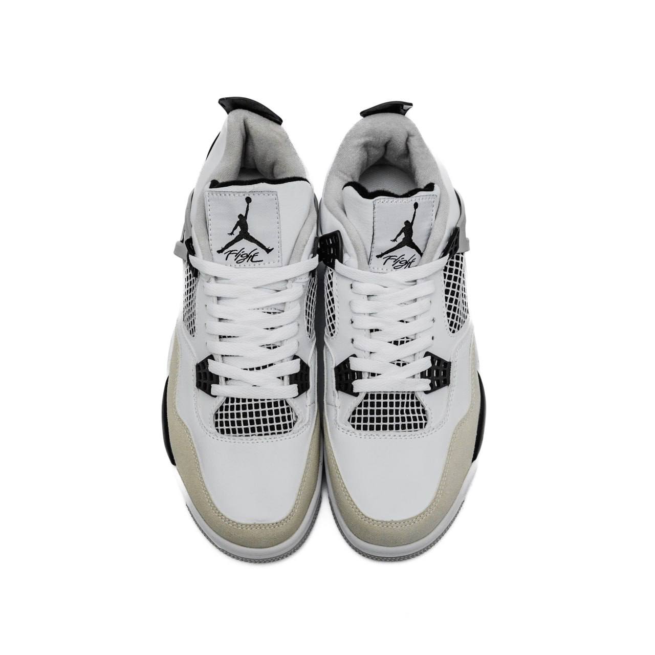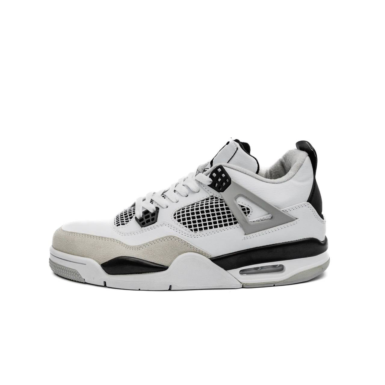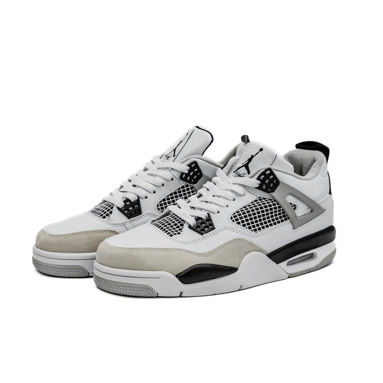 Nike Air Jordan 4 Retro White Black Grey — стильна модель у поєднанні білого, чорного та сірого відтінків із впізнаваним дизайном, що поєднує комфорт і класичний вигляд.