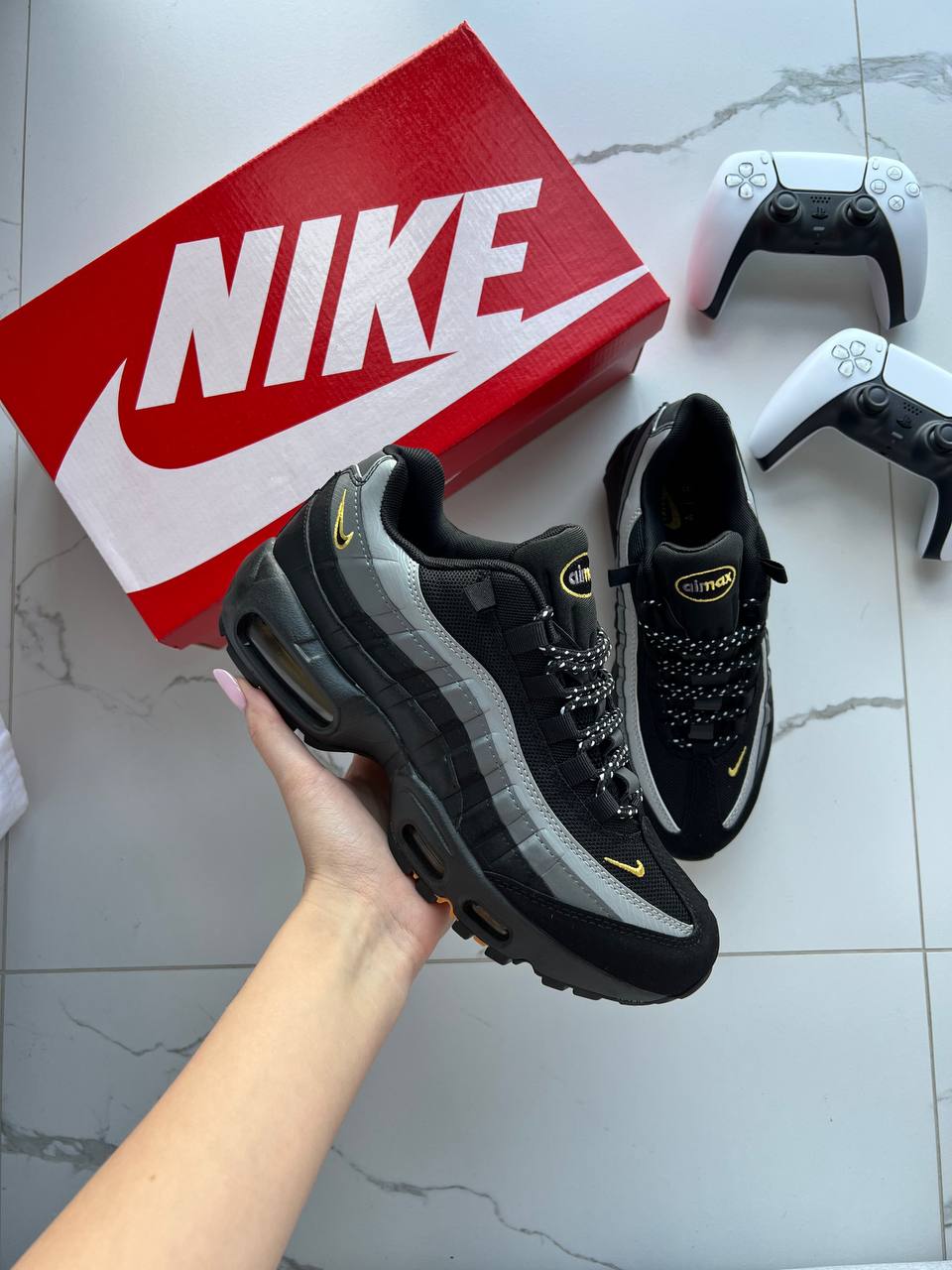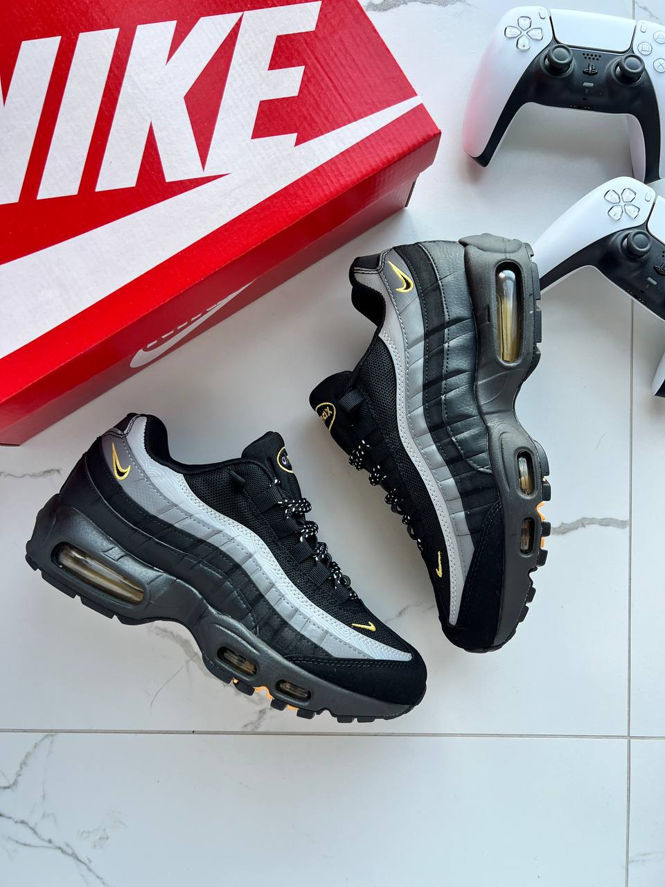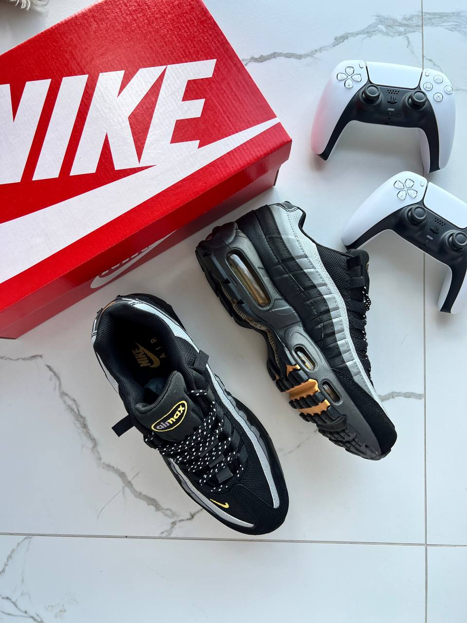 Nike Air Max 95 Black Grey Yellow — виразні кросівки з багатошаровим дизайном у поєднанні чорного, сірого та жовтого кольорів. Модель оснащена фірмовою амортизацією Air Max, що забезпечує комфорт і підтримку протягом усього дня.