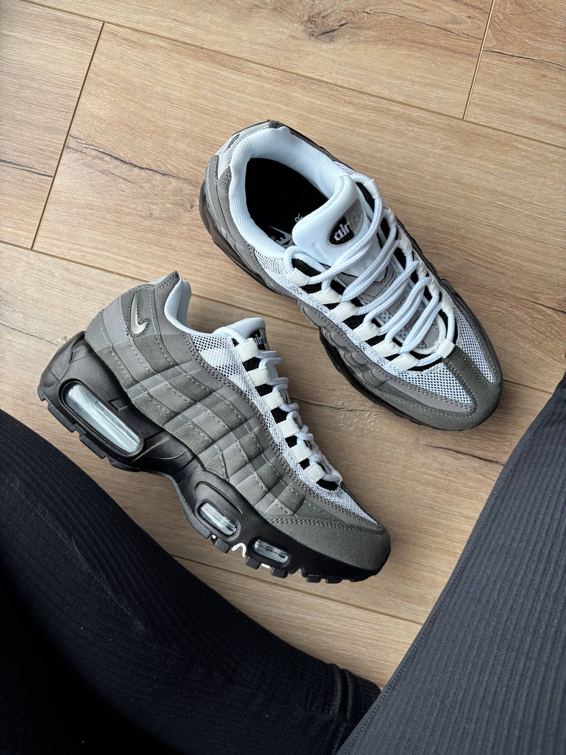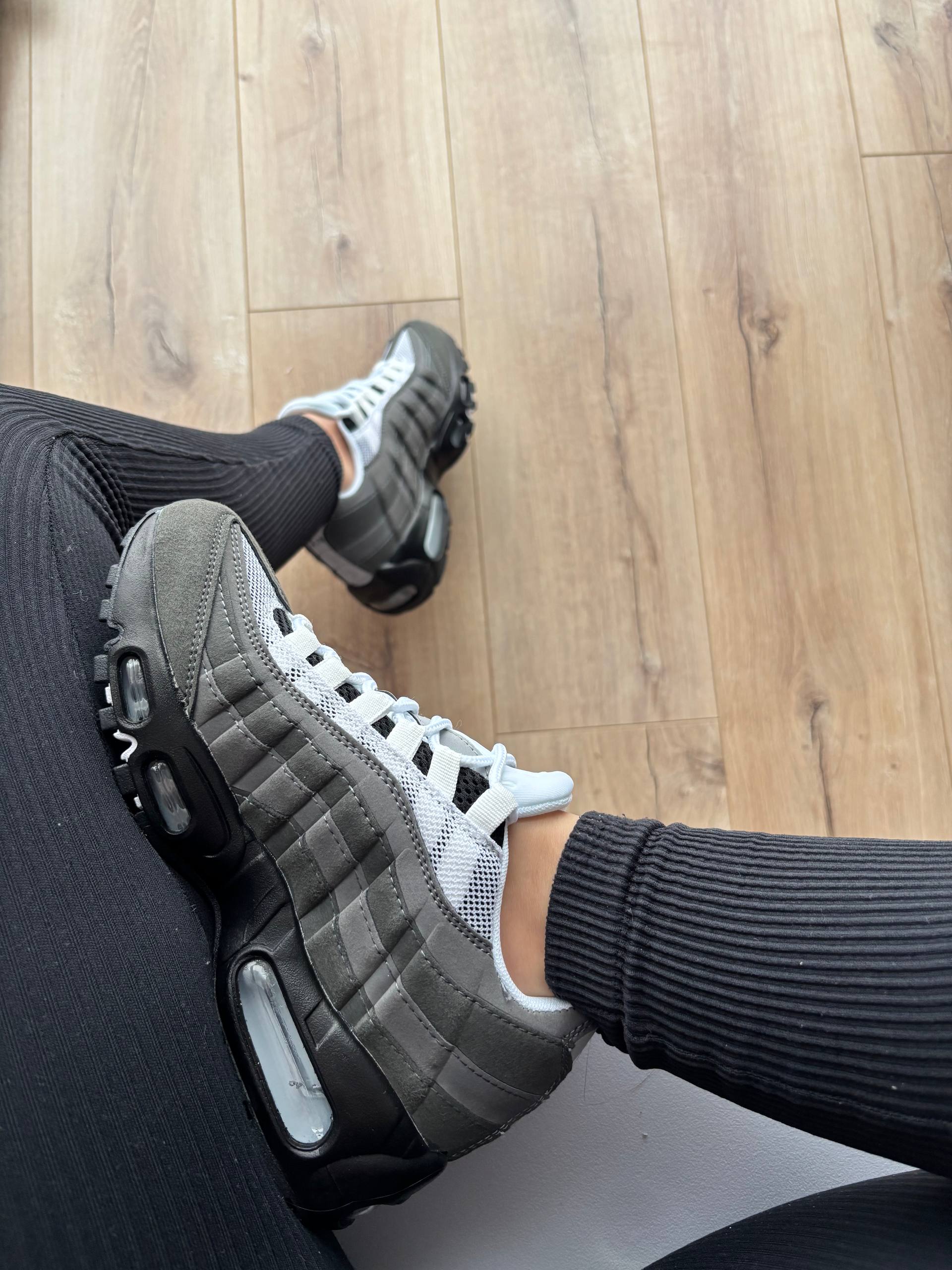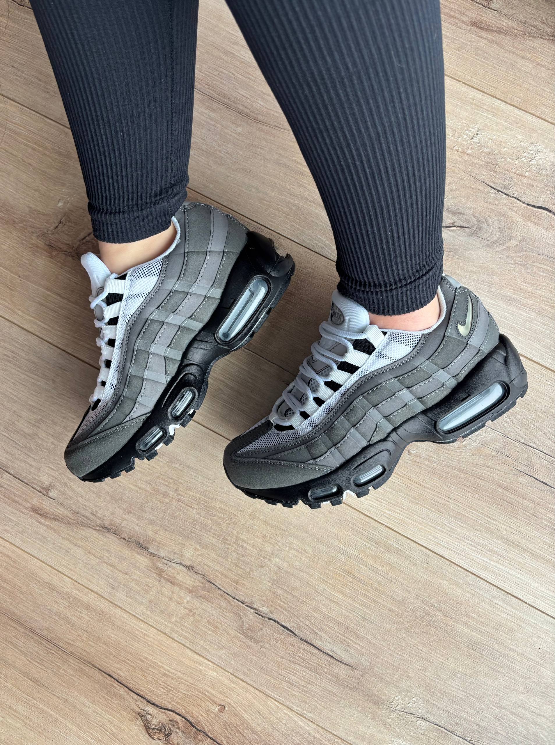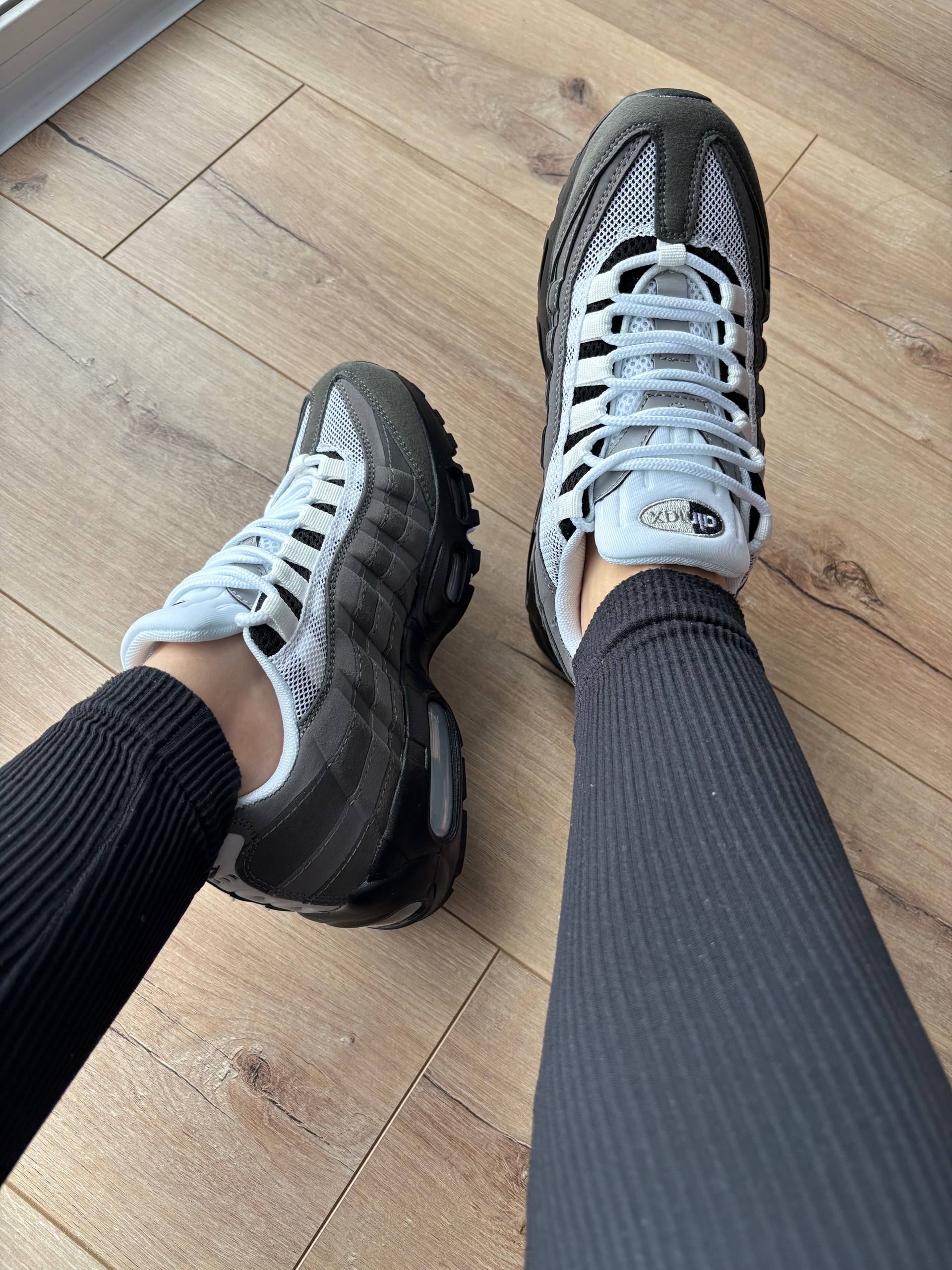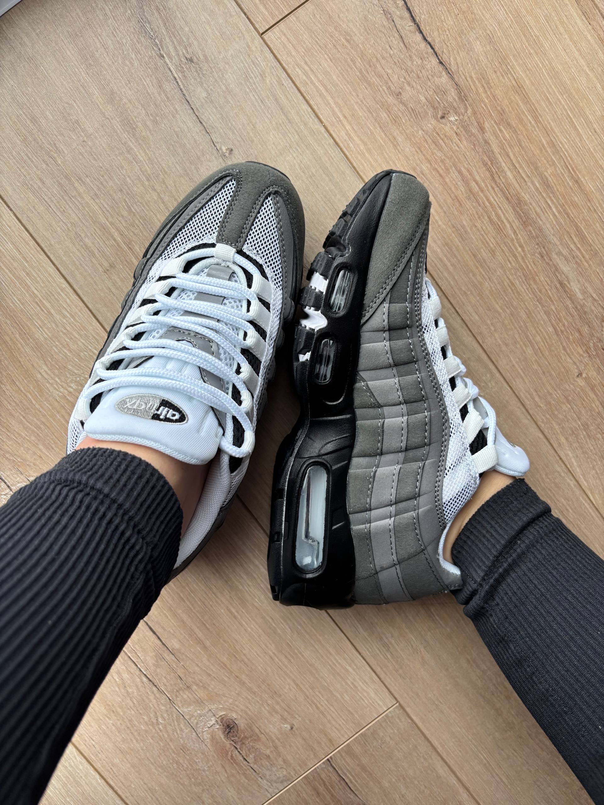 Nike Air Max 95 Dark Grey White — елегантна модель у темно-сірому й білому кольорах, що поєднує культовий дизайн Air Max 95 з фірмовою амортизацією Air Max для підвищеного комфорту, підтримки та стильного вигляду щодня.