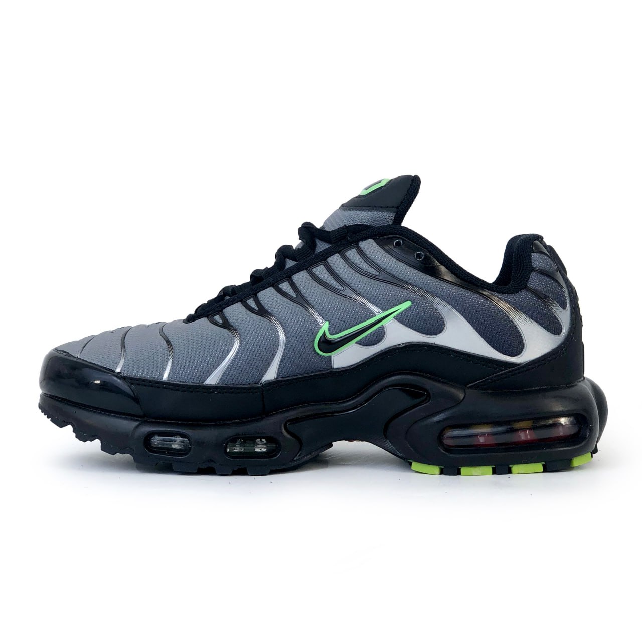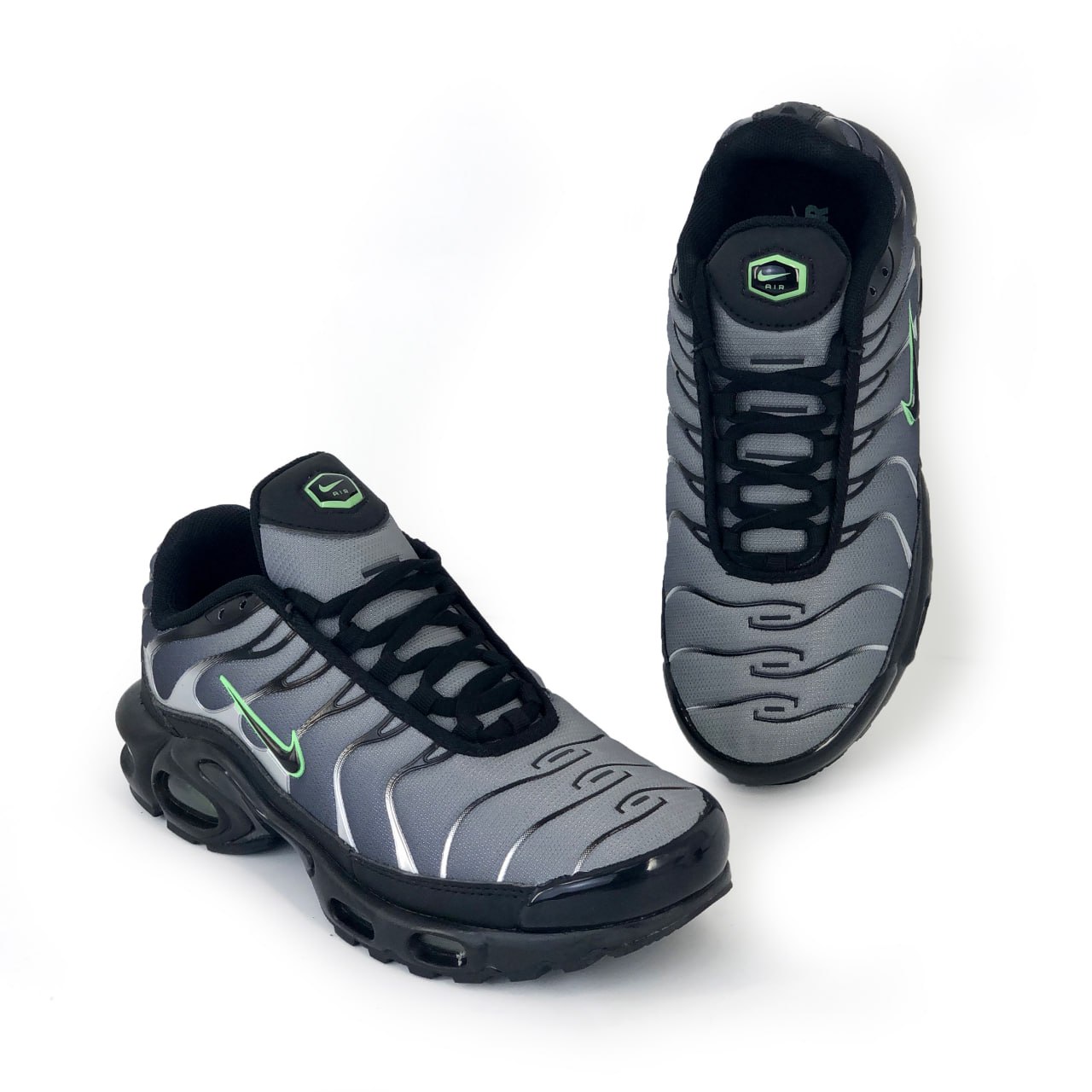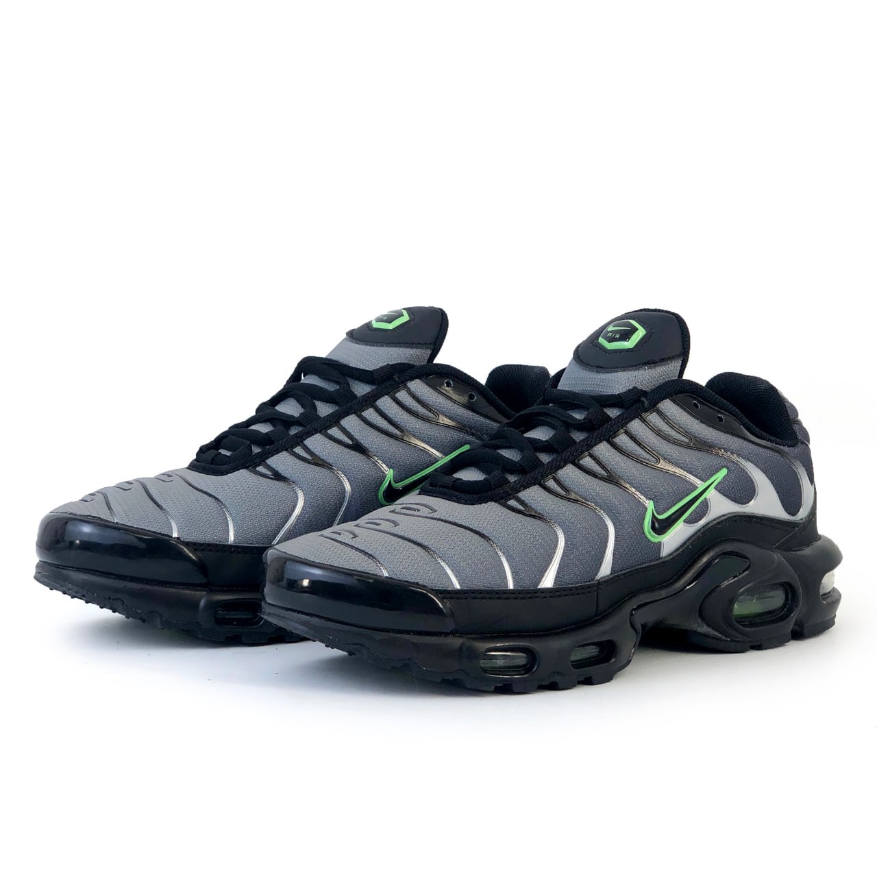 Nike Air Max Plus TN Black Grey Green — динамічна модель з поєднанням чорних і сірих відтінків, доповнених яскраво-зеленими акцентами, що підкреслюють спортивний характер і впізнаваний дизайн серії.