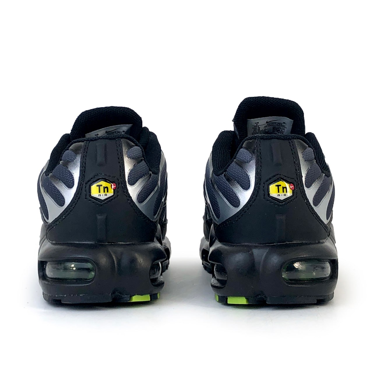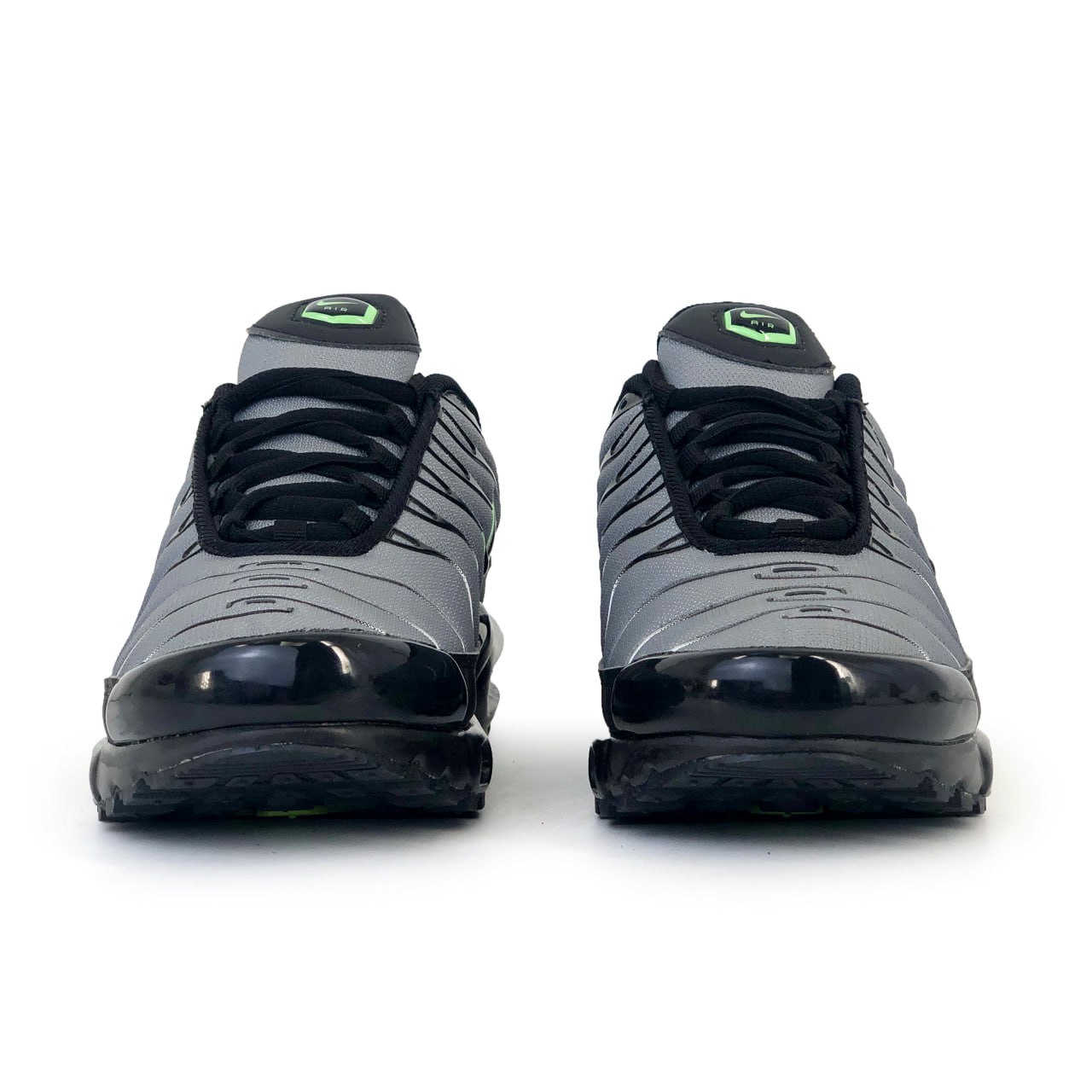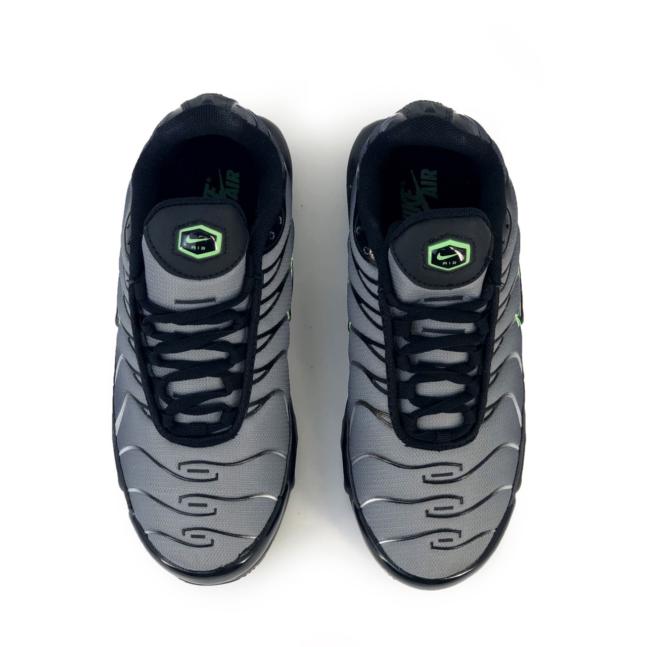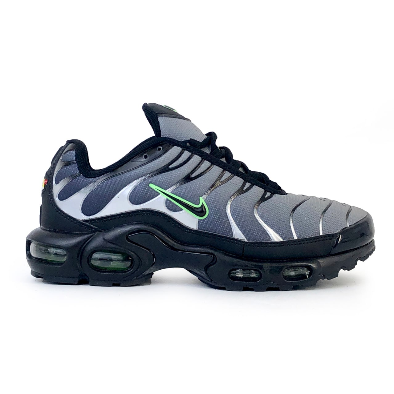 Nike Air Max Plus TN Black Grey Green — динамічна модель з поєднанням чорних і сірих відтінків, доповнених яскраво-зеленими акцентами, що підкреслюють спортивний характер і впізнаваний дизайн серії.
