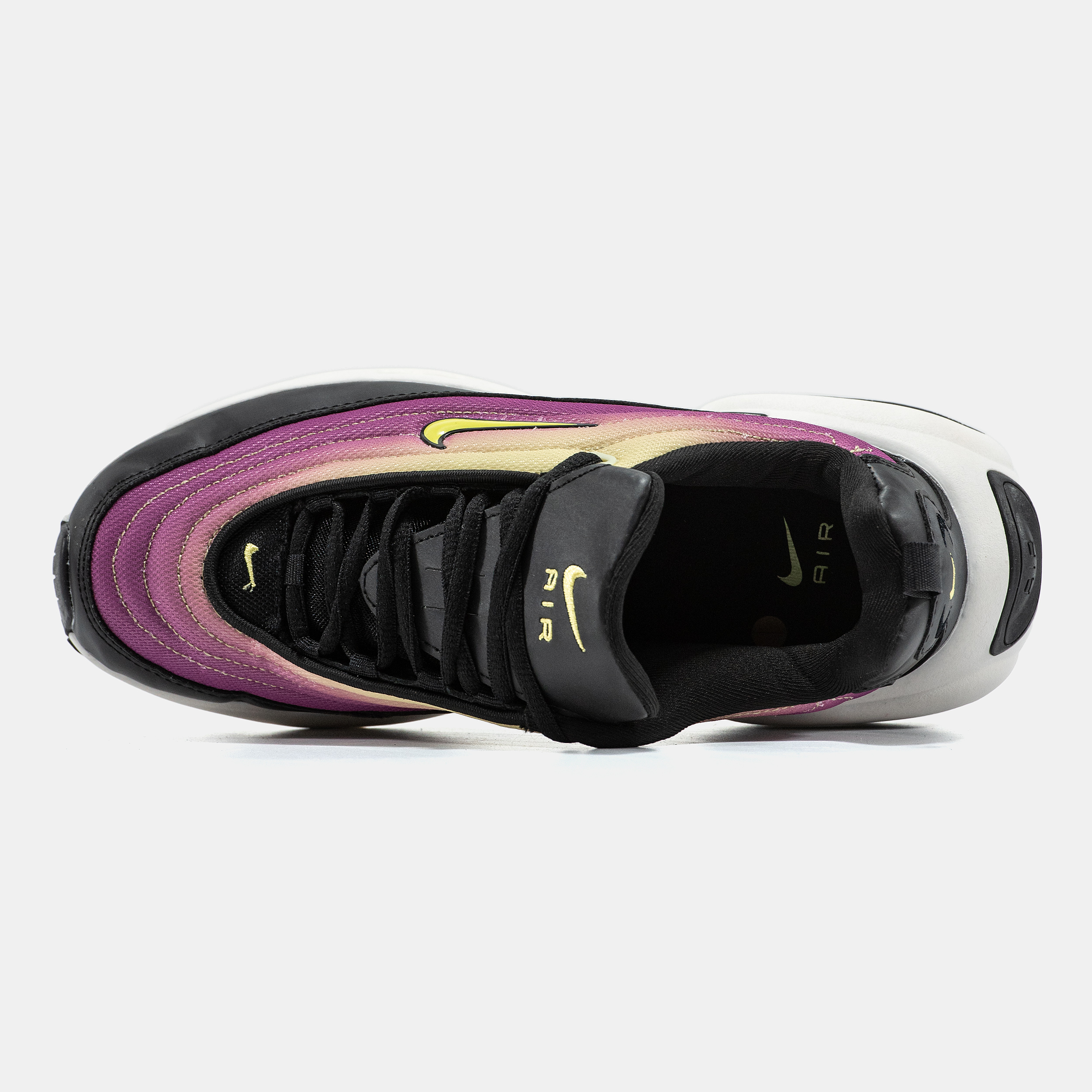 Nike Air Max Portal Black Yellow — динамічна модель у поєднанні чорного, фіолетового та жовтого кольорів, що поєднує сучасний дизайн, амортизацію та комфорт під час руху.