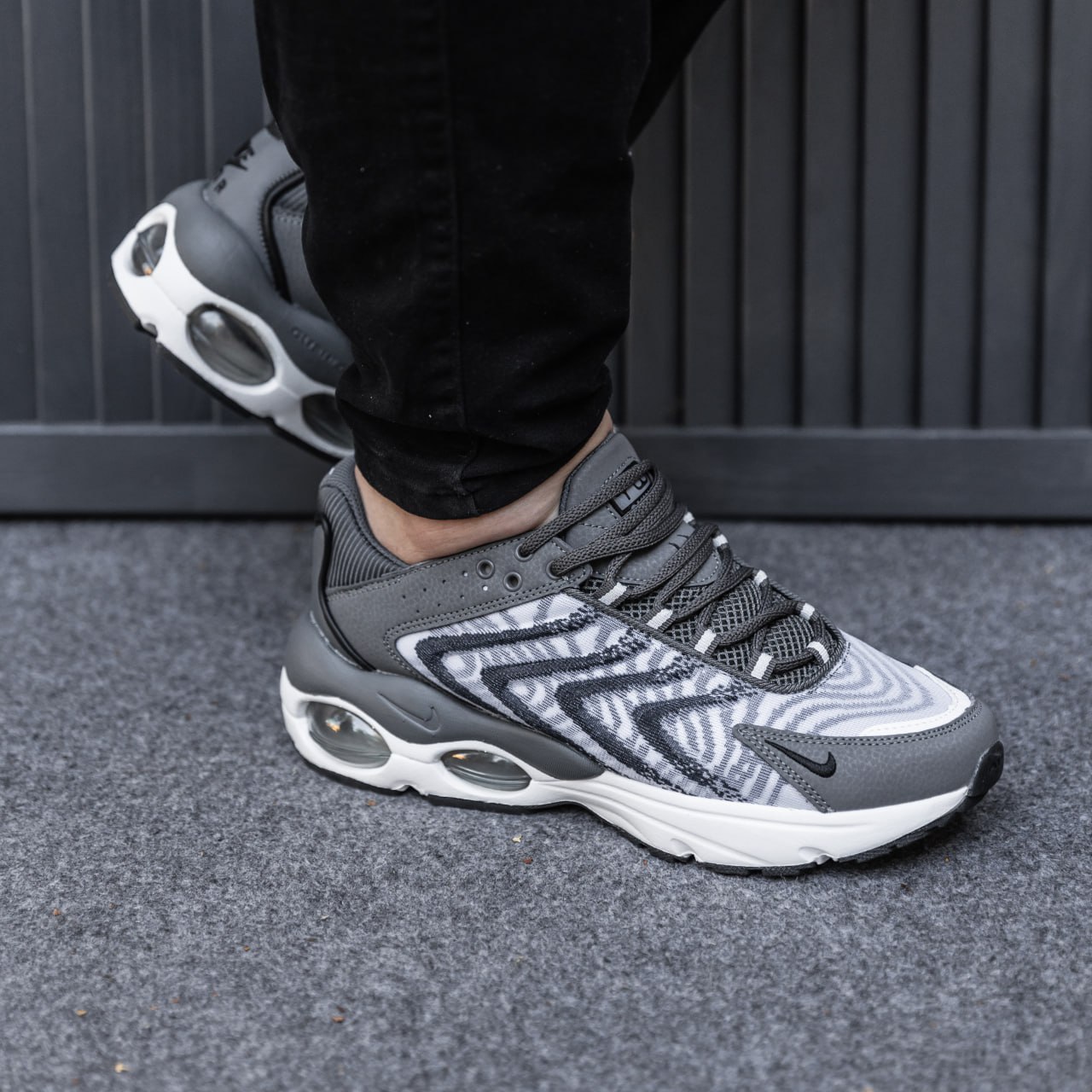 Nike Air Max TW Grey White — сучасні кросівки з динамічним силуетом у сірій та білій гамі, що поєднують спортивний стиль і комфорт для щоденного використання.