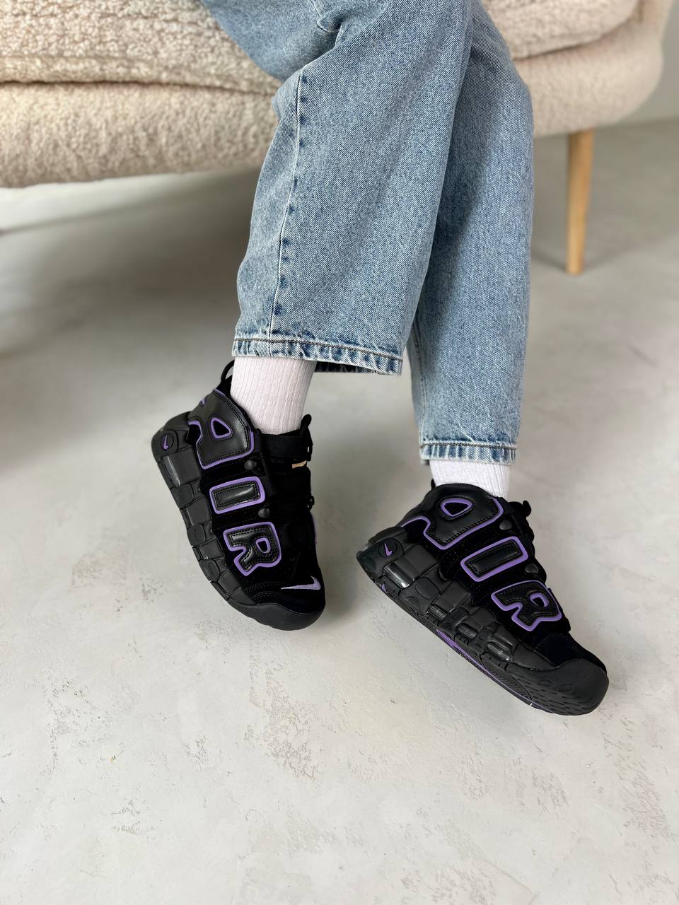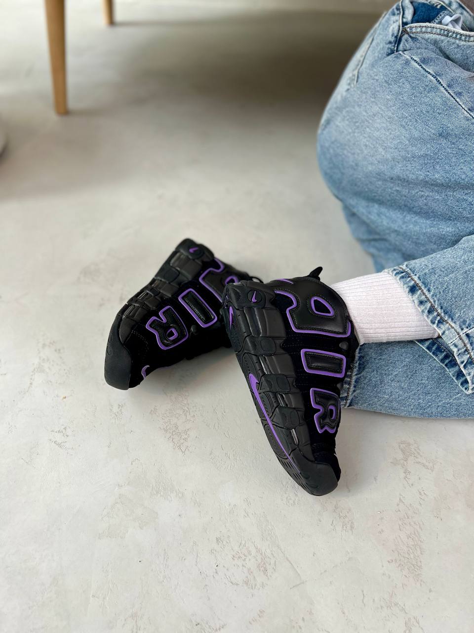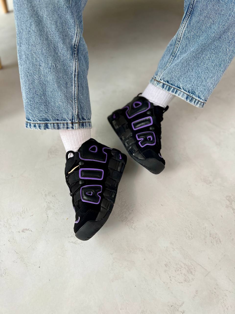 Nike Air More Uptempo Black Purple — стильна модель у поєднанні чорного та фіолетового відтінків із впізнаваним об’ємним дизайном, що поєднує комфорт і виразний стиль.