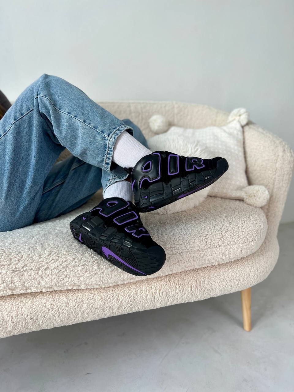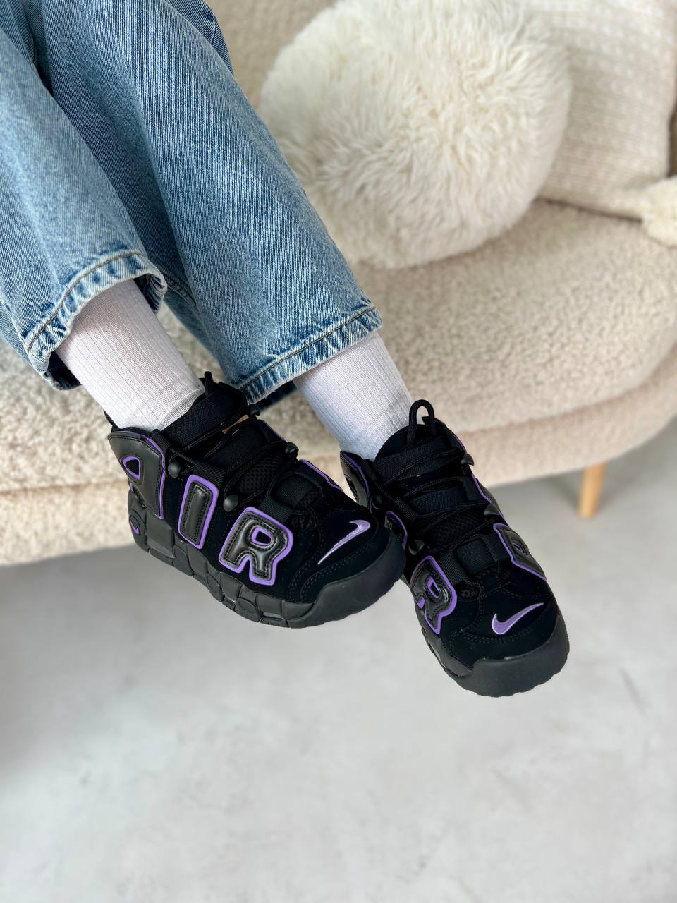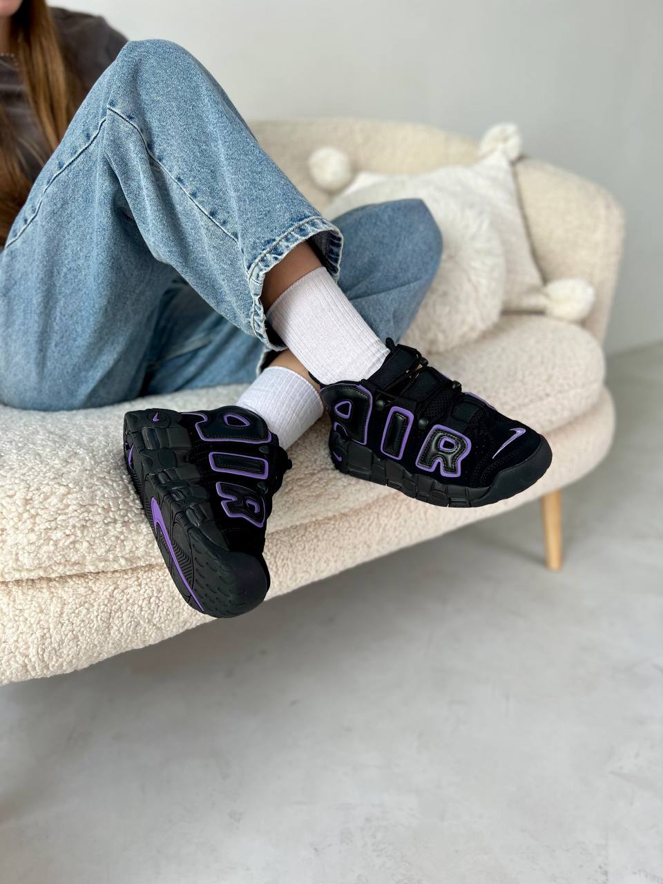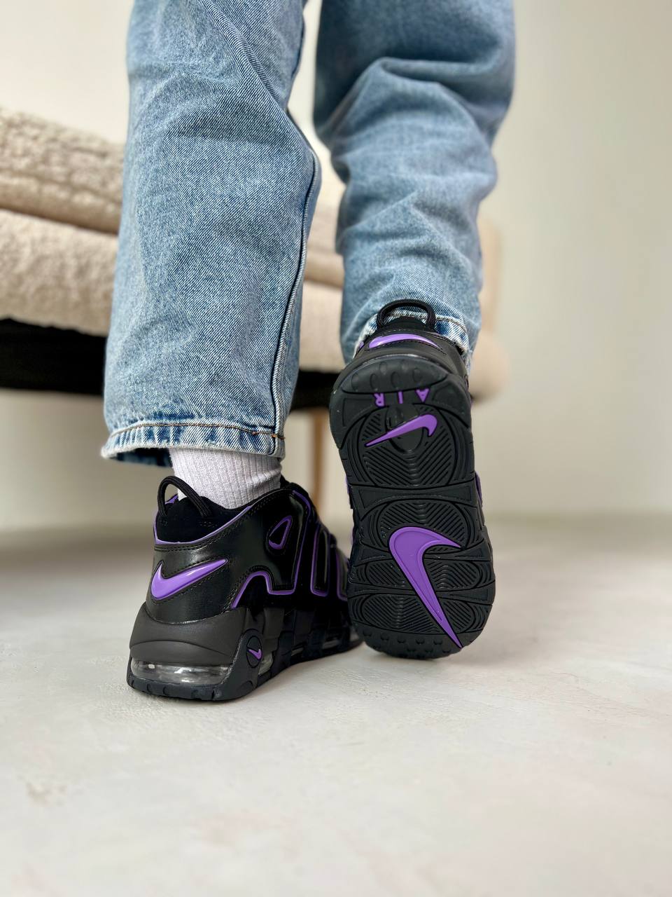 Nike Air More Uptempo Black Purple — стильна модель у поєднанні чорного та фіолетового відтінків із впізнаваним об’ємним дизайном, що поєднує комфорт і виразний стиль.