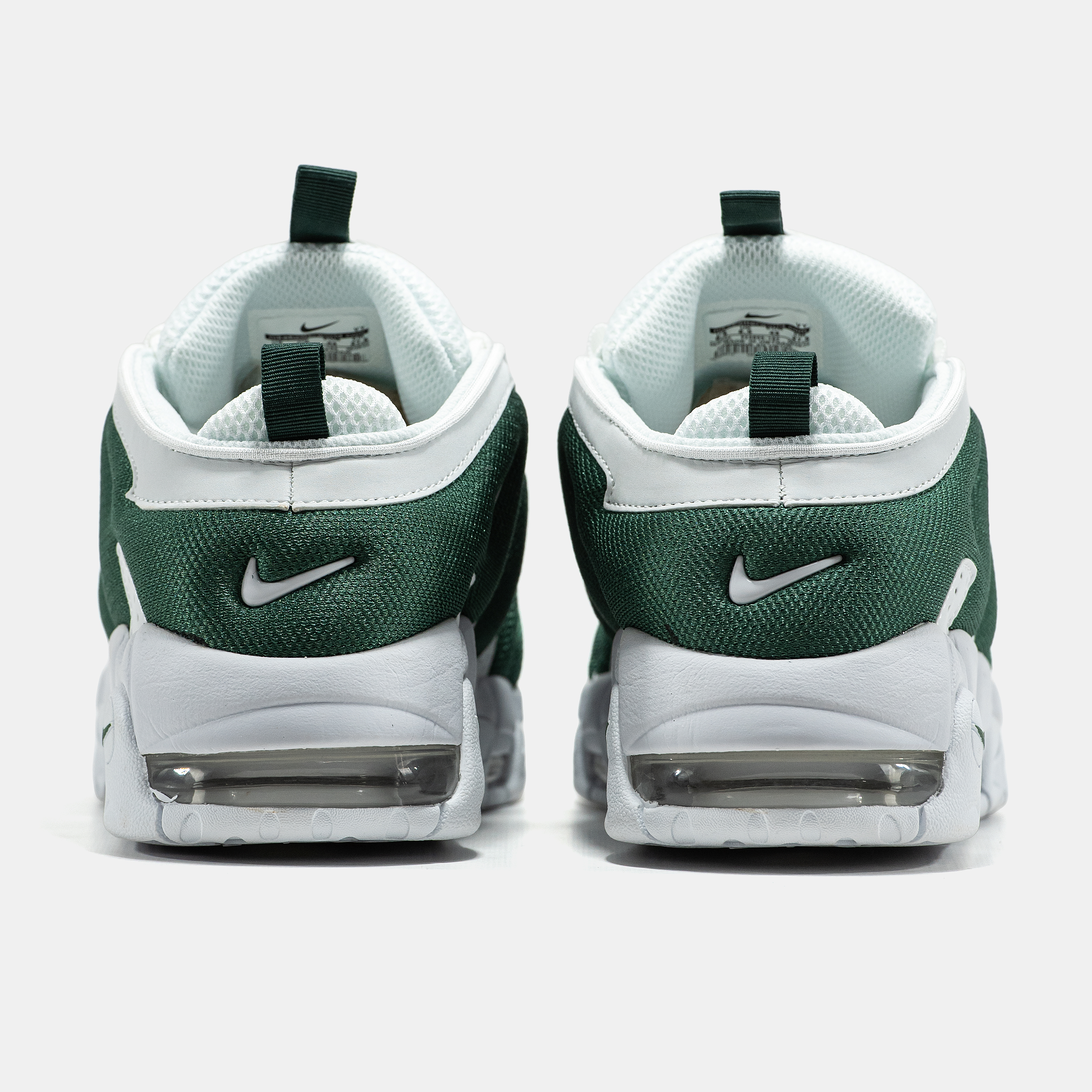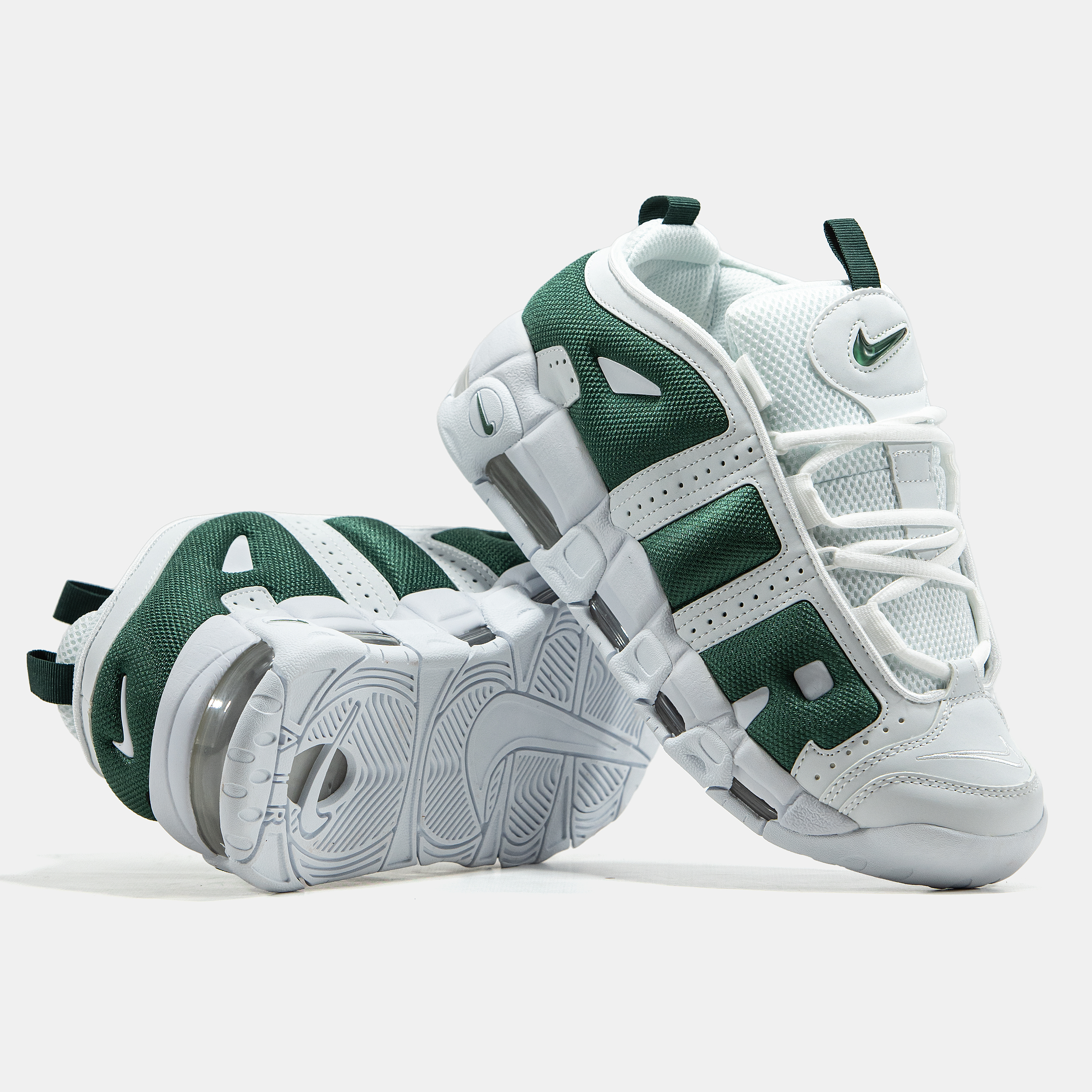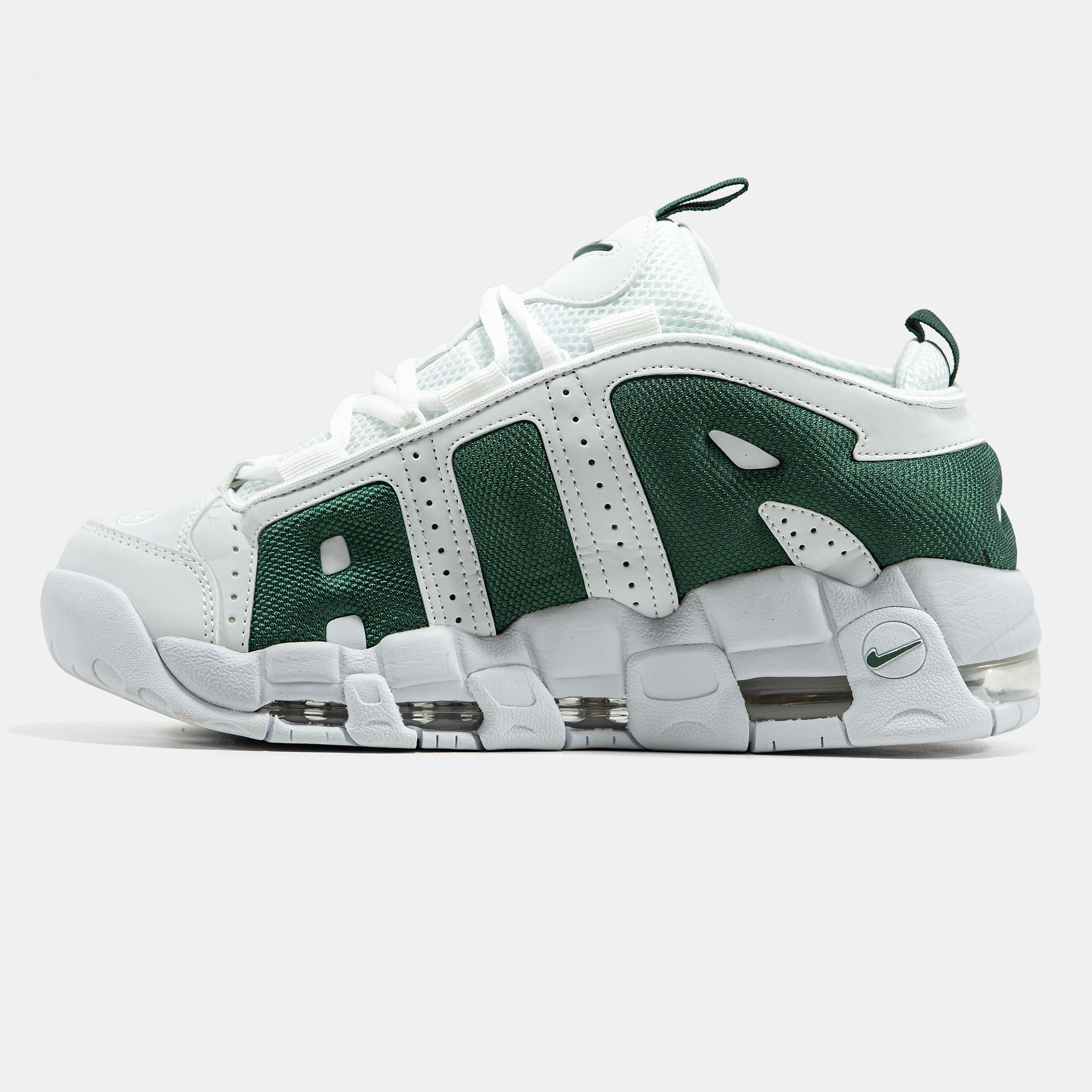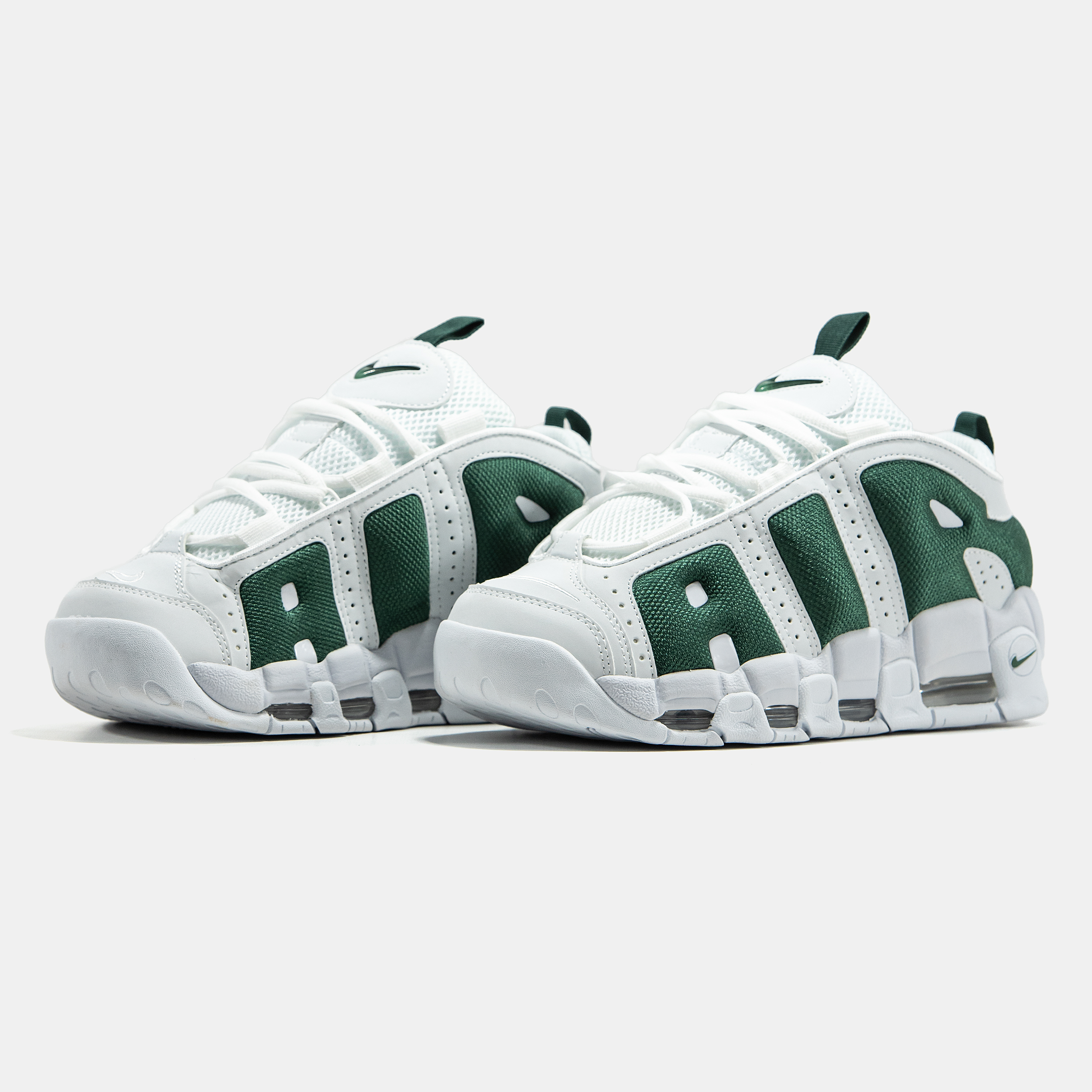 Nike Air More Uptempo Low White Green — низька версія культової моделі у білому кольорі з зеленими акцентами, що поєднує масивний силует, комфортну посадку та виразний спортивний характер.