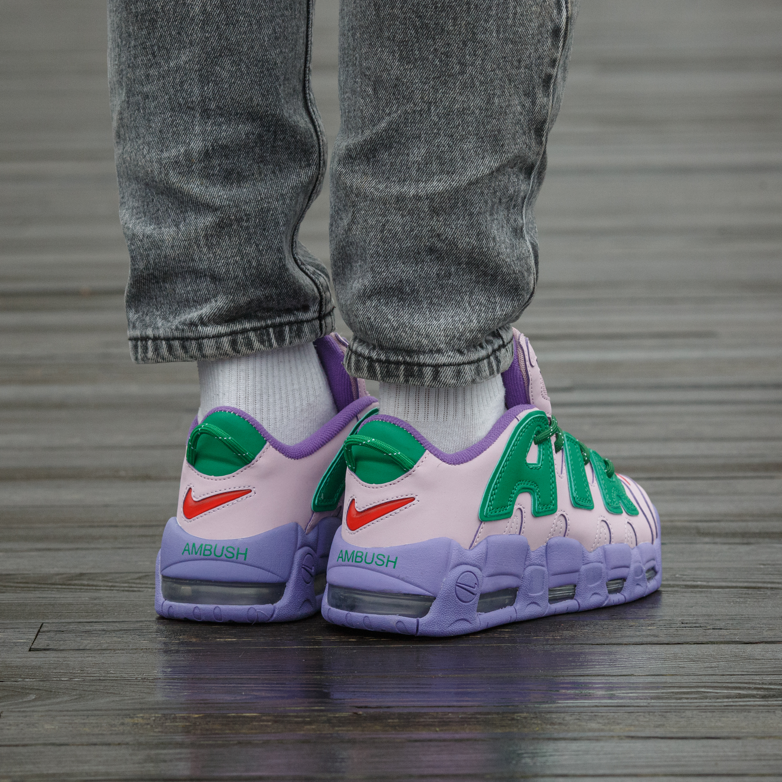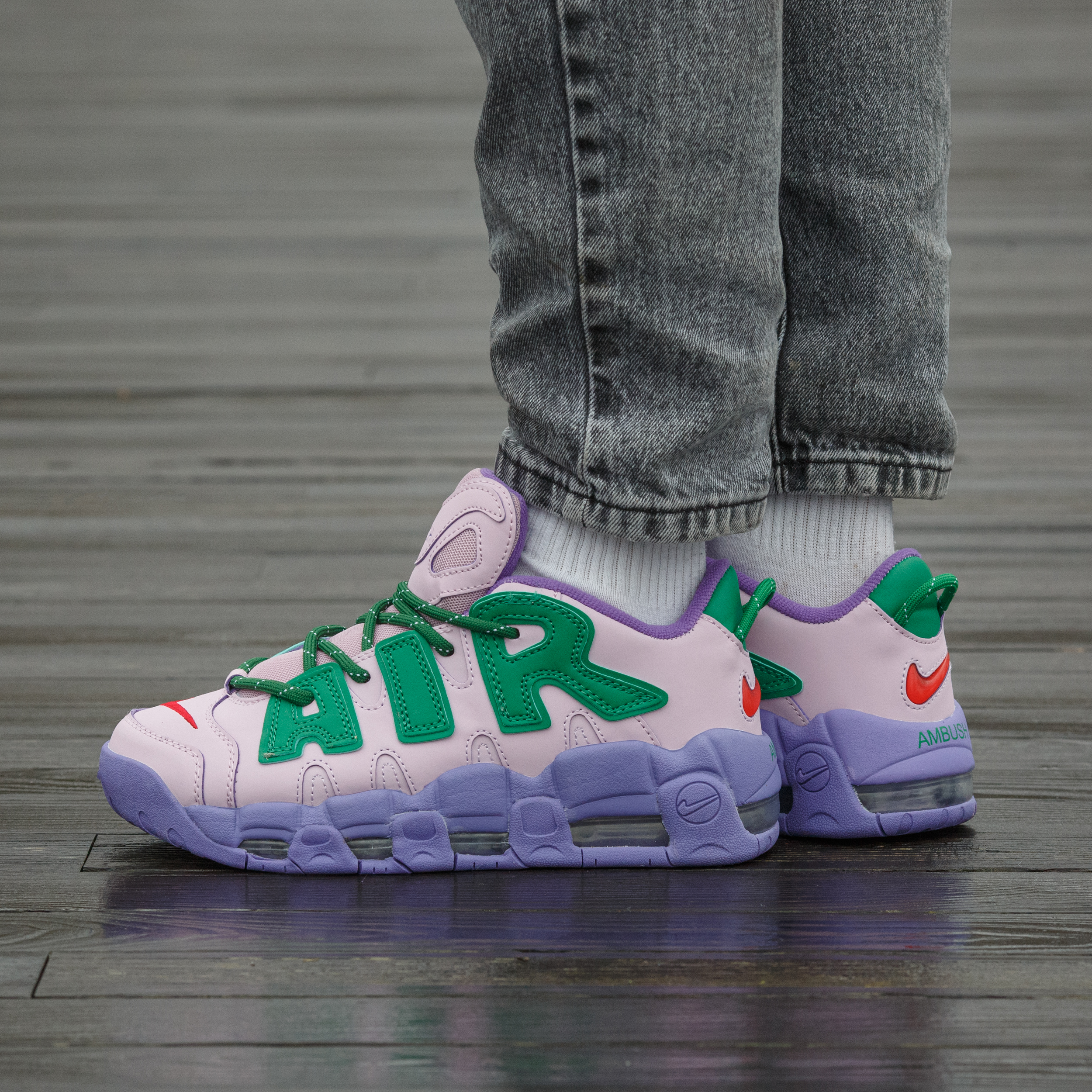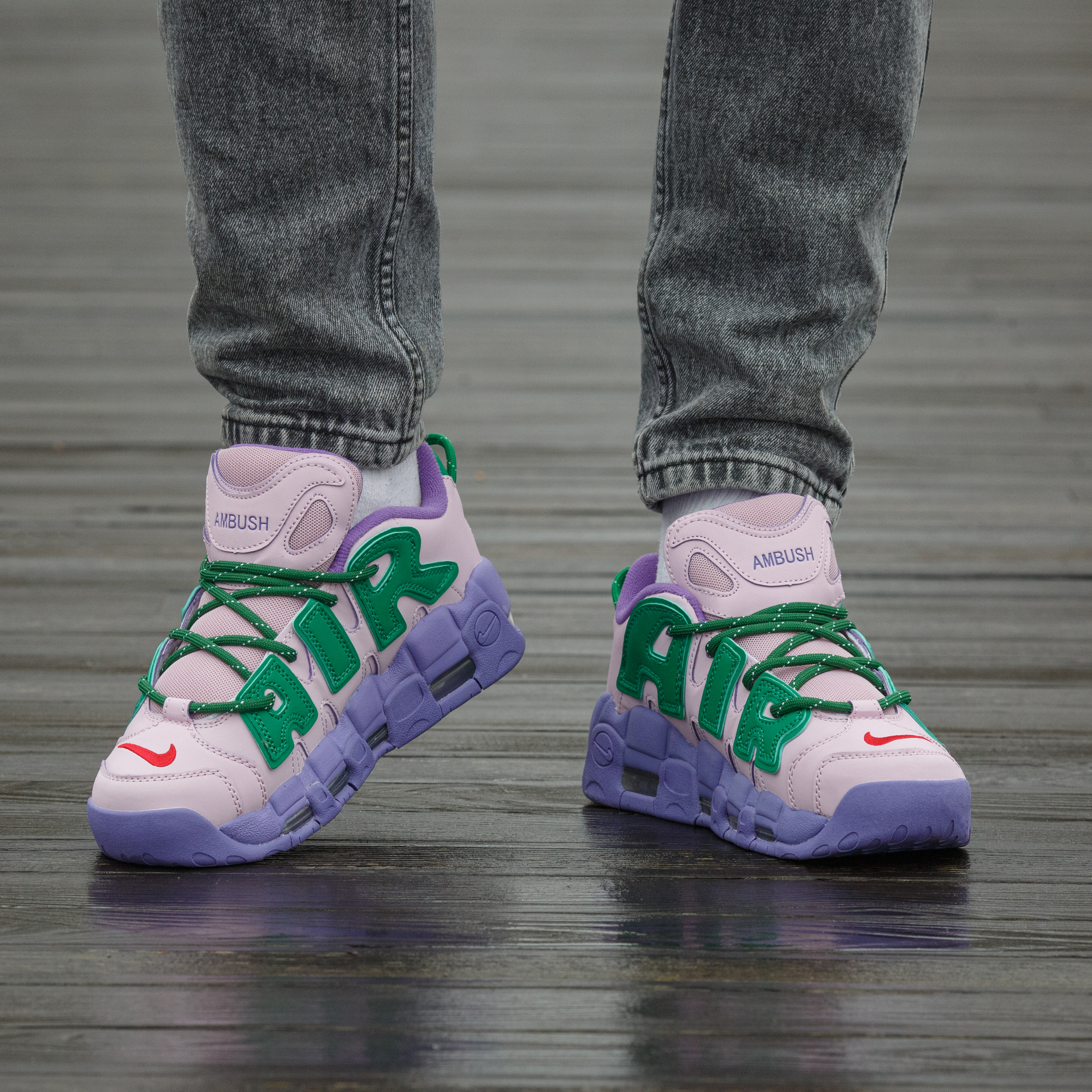 Nike Air More Uptempo Low x AMBUSH Pink Purple Green — яскрава колабораційна модель у рожево-фіолетово-зеленій гамі з виразним брендингом, що поєднує сміливий стрітстайл-дизайн, масивний силует та амортизацію Air для максимального комфорту й ефектного образу.