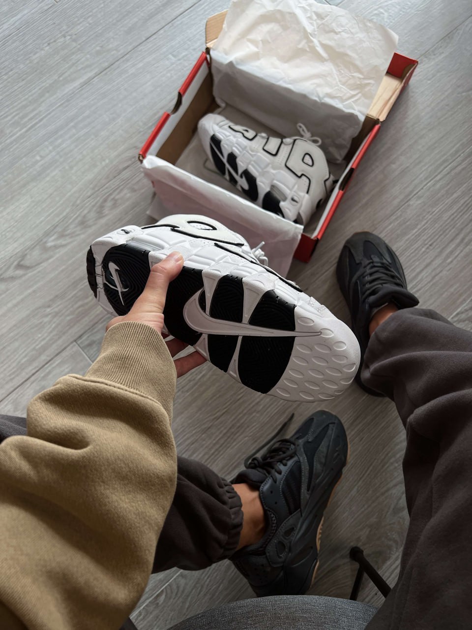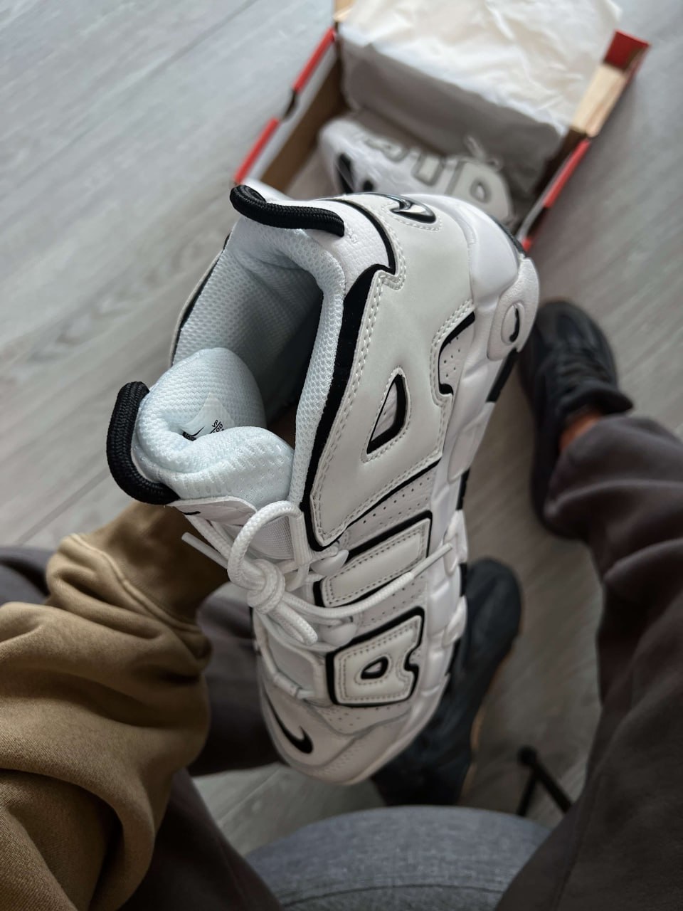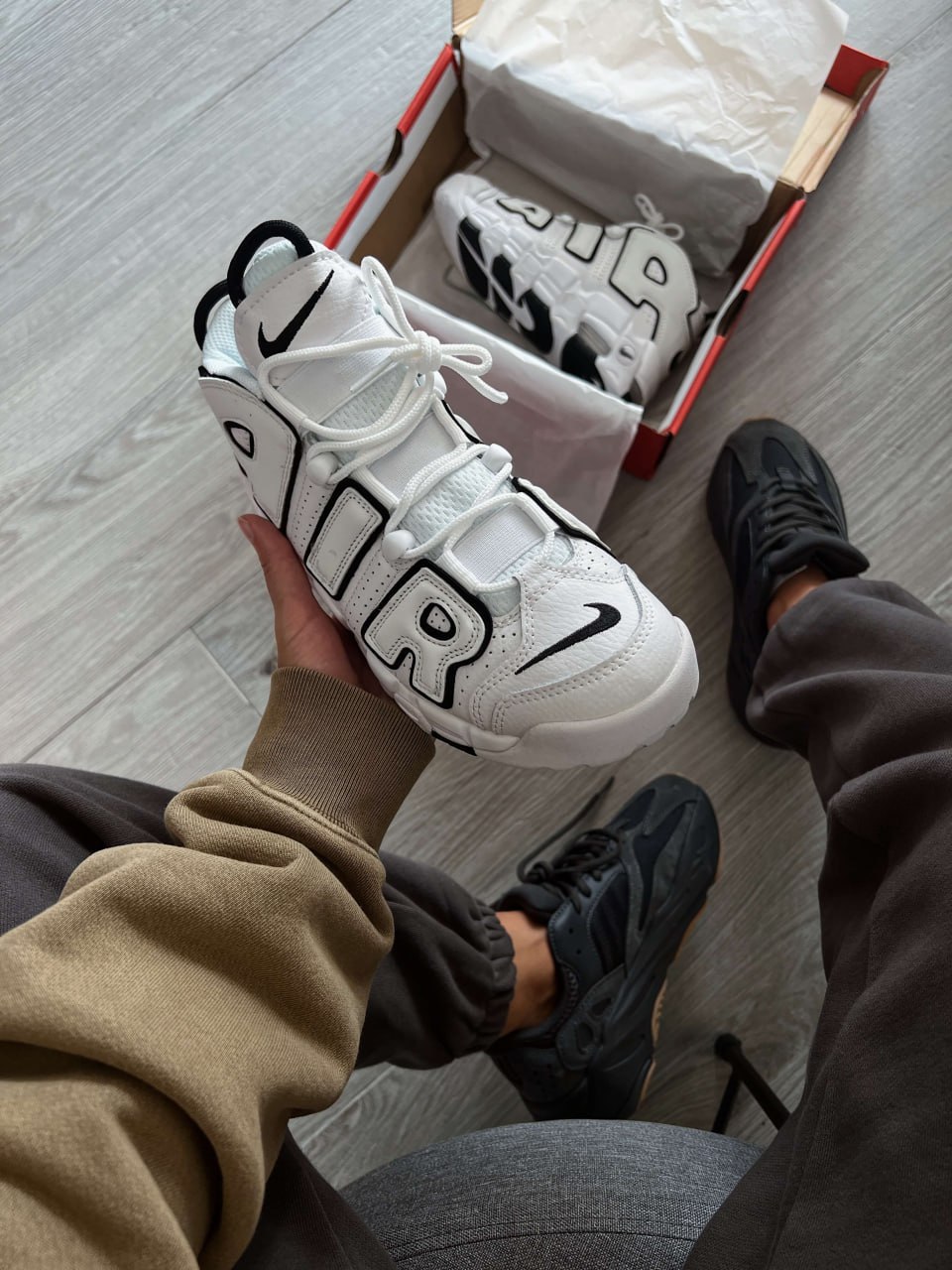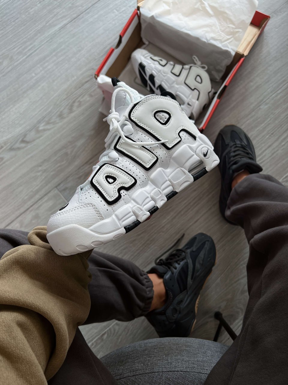 Nike Air More Uptempo ‘White Black’ — легендарна біла модель із масивними літерами AIR, підкресленими чорним контуром, що надає силуету виразності та впізнаваного стилю.