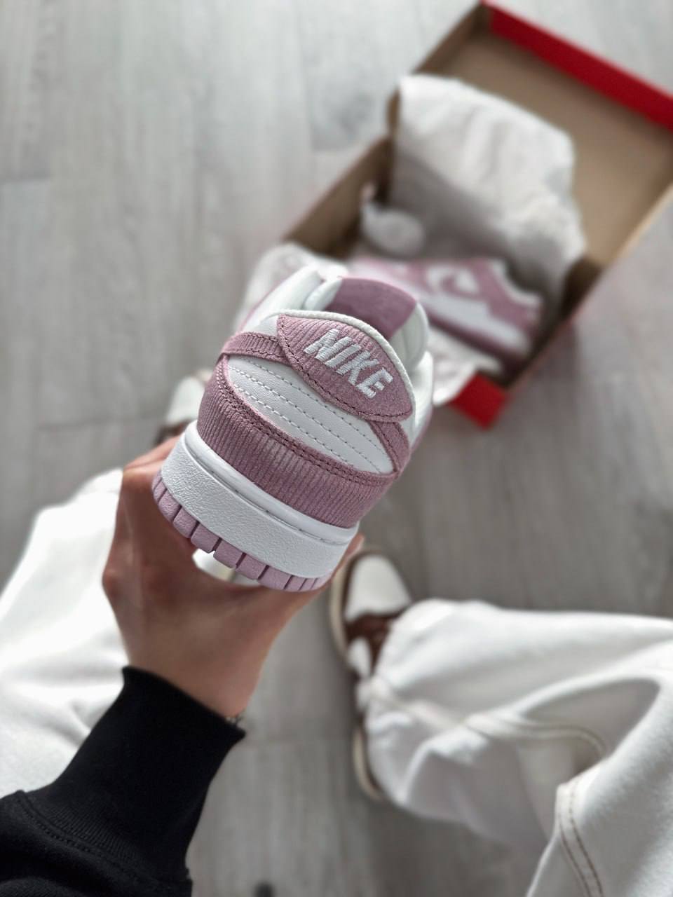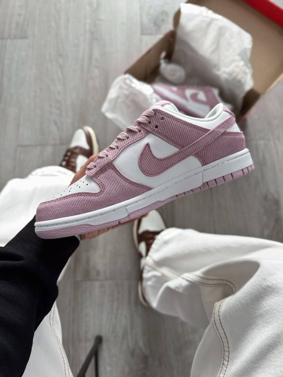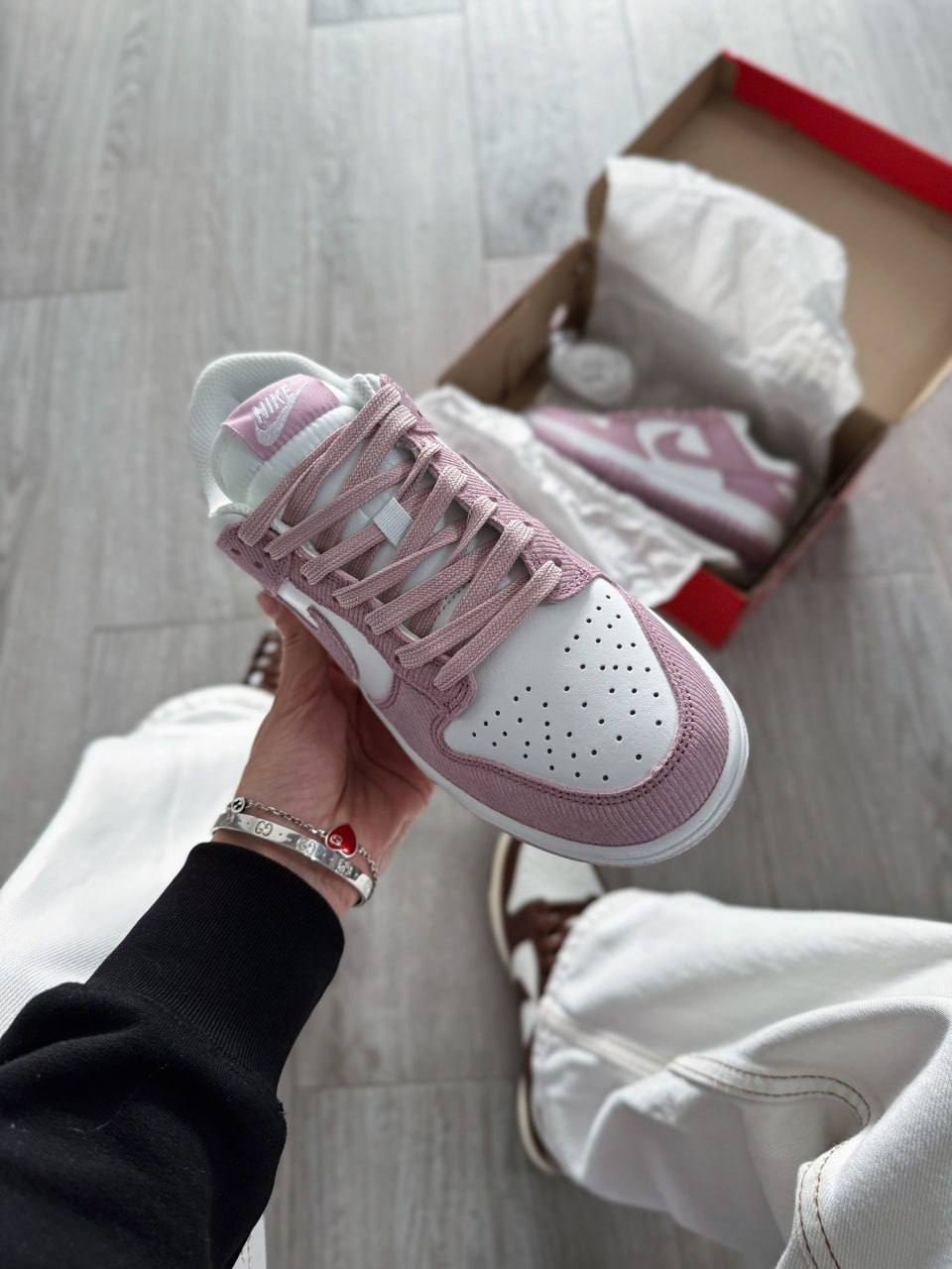 Nike Dunk Low Pink Corduroy — це жіночі кросівки з білим шкіряним верхом, рожевими вельветовими накладками, рожевими шнурками та підошвою, що поєднують класичний дизайн з текстурованими деталями.
