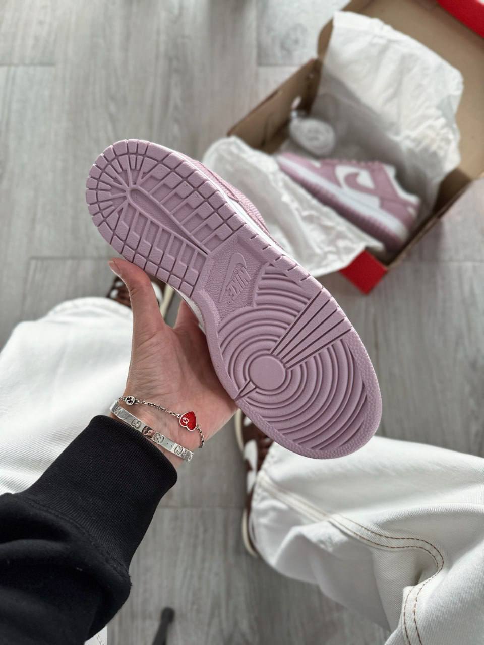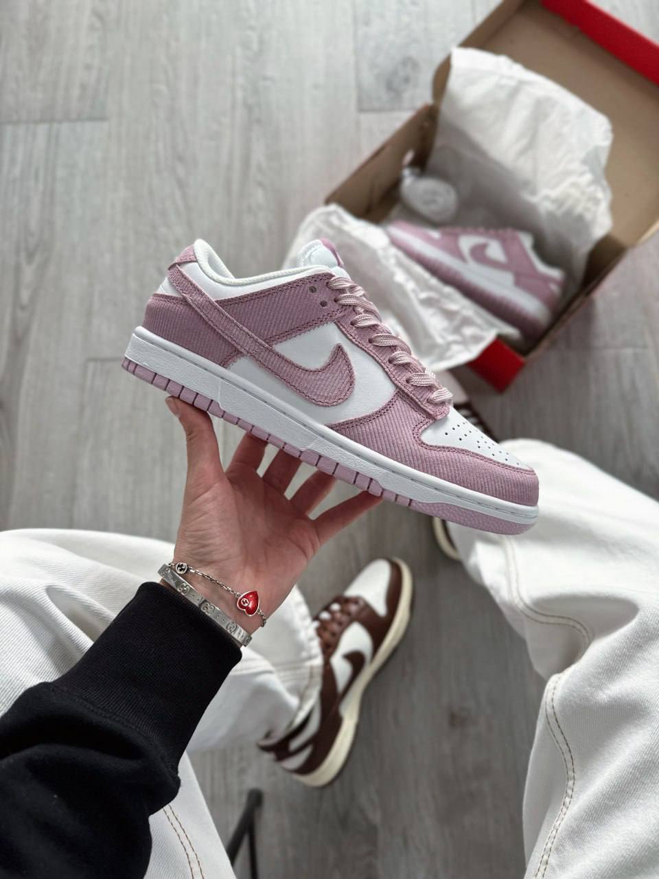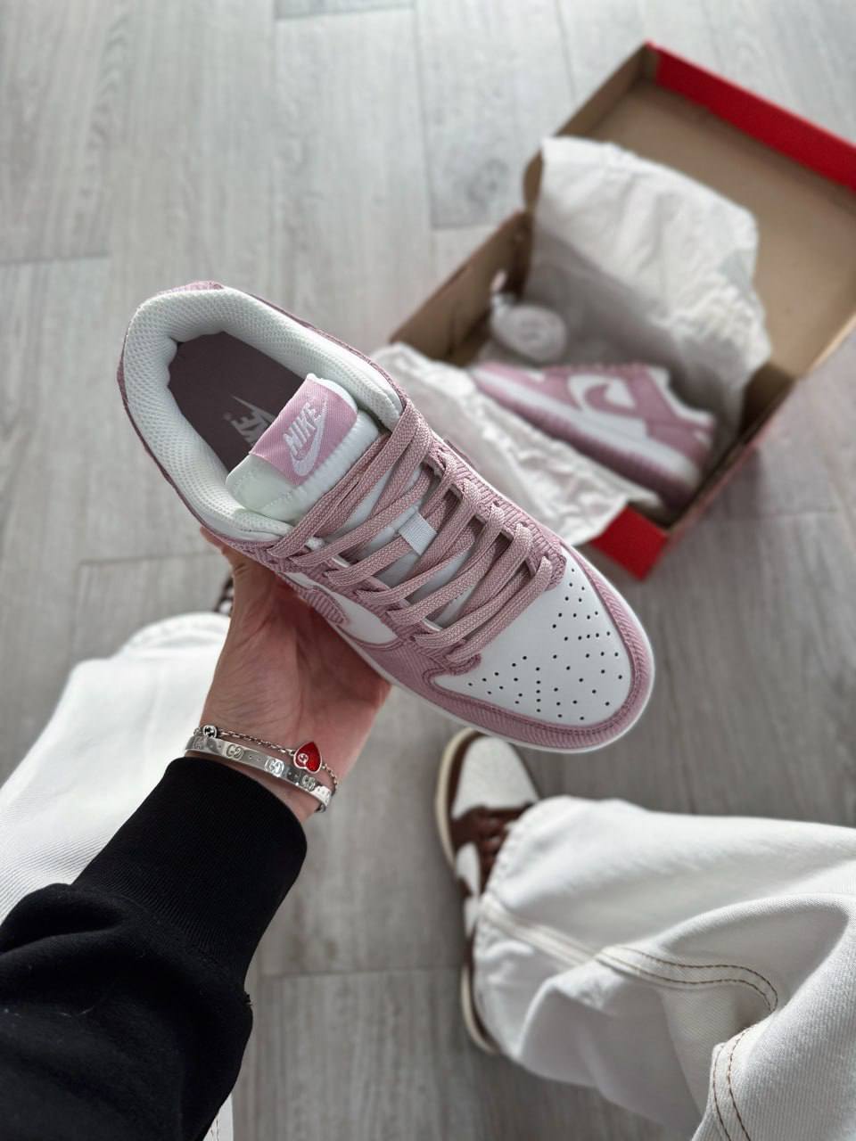 Nike Dunk Low Pink Corduroy — це жіночі кросівки з білим шкіряним верхом, рожевими вельветовими накладками, рожевими шнурками та підошвою, що поєднують класичний дизайн з текстурованими деталями.