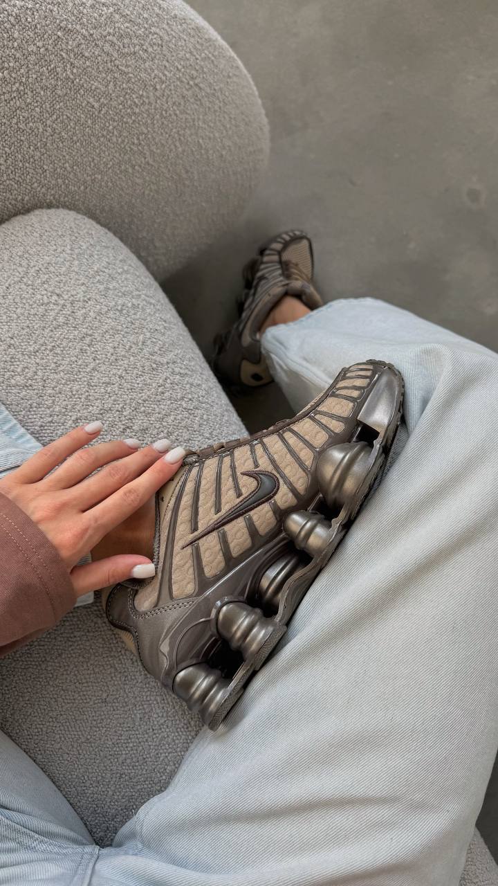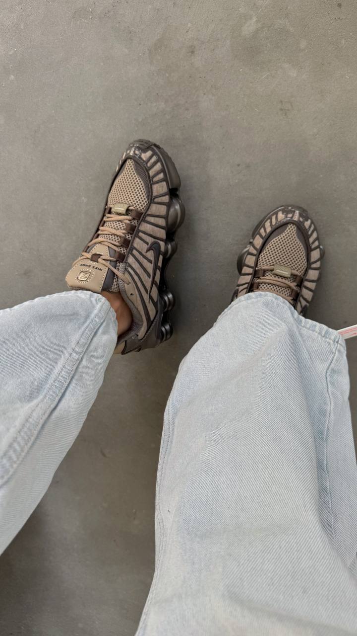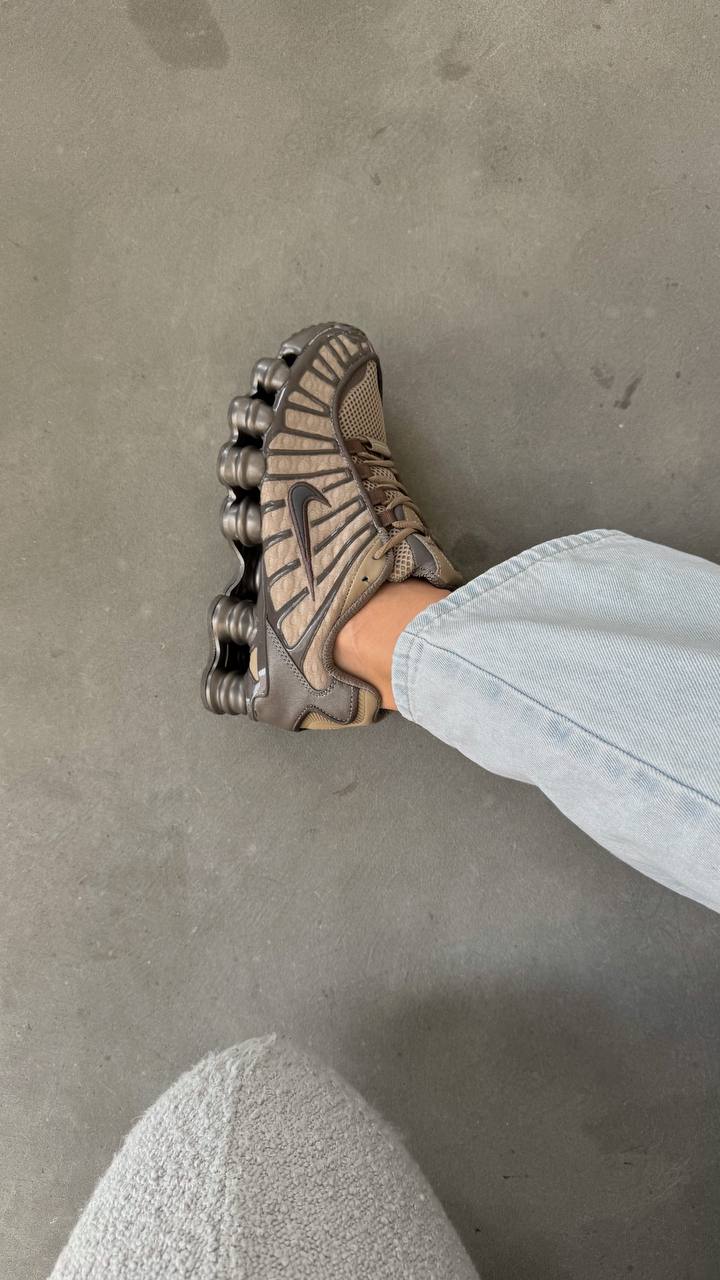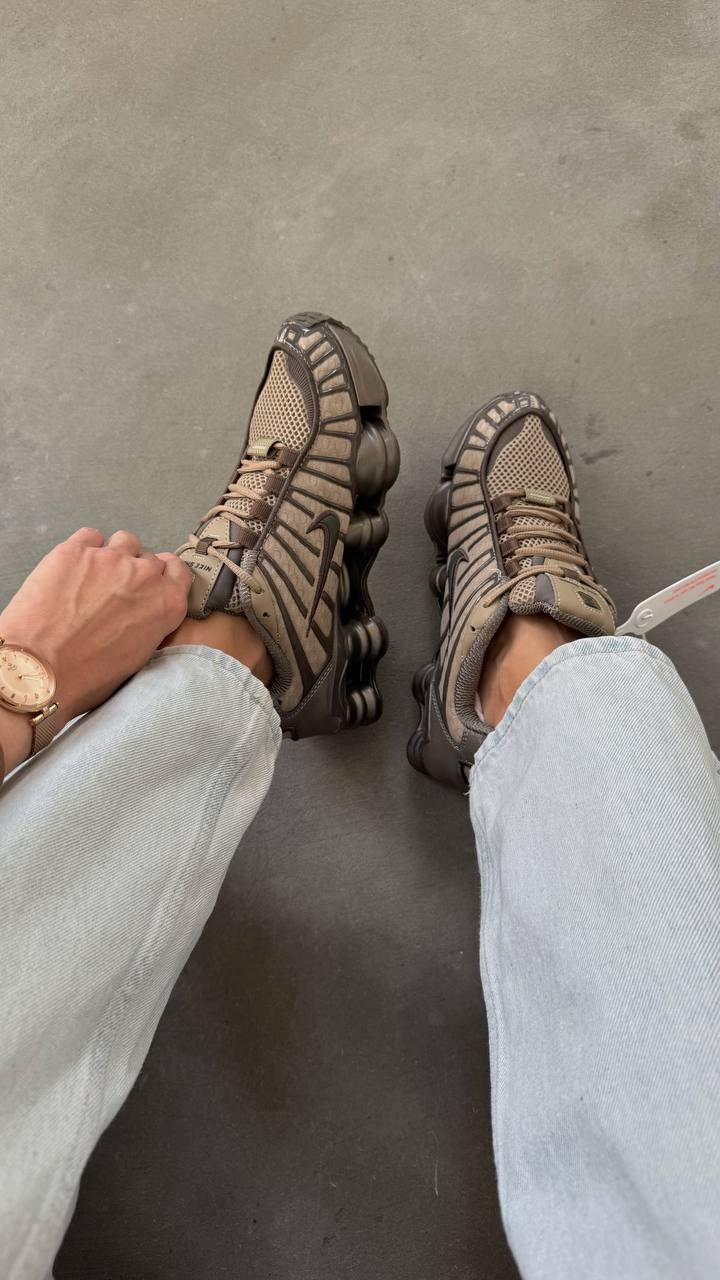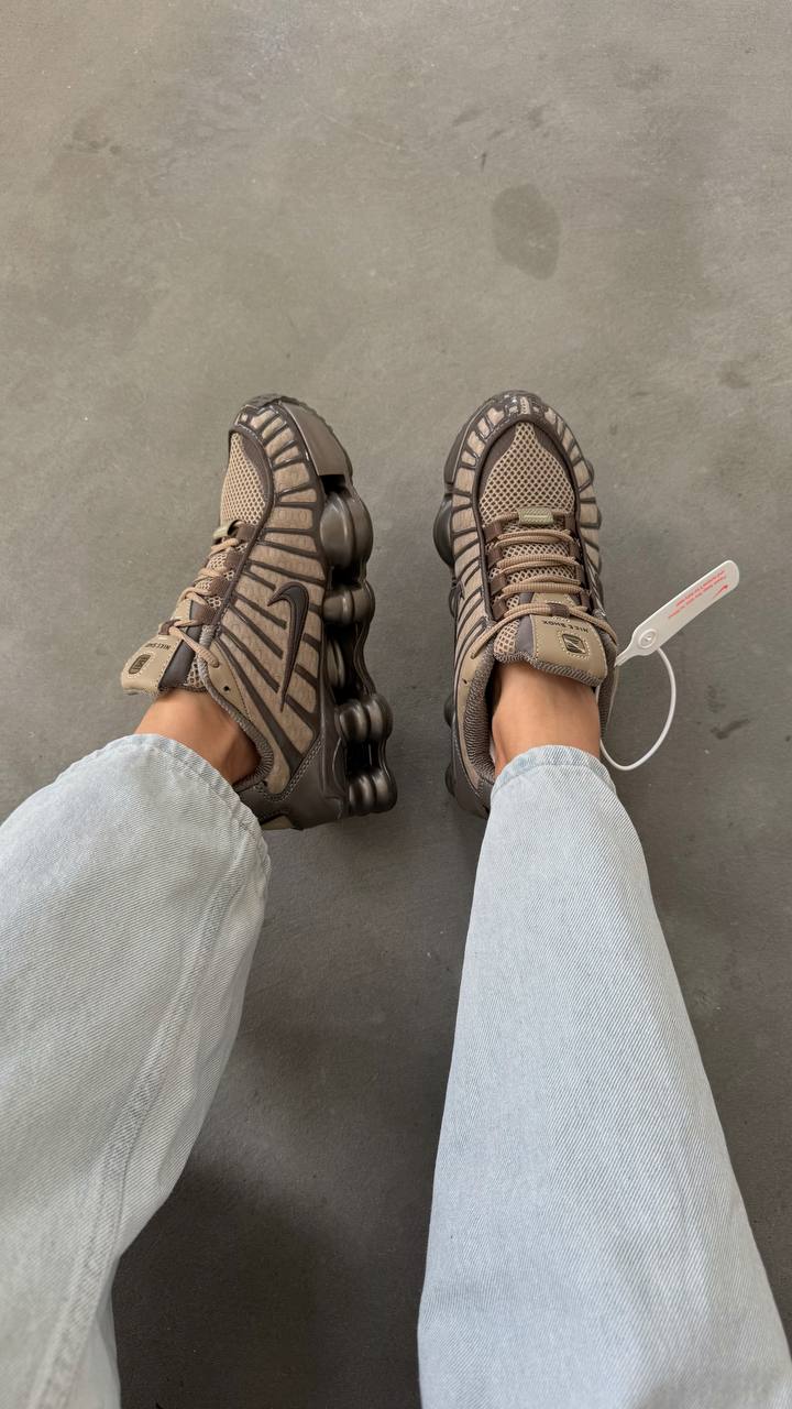 Nike Shox TL Khaki — виразна модель у відтінку хакі з характерним пружинним дизайном підошви, що поєднує спортивний стиль і футуристичний вигляд.