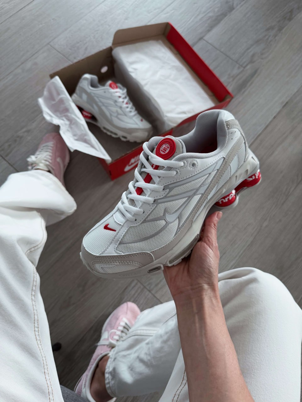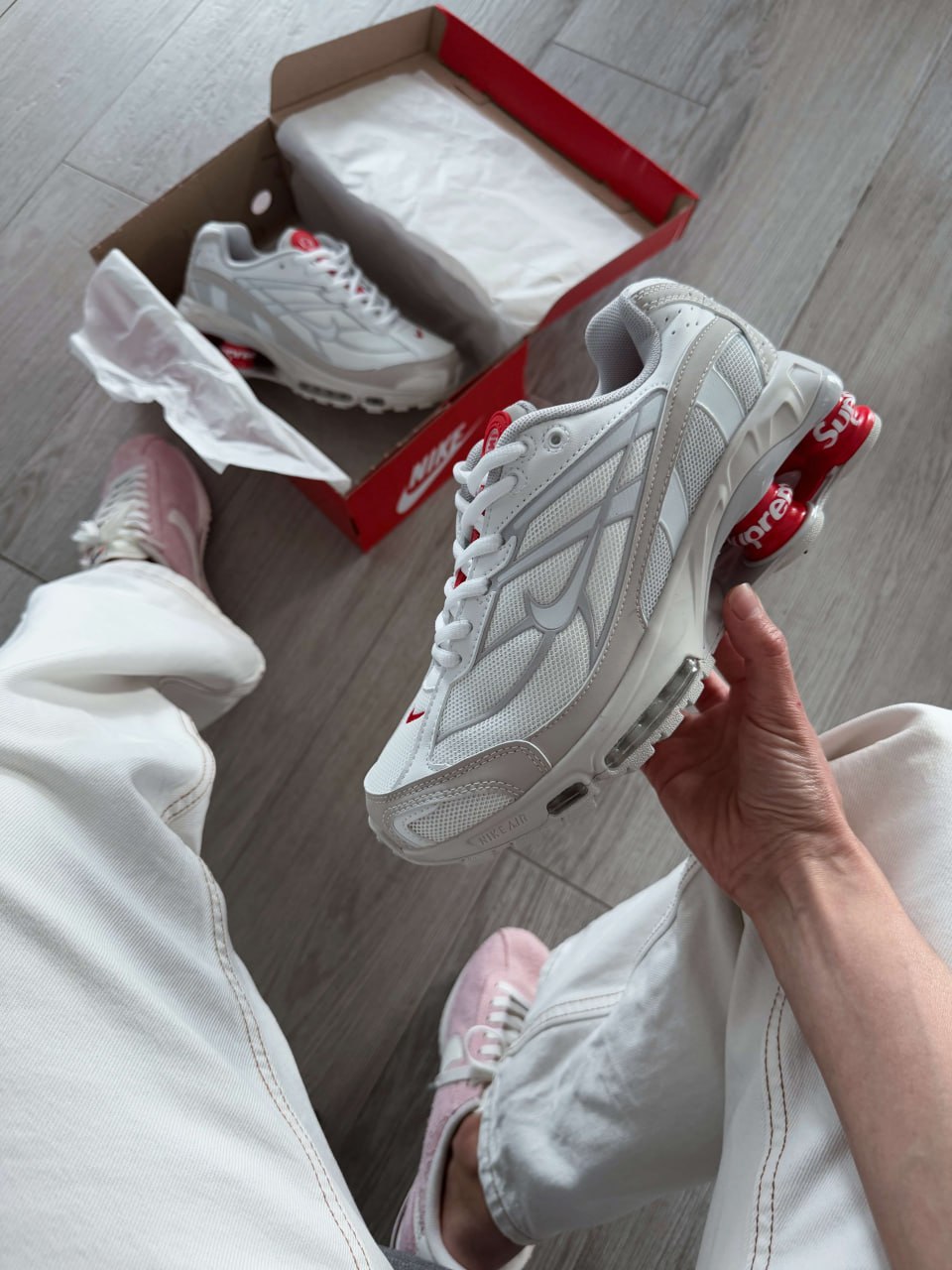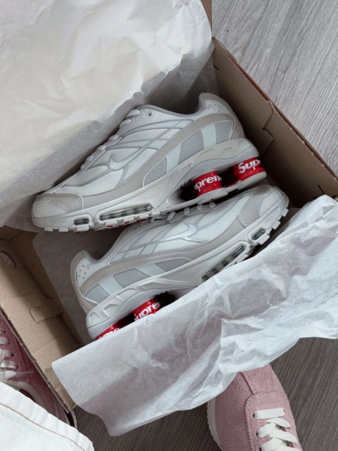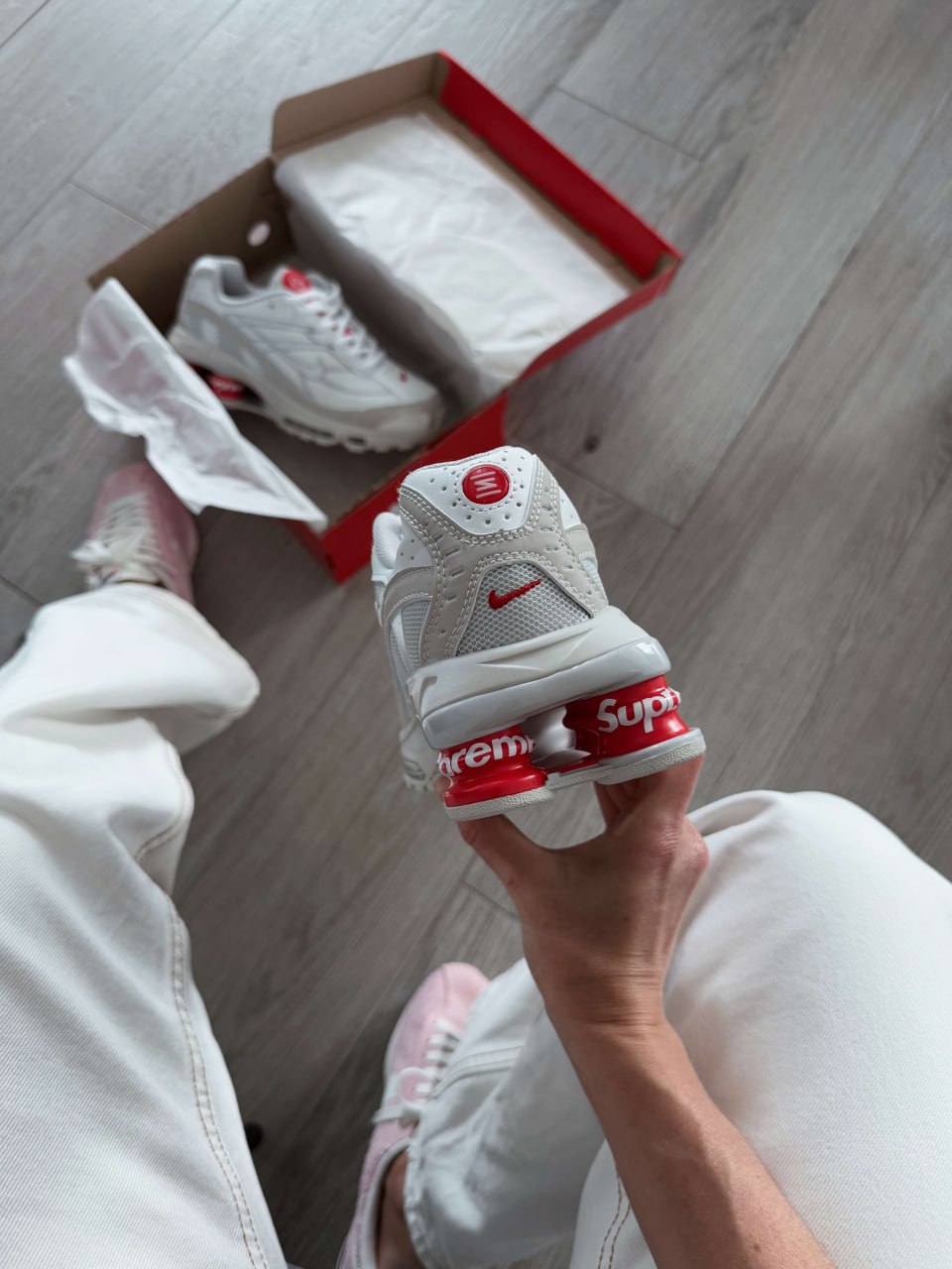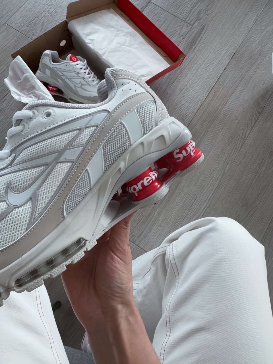 Nike Supreme x Shox Ride 2 ‘White’ — це поєднання технологічного дизайну й вуличної естетики. Кросівки вирізняються амортизаційною системою Shox, сітчастим верхом і фірмовими деталями Supreme.