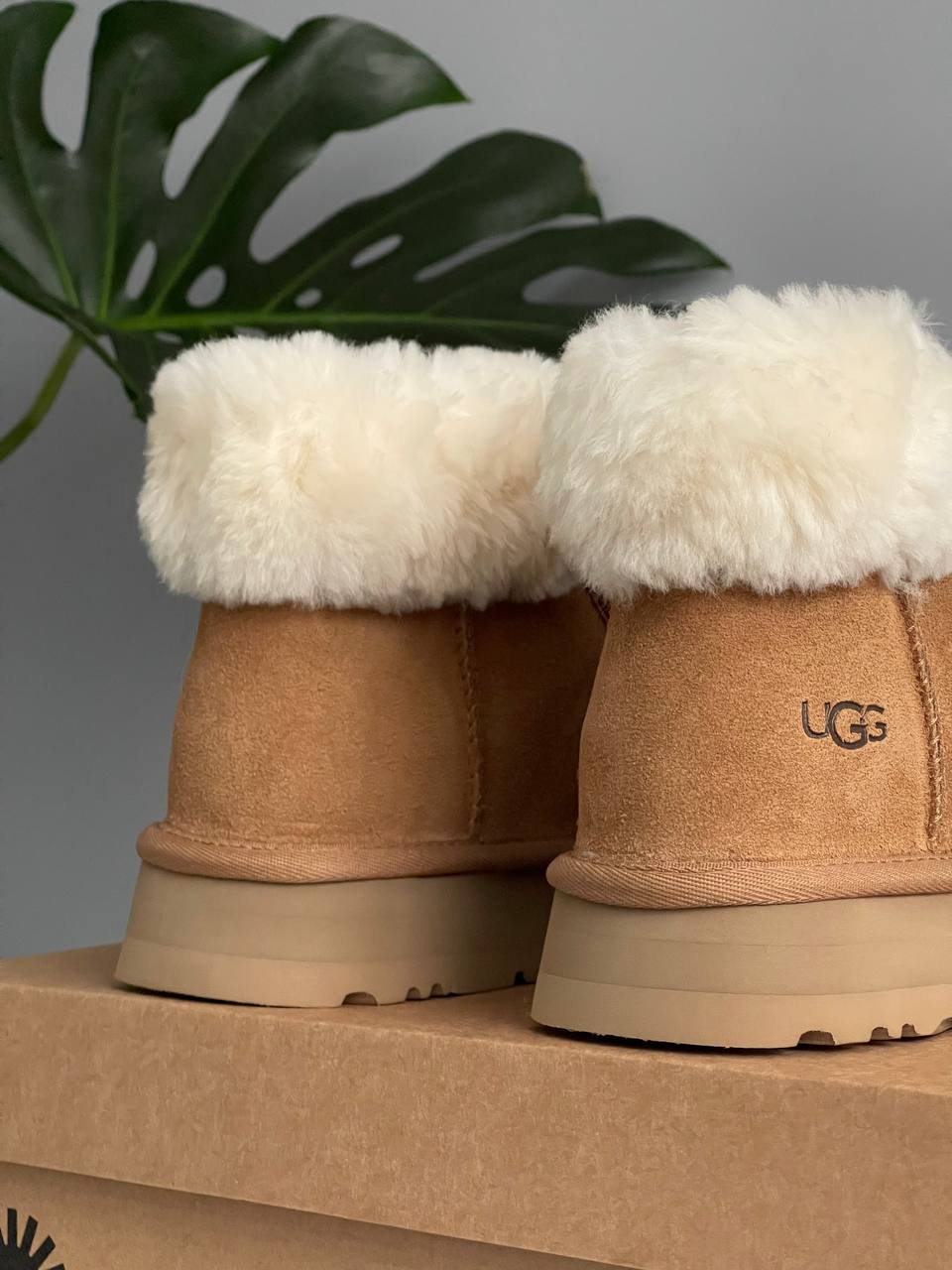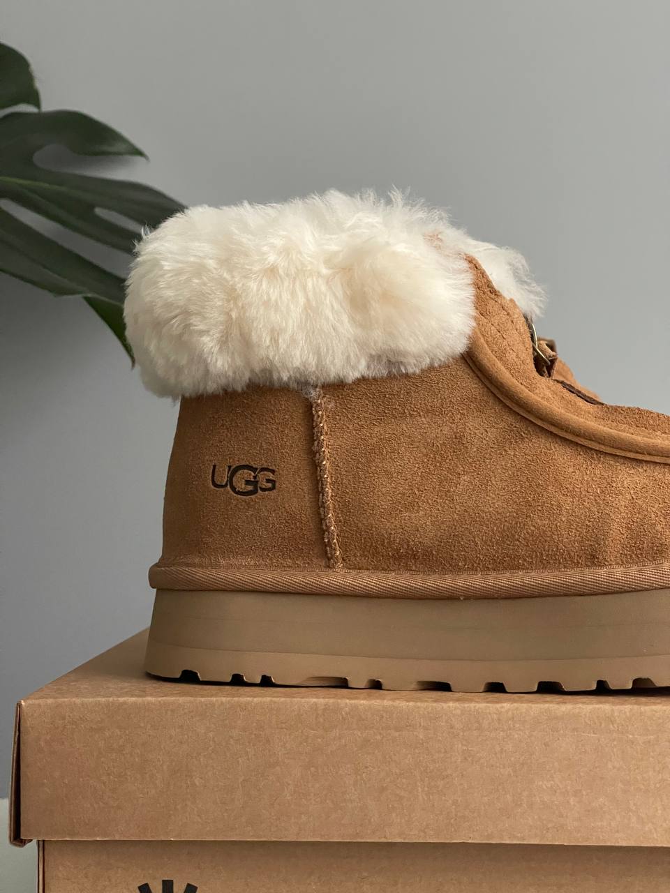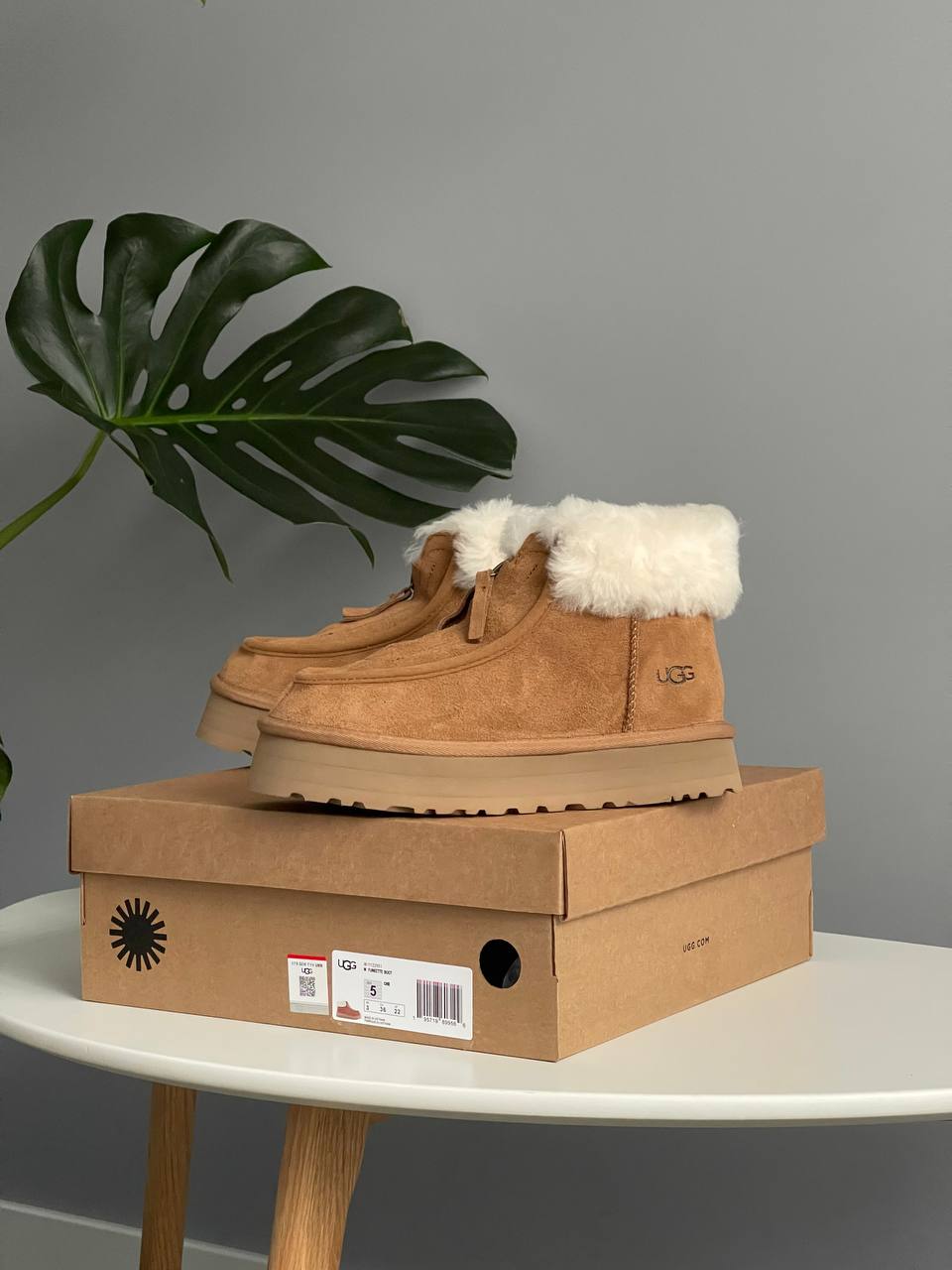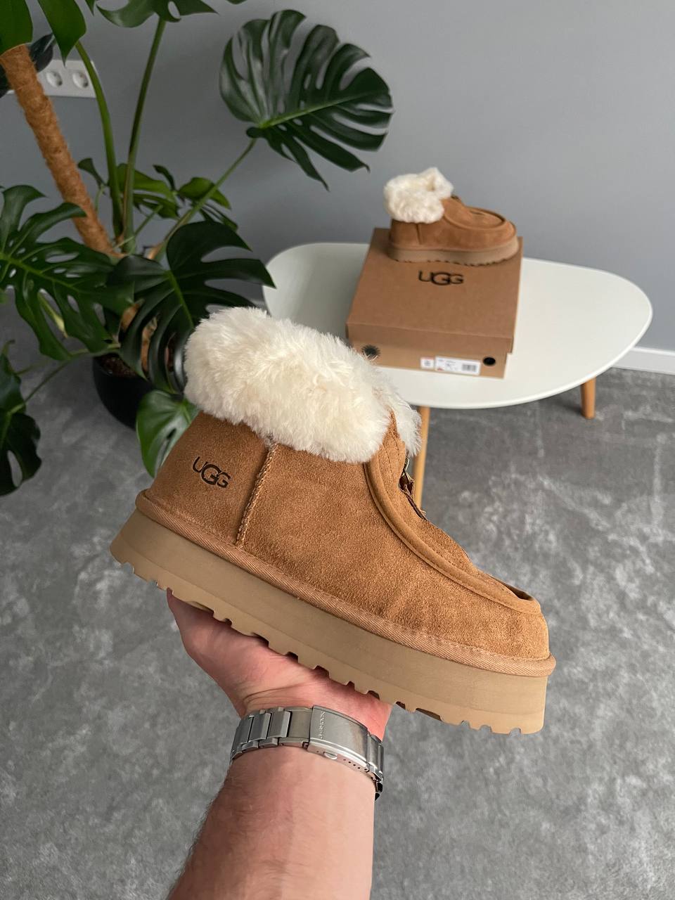 UGG Funkette Platform Chestnut — це зимова, стильна платформа-версія культового взуття бренду UGG, створена для поєднання комфорту, тепла та модного акценту.