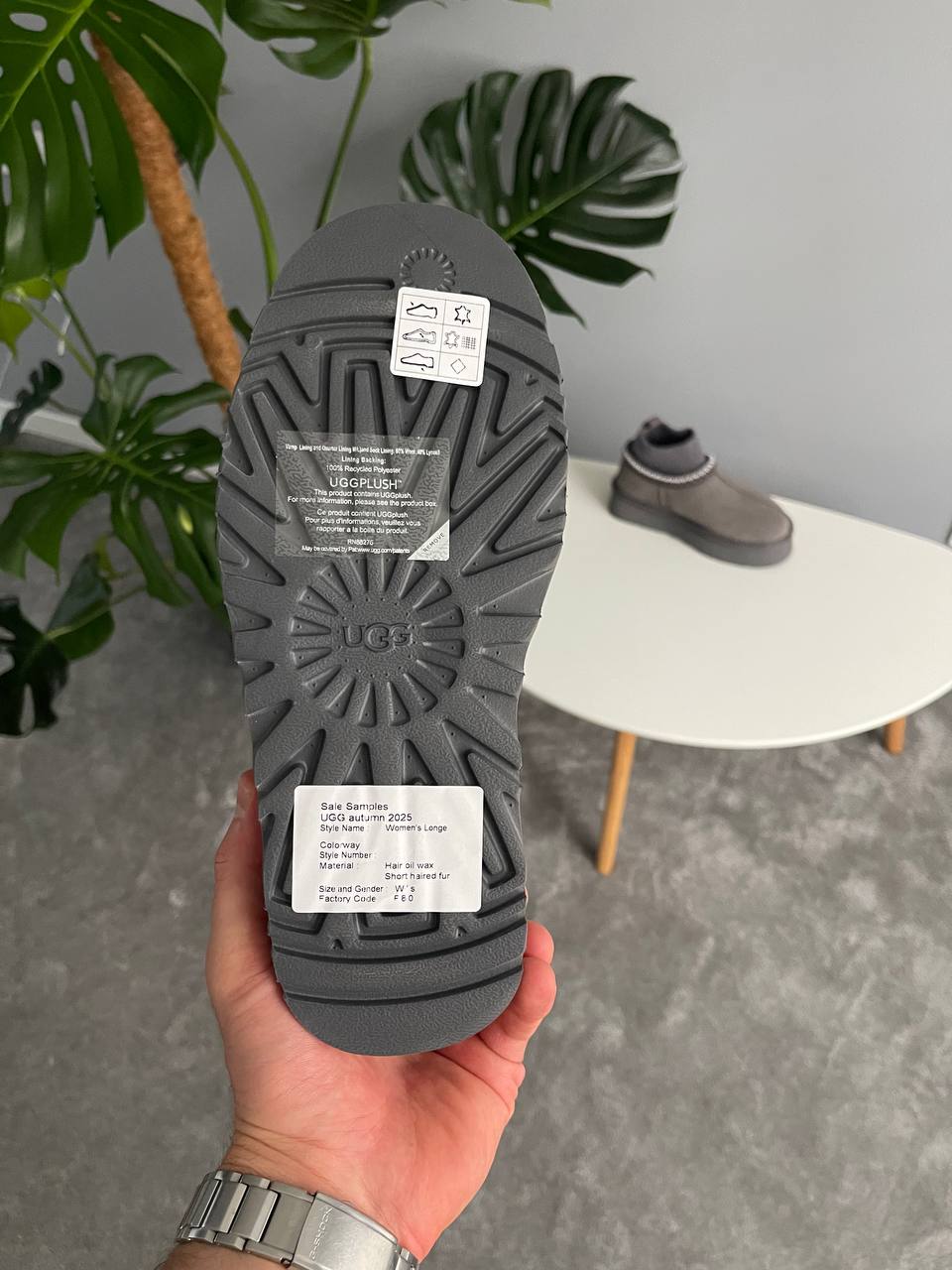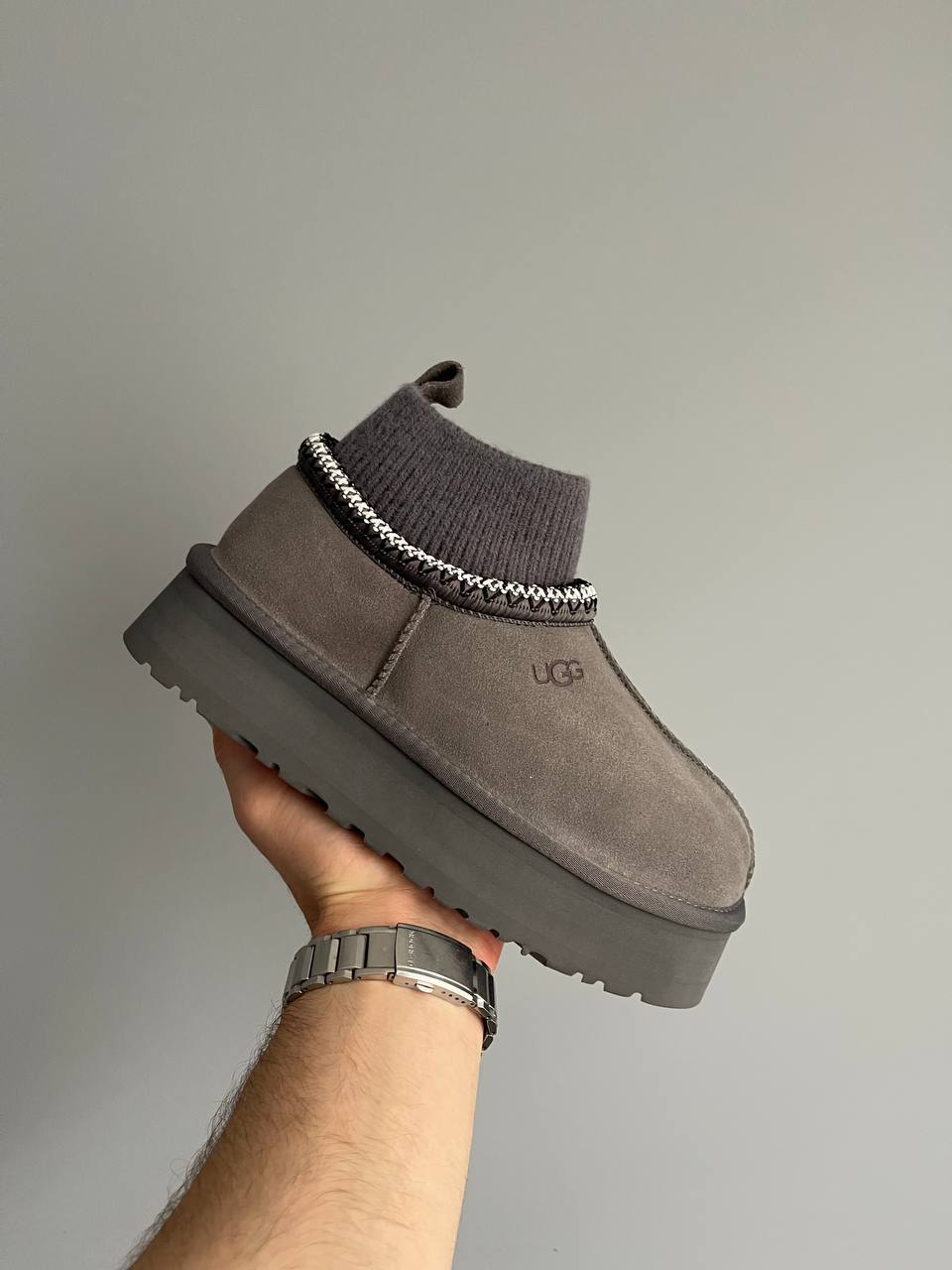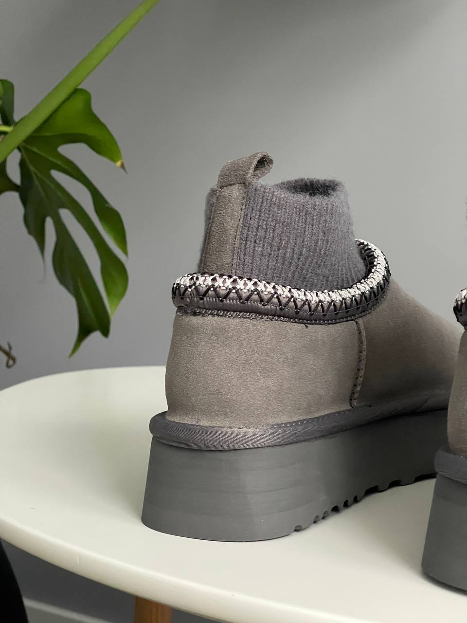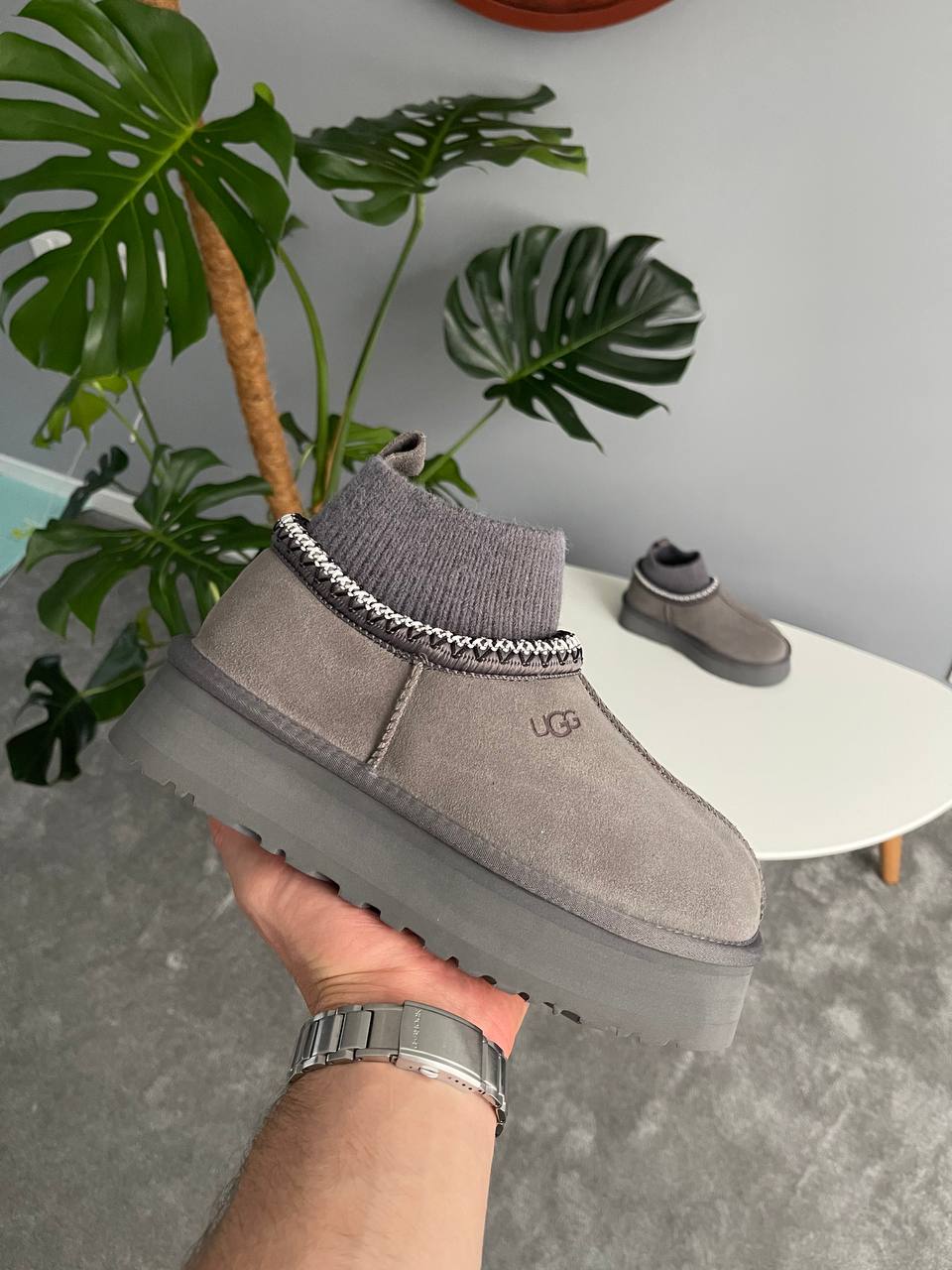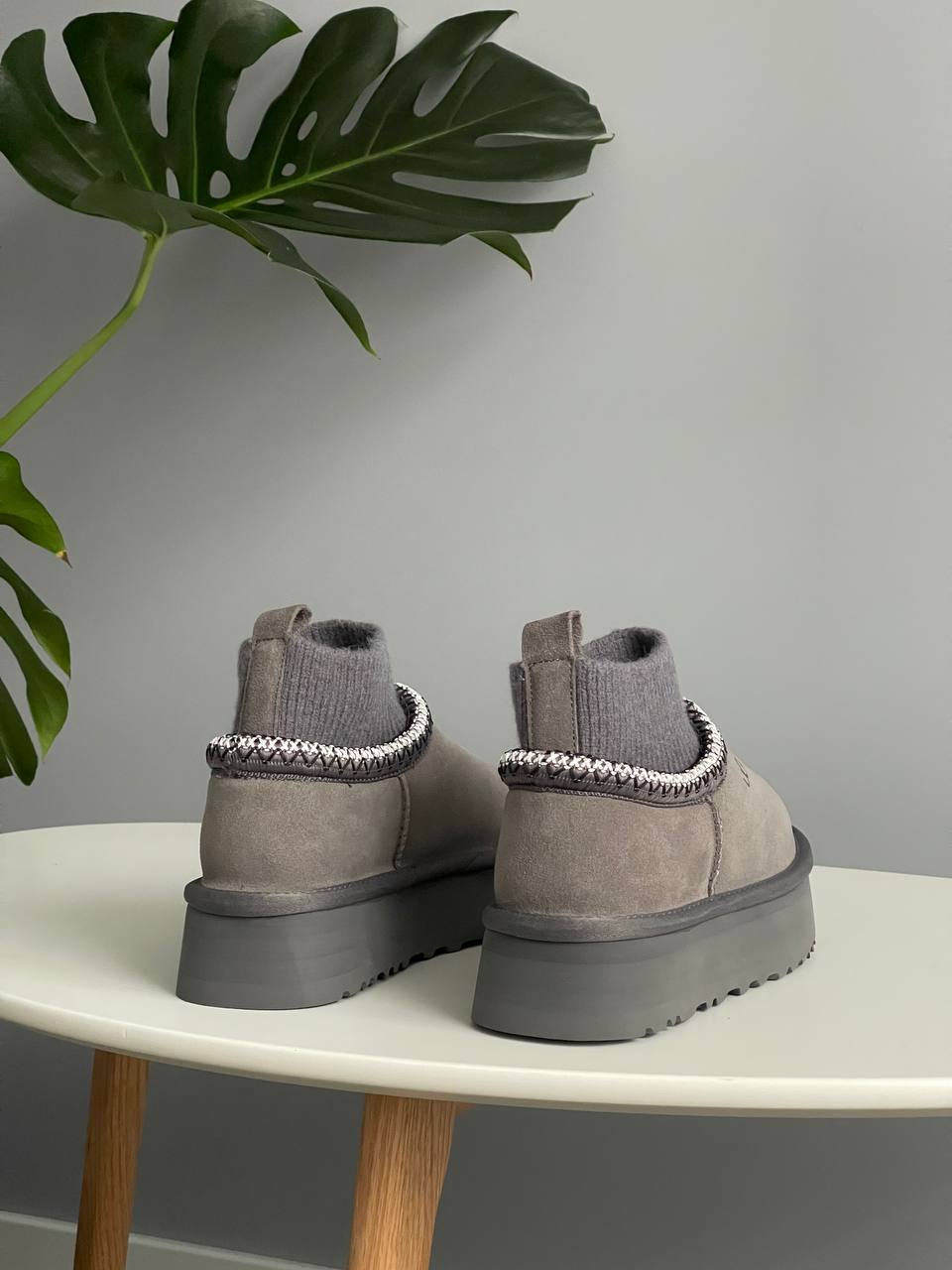 Ugg Tasman Platform Sock Grey — стильна модель у сірому відтінку із замшевим верхом і піднятою платформою, що поєднує комфорт і сучасний вигляд.
