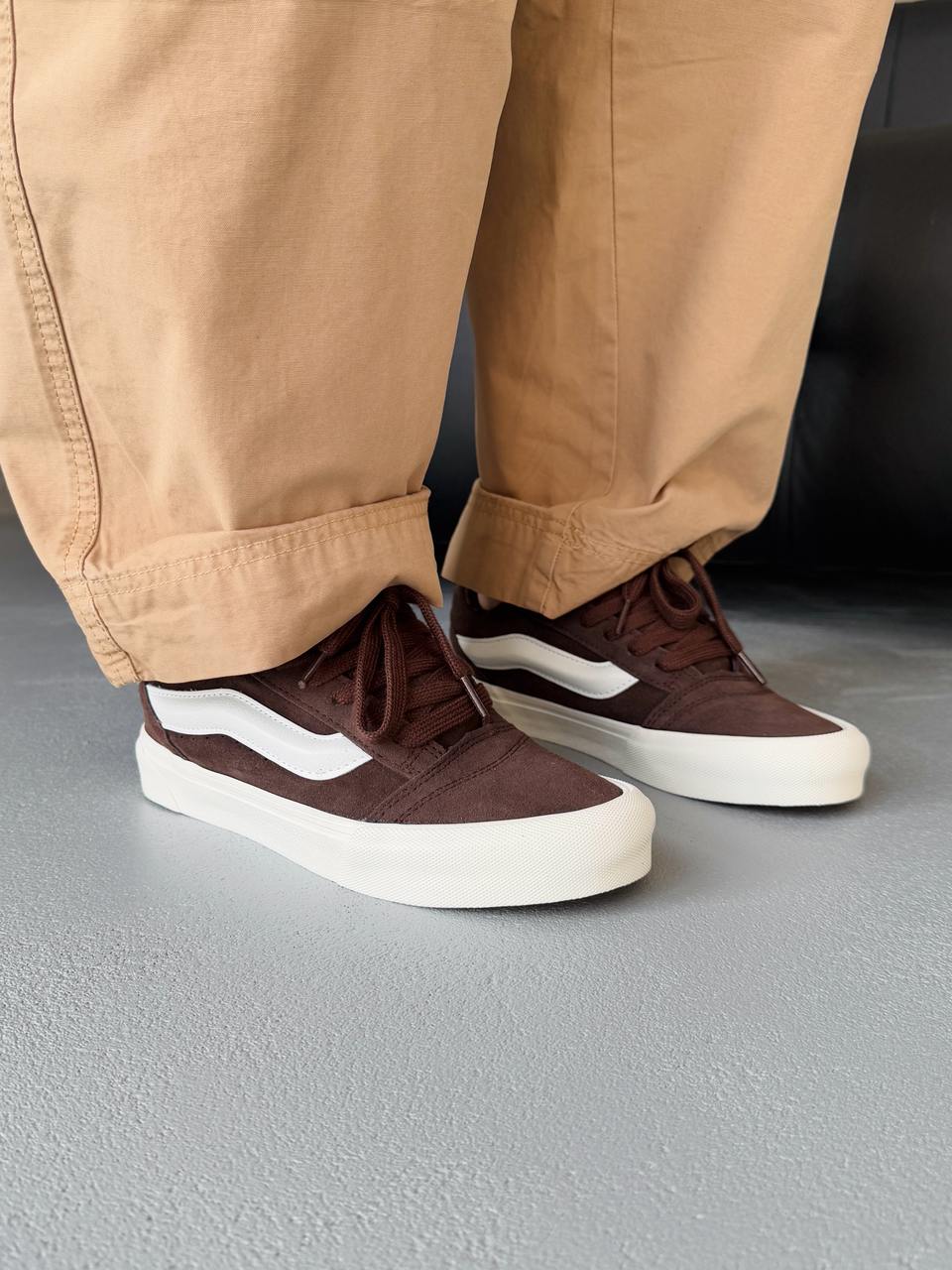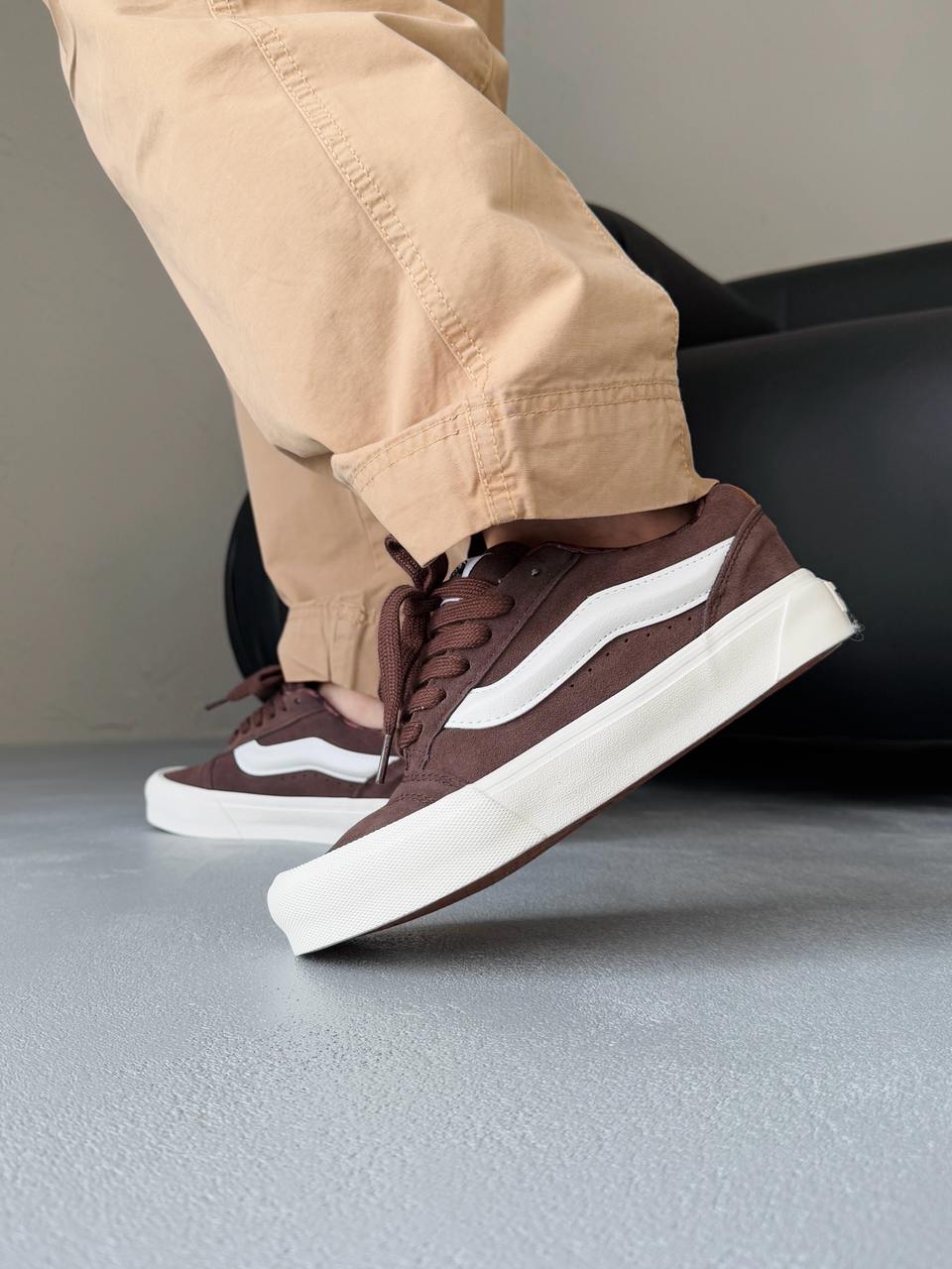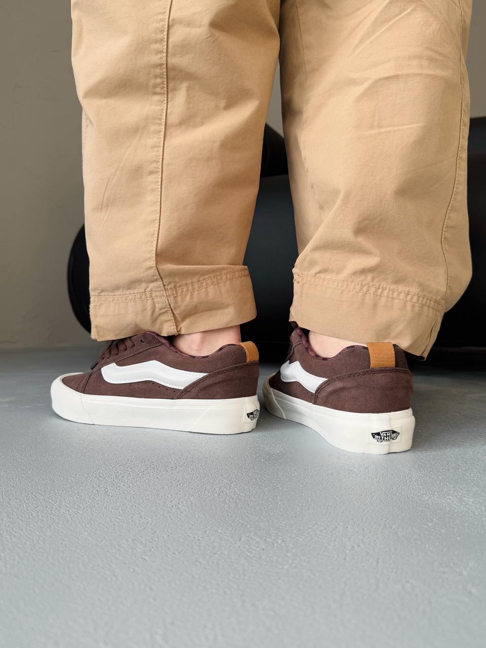 Vans KNU Brown — це сміливе перевтілення класичного силуету в стилі 90-х. Масивний язичок, об’ємний комір і характерна бічна смуга створюють впізнаваний вигляд з акцентом на ностальгію.