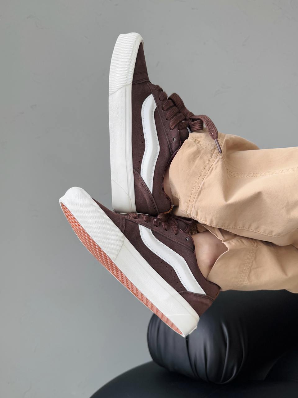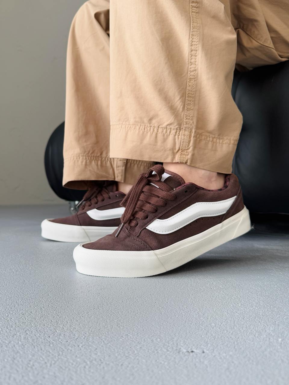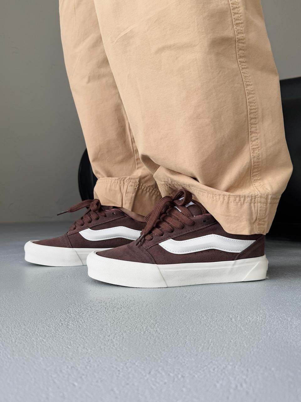 Vans KNU Brown — це сміливе перевтілення класичного силуету в стилі 90-х. Масивний язичок, об’ємний комір і характерна бічна смуга створюють впізнаваний вигляд з акцентом на ностальгію.